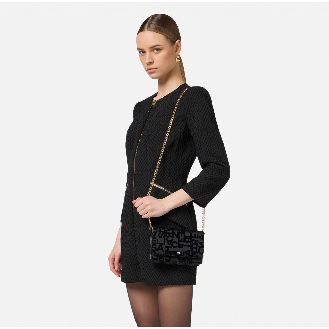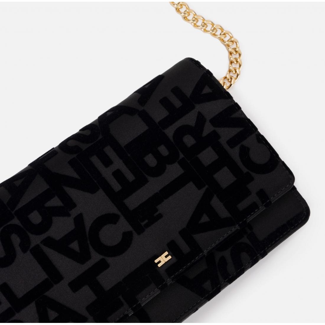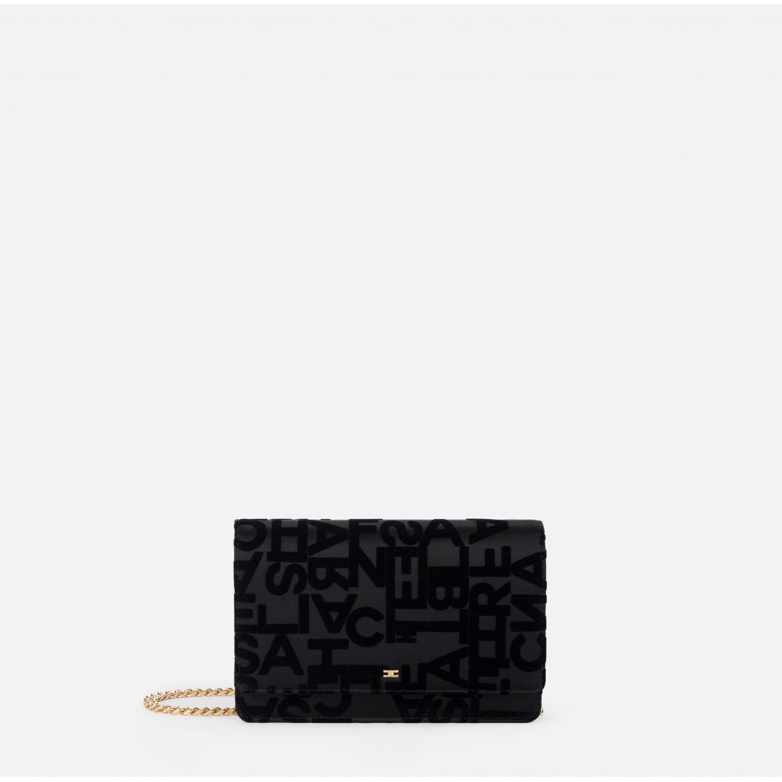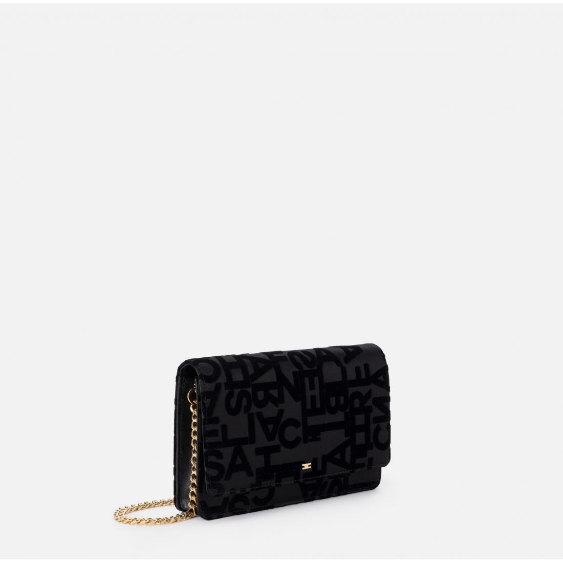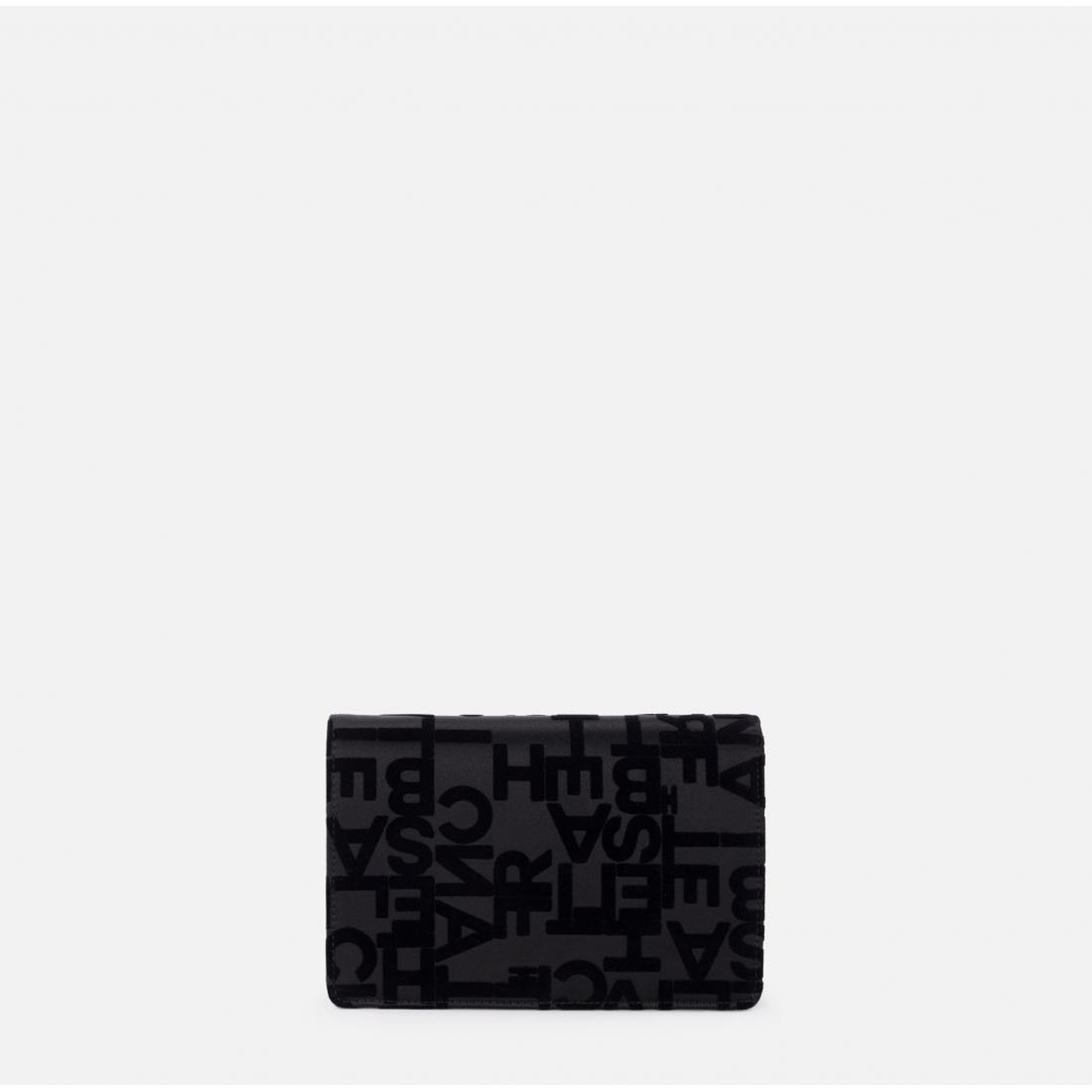 Borsa a tracolla in raso con lettering flockato. È caratterizzata da chiusura a patta e tracolla groumette in metallo dorato. Tracolla in metallo dorato, Dimensioni: 19 x 14 x 4 cm. Composizione articolo, 59% Cotone 21% Poliammide 20% Poliestere.