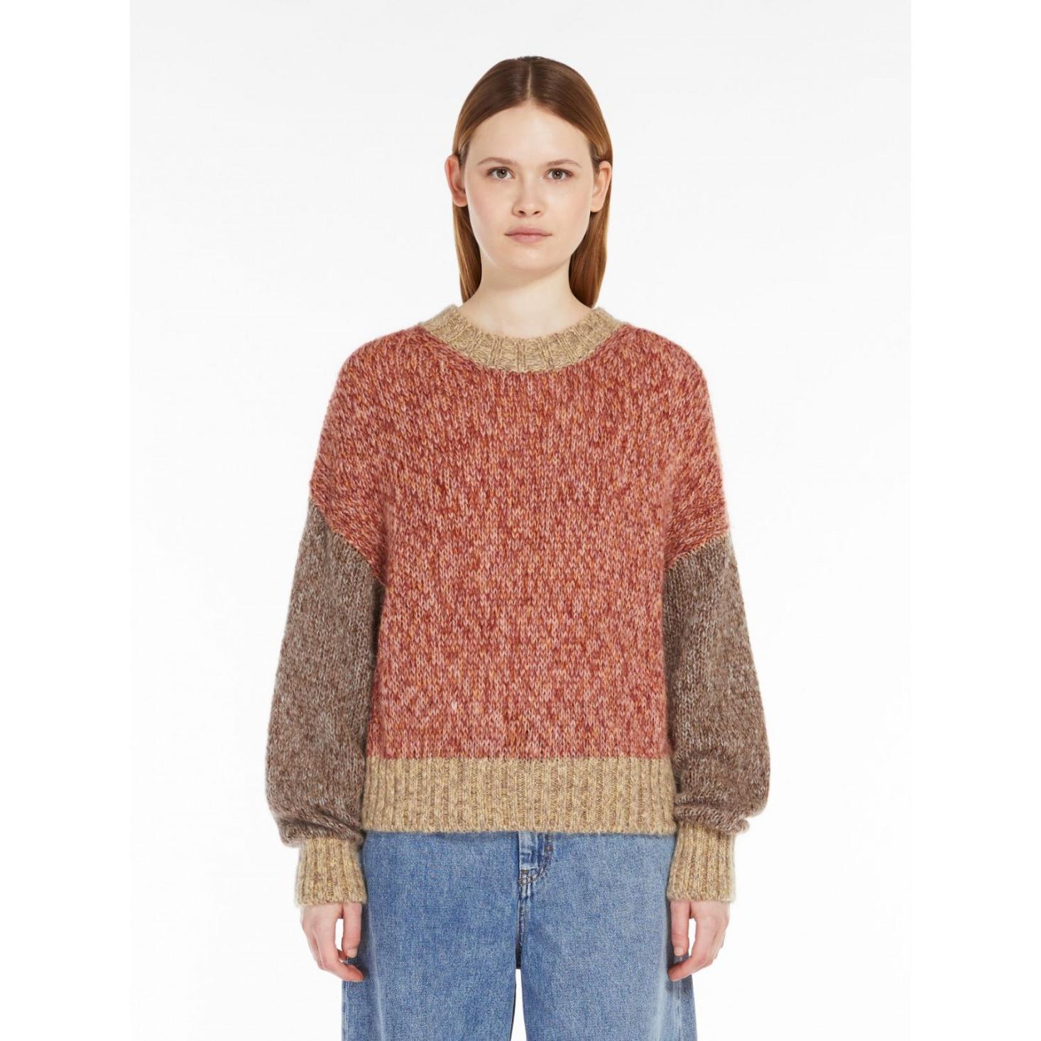 Maglia girocollo realizzata in prezioso filato mohair chiné, lavorato a punto rasato. Modello dalla vestibilità morbida, con maniche lunghe, spalla scesa e bordi a costine.