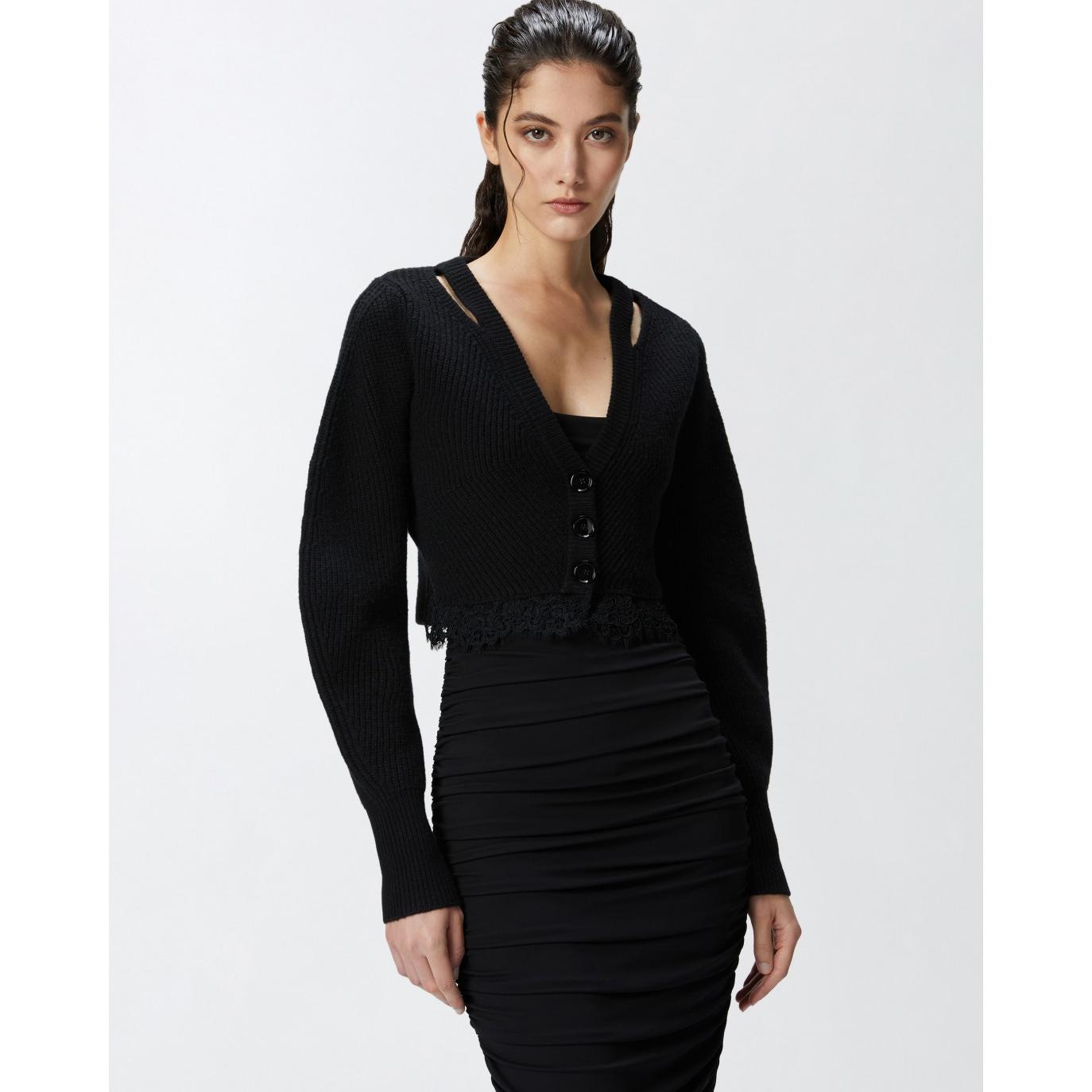 Cardigan dal taglio cropped in maglia di misto lana stretch caratterizzato da profondo scollo a V con dettaglio di cut-out e inserto a contrasto in pizzo a fondo capo davanti, per un tocco femminile. Il cardigan cropped è caratterizzato da maniche lunghe dal volume ampio con polsino al fondo e chiusura davanti con tre bottoni. Il cardigan è il completamento ideale per outfit da giorno dal sapore femminile e originale.