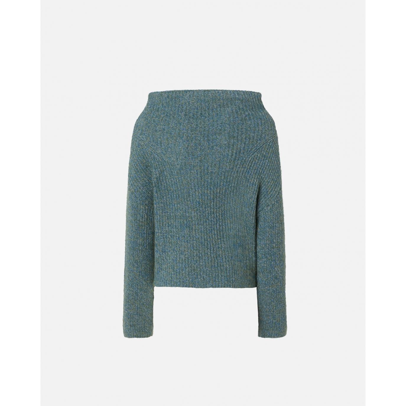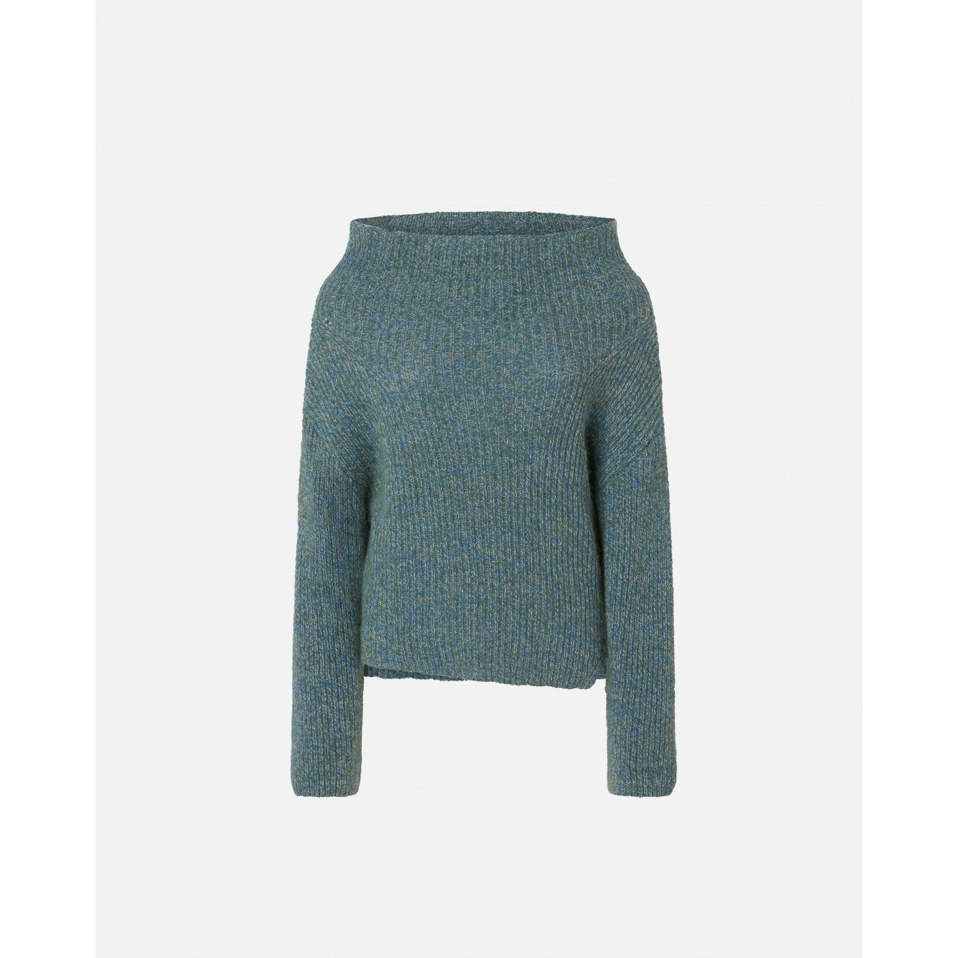 Maglione da donna realizzato in morbido filato moulinè di misto lana e alpaca, dove il filato ritorto crea un particolare effetto multicolore. Il maglione è caratterizzato da scollo a barchetta leggermente sciallato, maniche lunghe e fondo capo con spacco laterale che crea un effetto asimmetrico sul bordo. Il maglione è casual e al contempo femminile, grazie alla linea che lascia leggermente scoperto il collo.