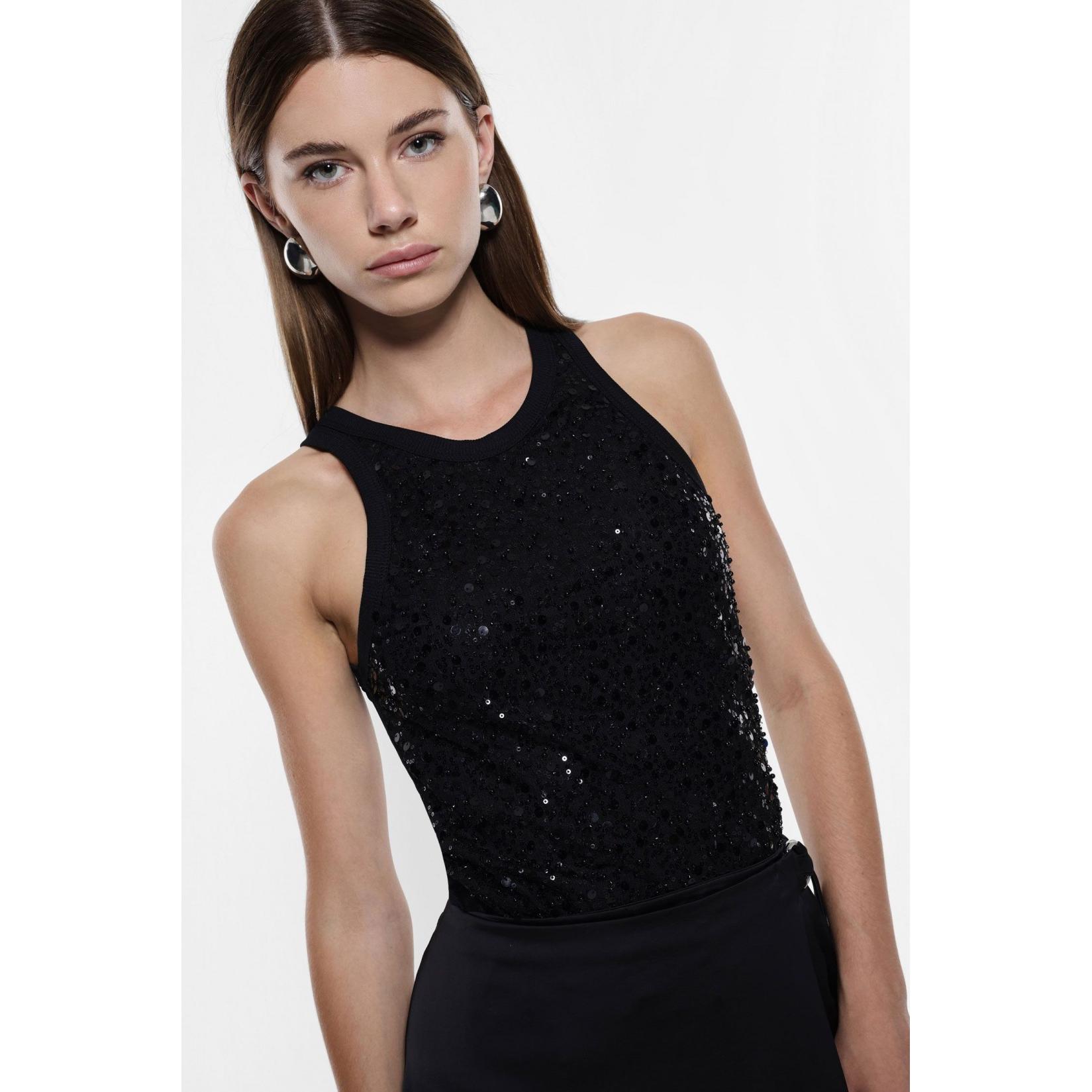 Fascino e raffinatezza si fondono in questo top senza maniche con una delicata scollatura rotonda. Impreziosito da paillettes luccicanti, aggiunge un tocco glamour al tuo guardaroba quotidiano, rendendolo perfetto per le occasioni più speciali o per illuminare una giornata ordinaria con la sua eleganza brillante.