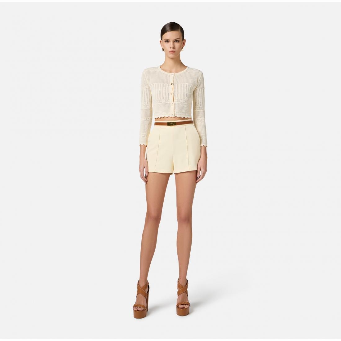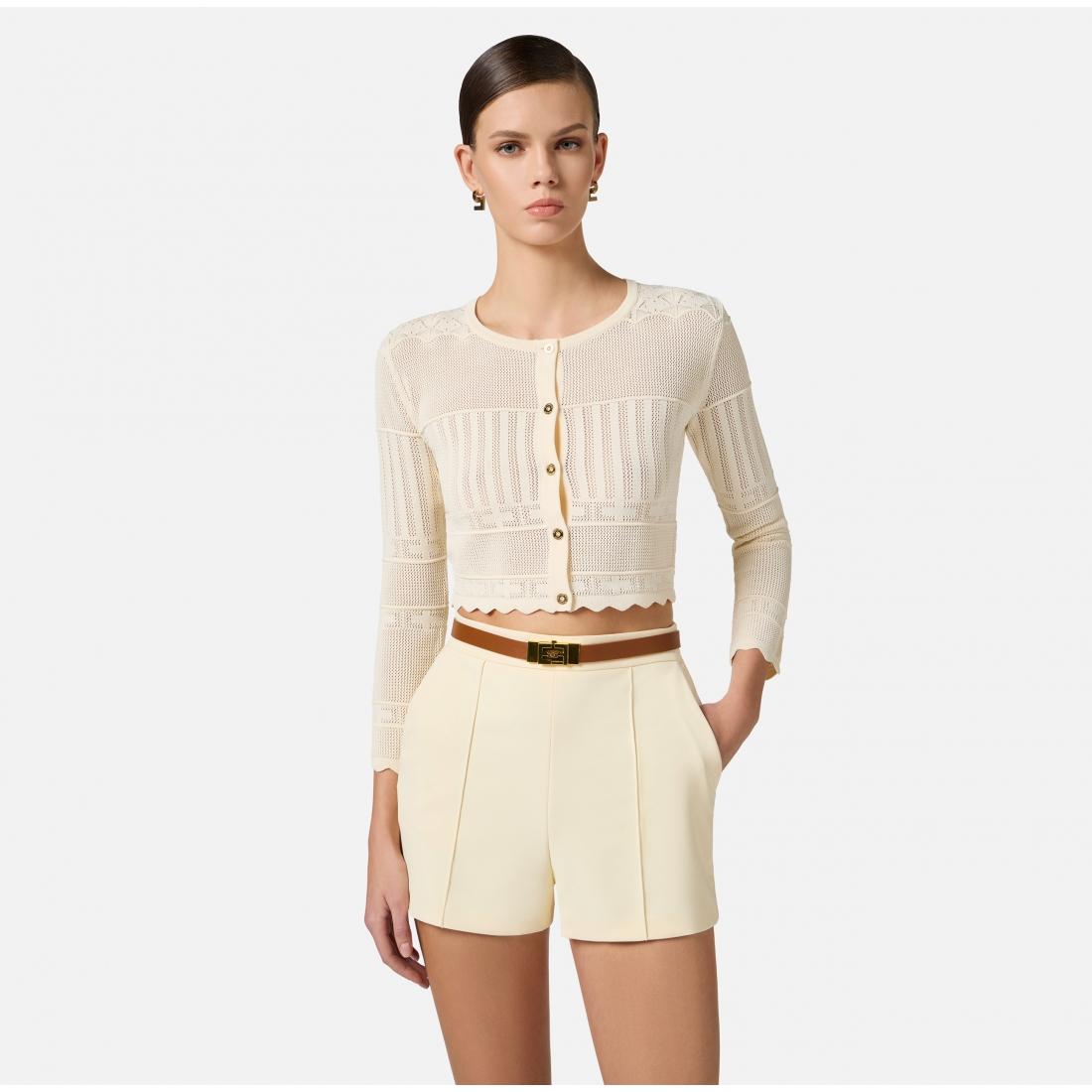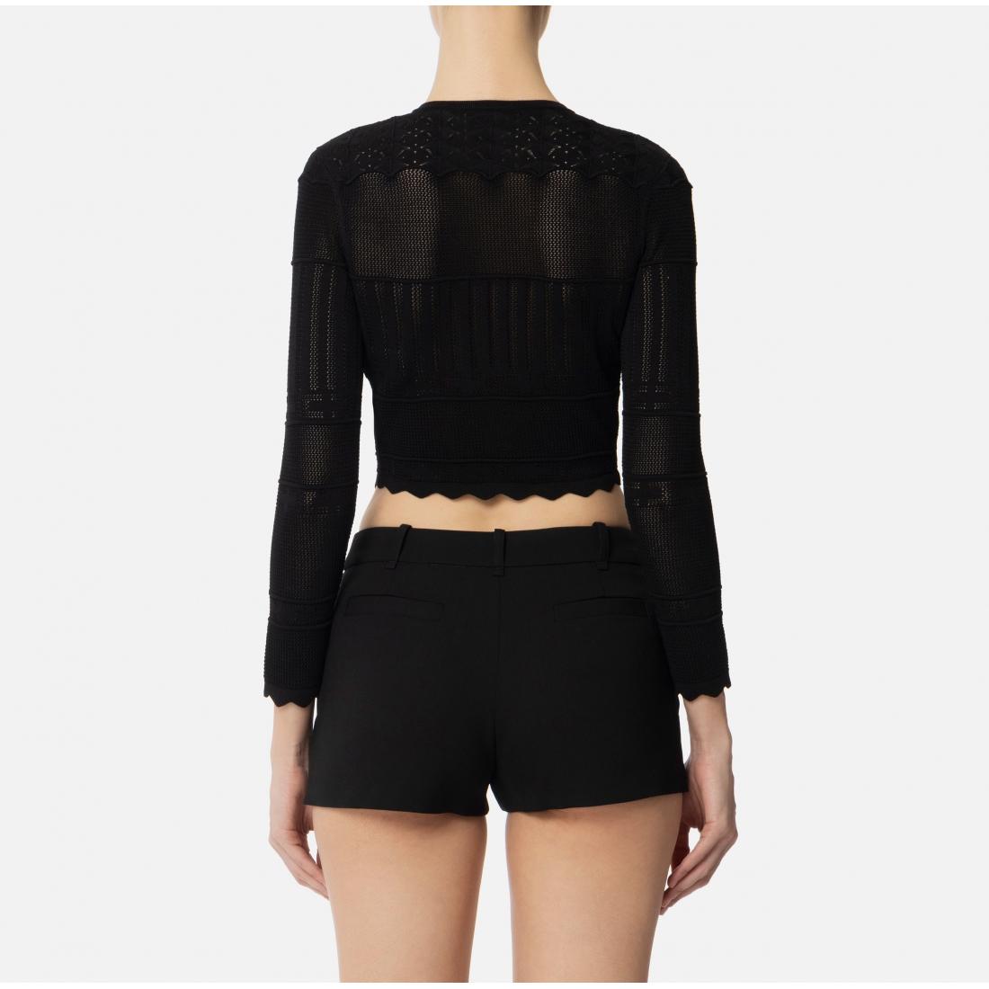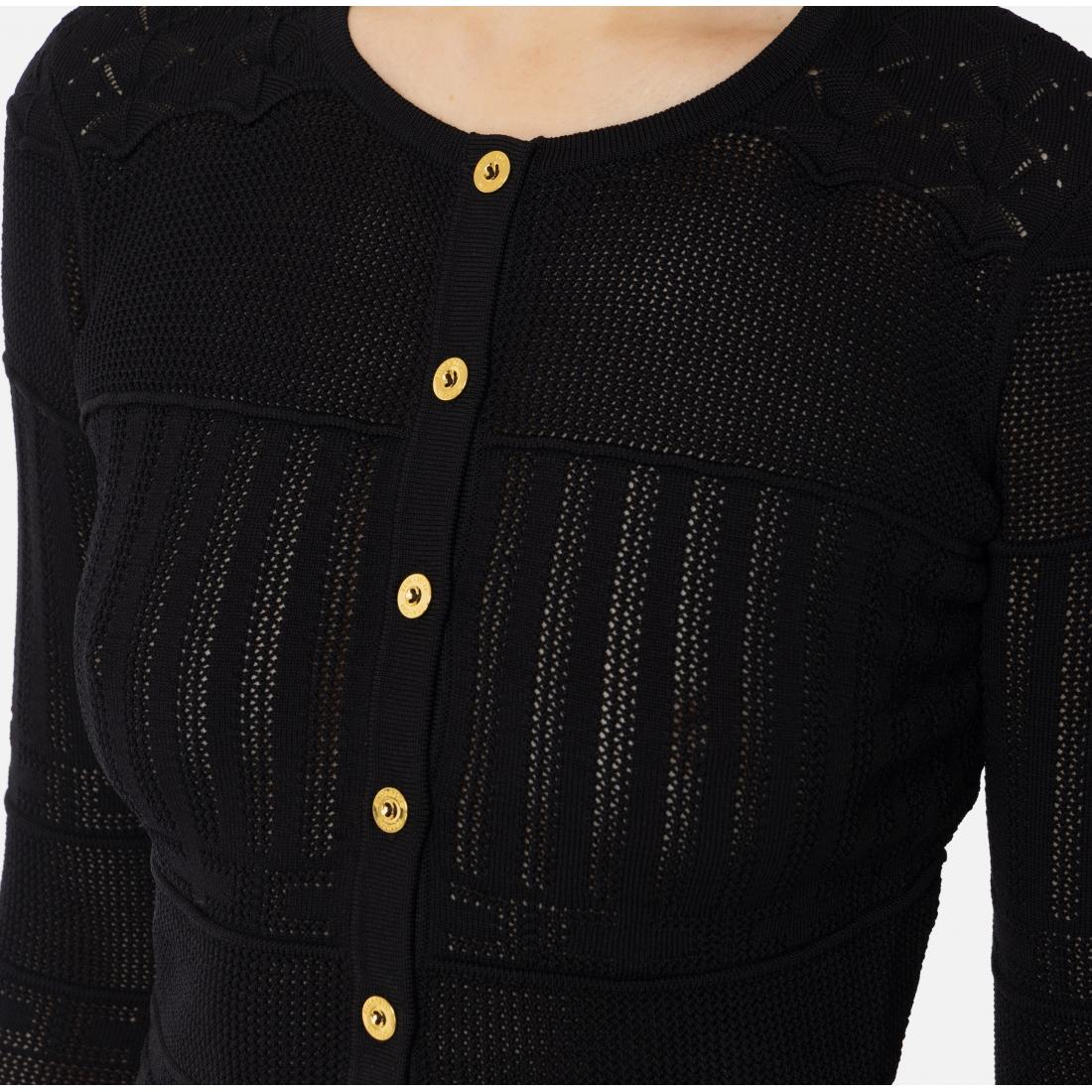 Cardigan in maglia con maniche ¾. L'elaborata traforatura è realizzata a punto pizzo e alterna logomania e disegni geometrici a bande su tutta la lunghezza. Chiusura con bottoni. Vestibilità aderente.