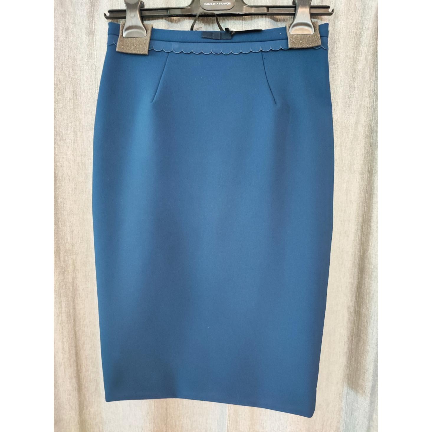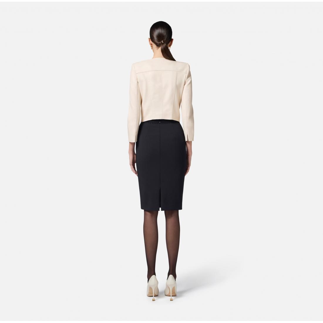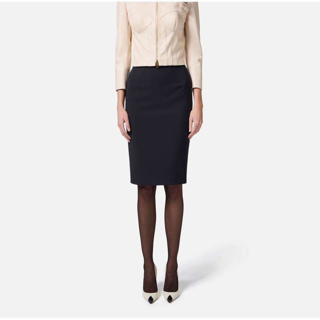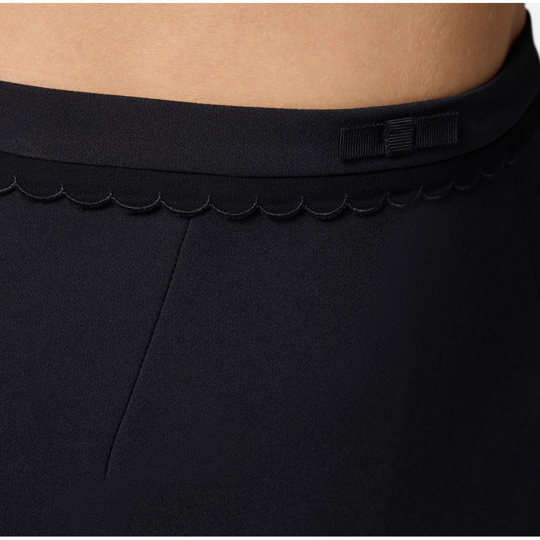 Gonna in doppio crêpe stretch con taglio longuette e spacco sul retro. Essenziale e sofisticata, è arricchita dal dettaglio del fiocco centrale posizionato sul fascione e dallo smerlo ricamato in vita. Vestibilità slim.