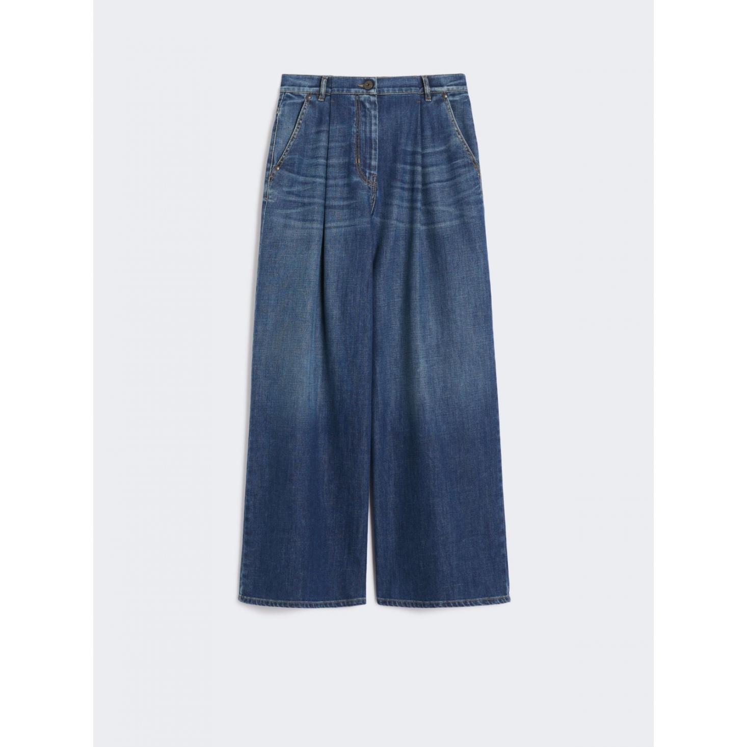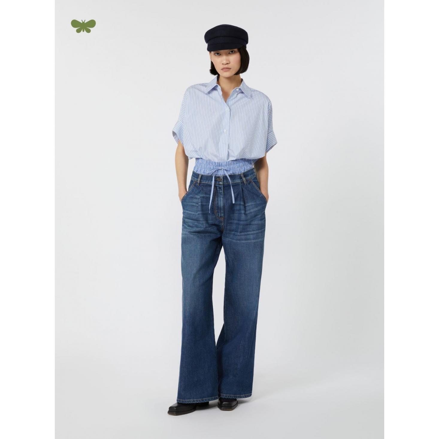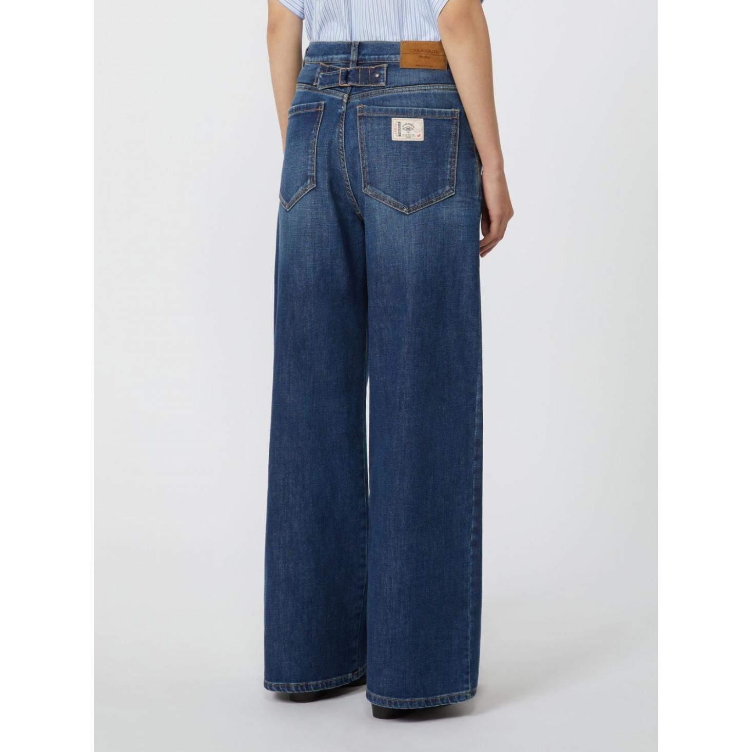 Tessuto principale con almeno il 50% di cotone proveniente da agricoltura biologica, Pantalone in denim comfort di cotone stretch, Vestibilità wide leg, Chiusura con zip coperta e bottone a chiodo, Tasche alla francese sui fianchi, Tasche a toppa sul retro, Baschina con cinturino regolabile in vita sul retro, Taglia e vestibilità, La modella veste la taglia 40 (IT) ed è alta 178 cm. Le sue misure sono: vita 64 cm e fianchi 88 cm.