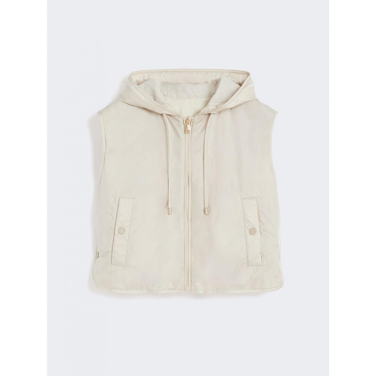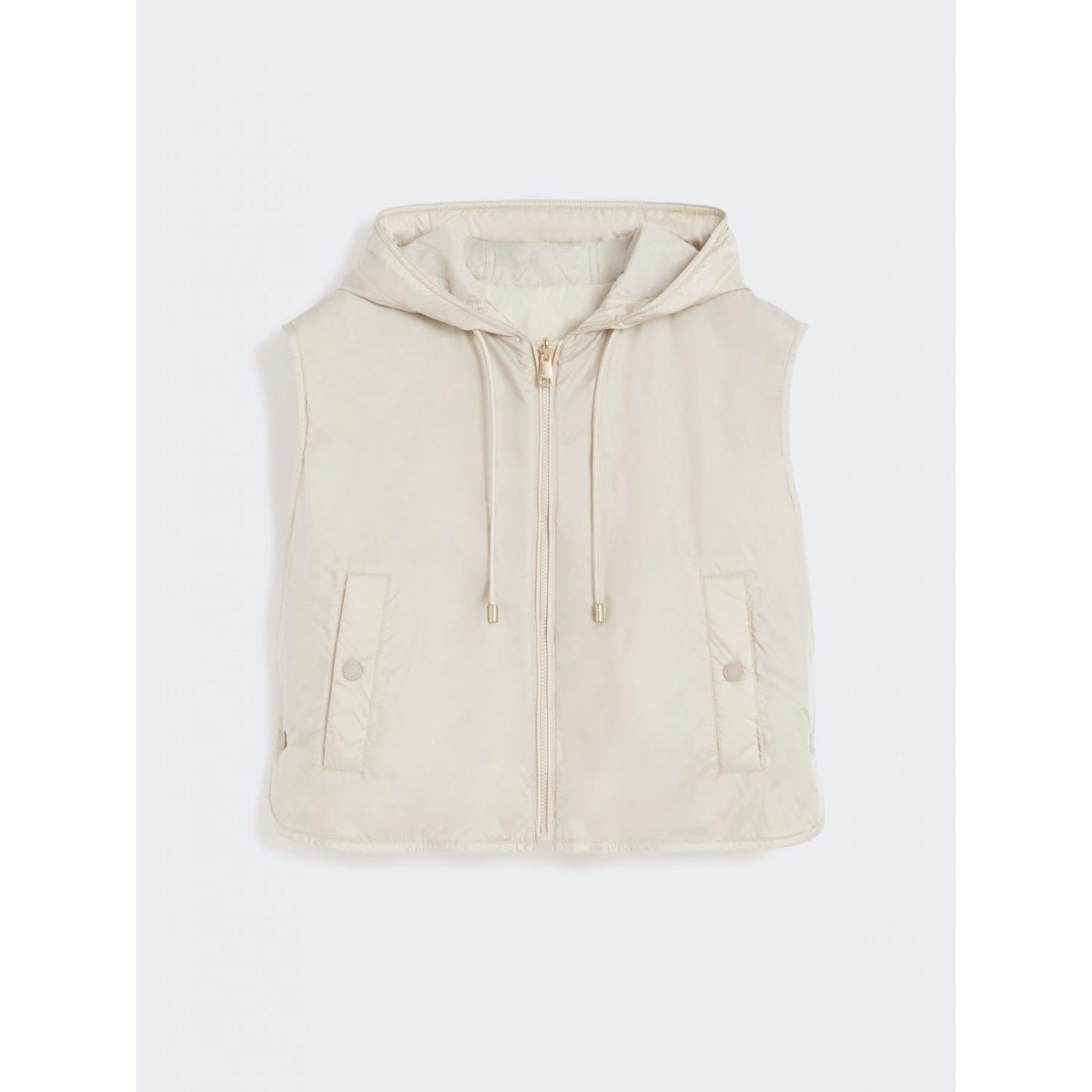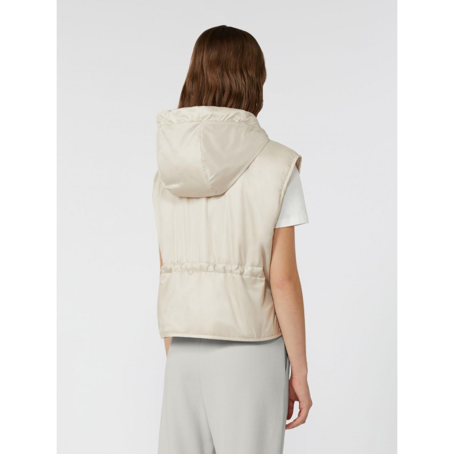 Gilet corto con cappuccio a coulisse, imbottito in Luxepad Ultra Fine Insulating Technology Camel-Silk Blend Edition.