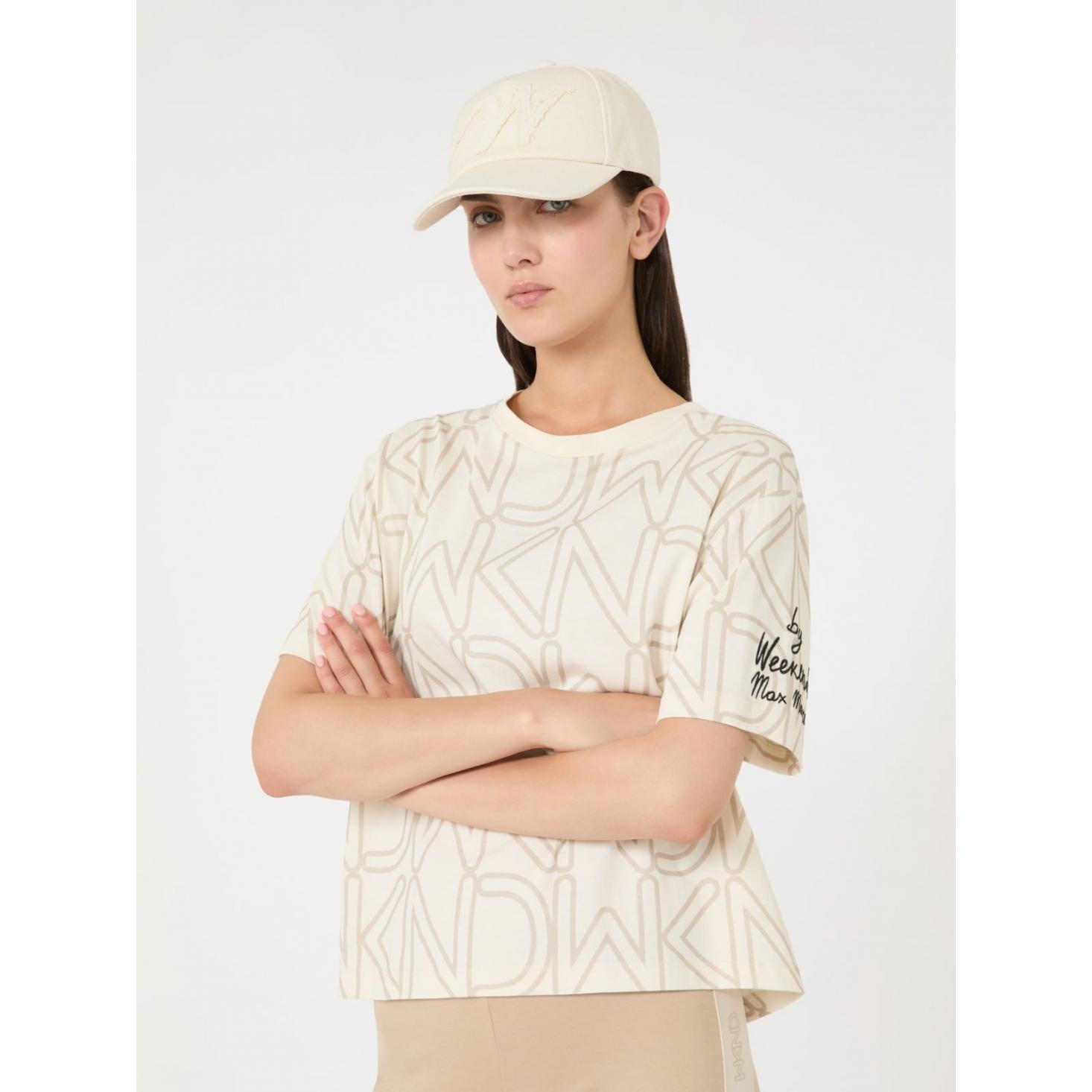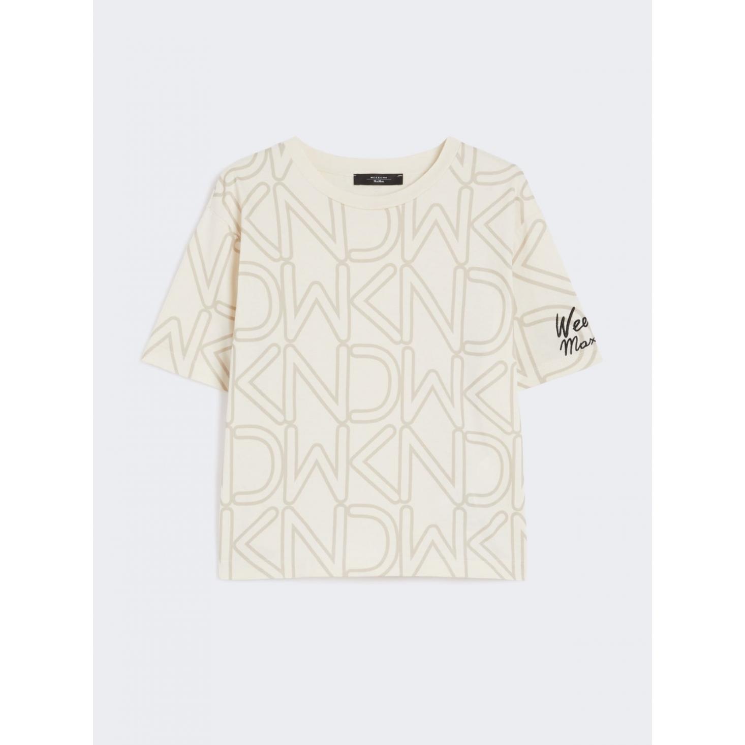 T-shirt basic personalizzata con motivo di stampa all over e ricamo sulla manica sinistra indossata.