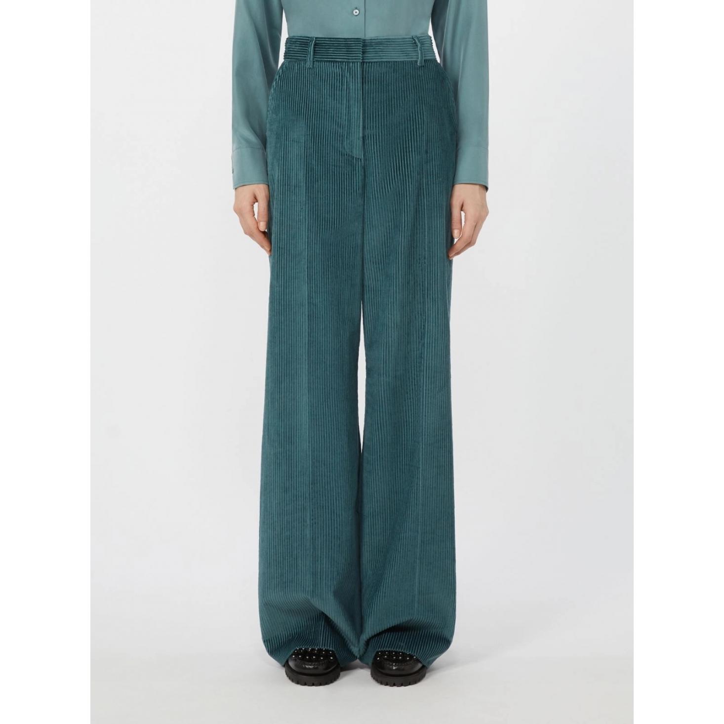 Pantalone in velluto di puro cotone 350 righe, Gamba larga, Chiusura con listino alto in vita, zip con patta e gancetto, Tasche alla francese sui fianchi, Tasche a filetto sul retro, Passanti per cintura e piega stirata, La modella veste la taglia 40 (IT) ed è alta 176 cm. Le sue misure sono: vita 60 cm e fianchi 88 cm.