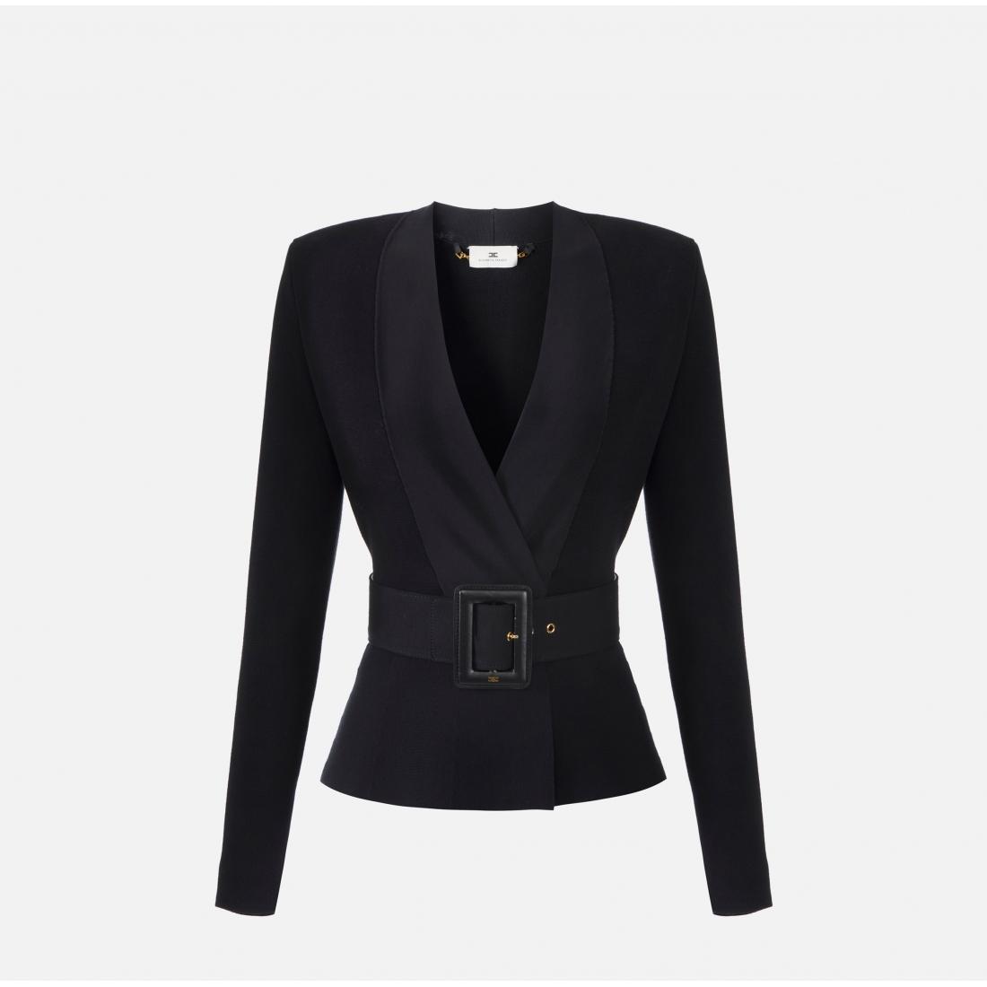 Giacca in maglia con lavorazione a punto stoffa. Il blazer ha spalle strutturate e si distingue per il rever realizzato in viscosa lucida che crea interessanti contrasti di texture. La cintura coordinata esalta la baschina al fondo capo, regalando una silhouette decisa e definita. Vestibilità slim.