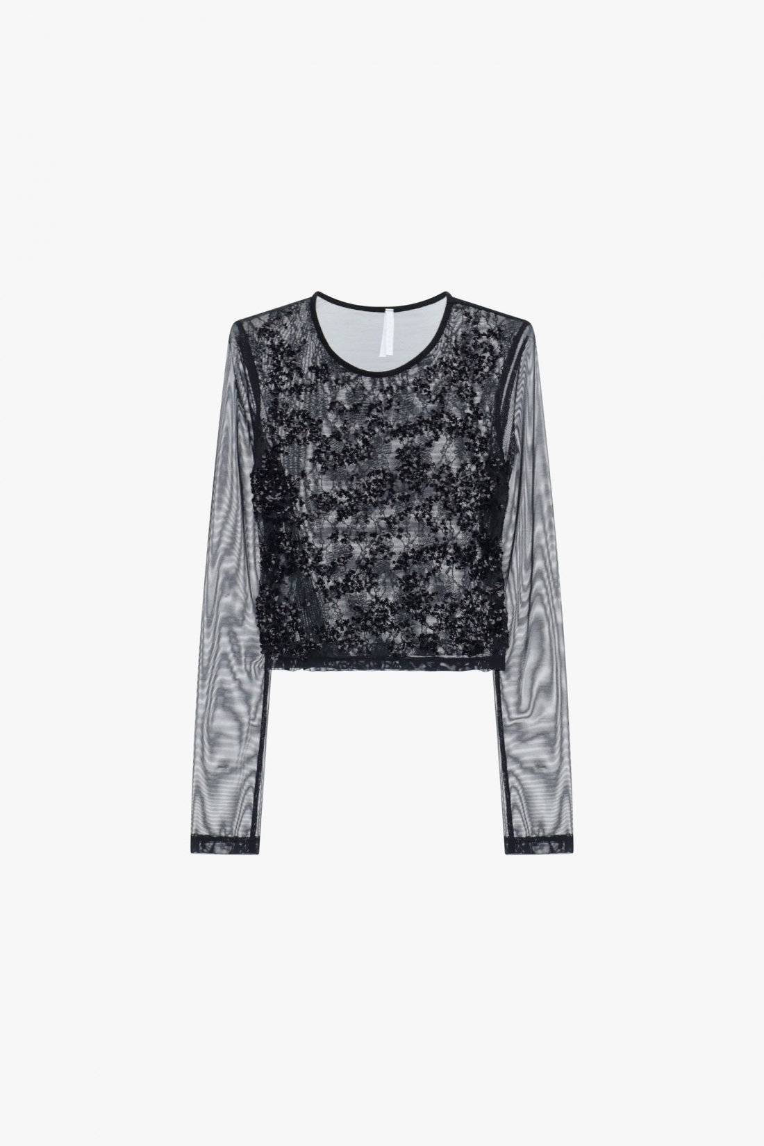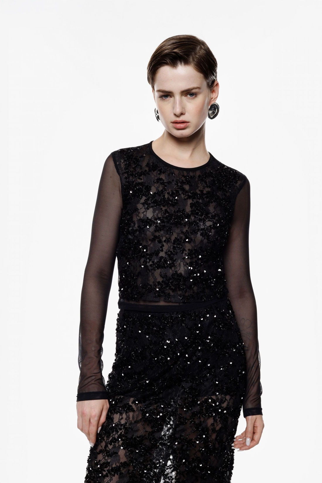 Design sofisticato per questo top cropped con maniche lunghe in tulle trasparente e decorazione di applicazioni lucide su tutta la parte anteriore. Il girocollo classico valorizza il look, perfetto per chi cerca uno stile esclusivo e contemporaneo. Ideale per creare abbinamenti originali e distintivi.