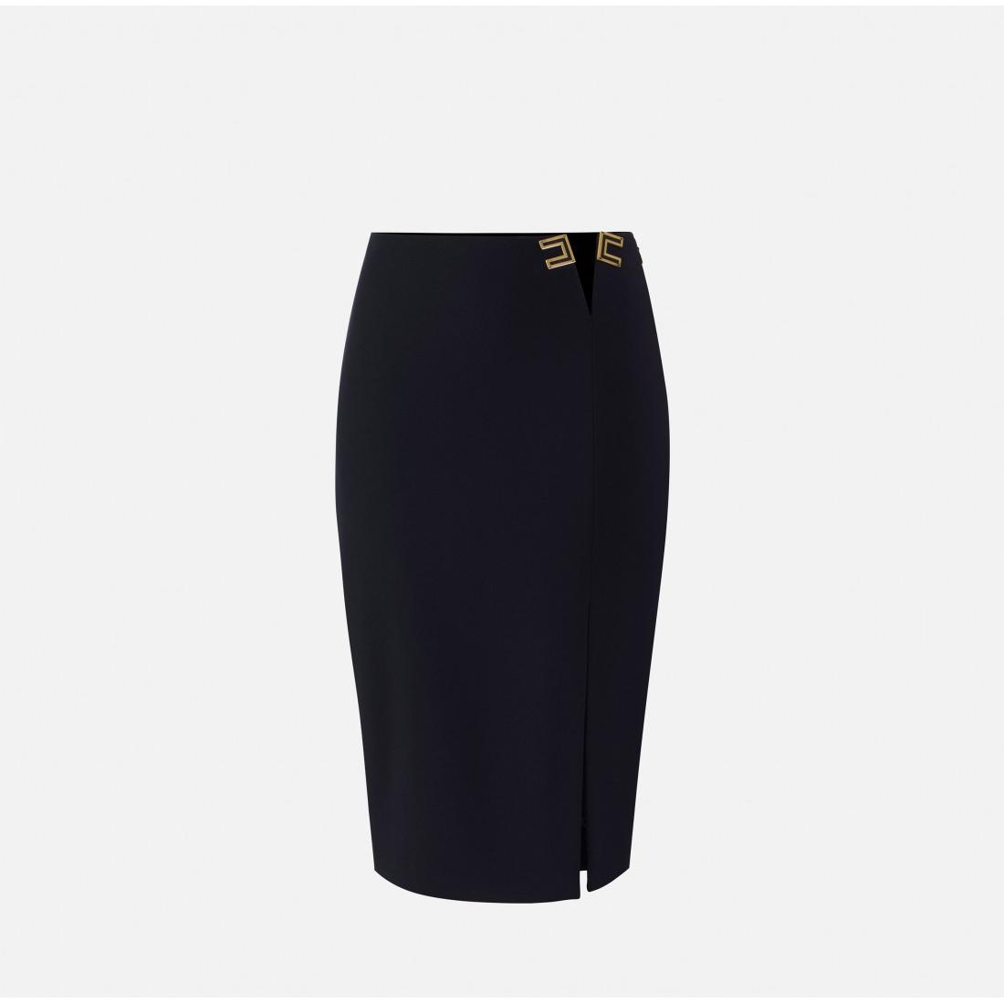 Gonna midi in doppio crêpe stretch. La vita è caratterizzata dall'apertura a V su un fianco, che si apre in uno spacco laterale. Impreziosita da dettagli con logo, in metallo dorato e smaltati internamente. Vestibilità regular.