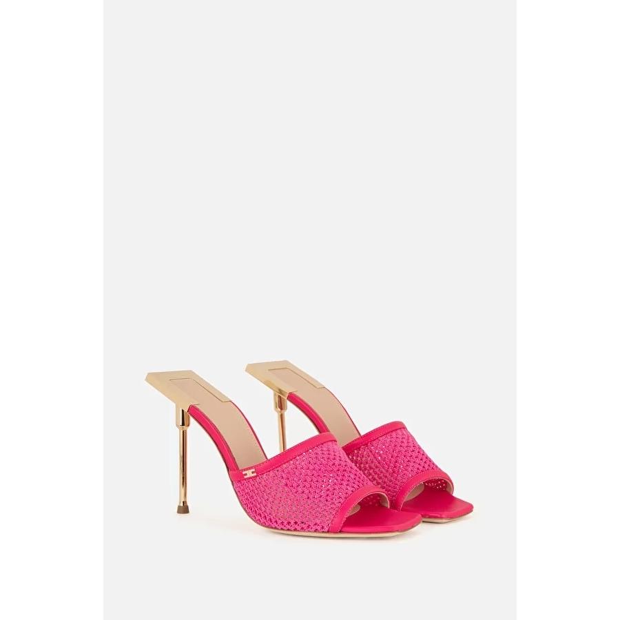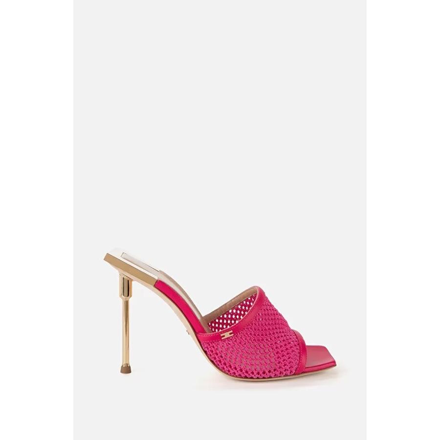 Mules in rete tecnica con placche logo posizionate sul retro del tallone. Tacco scultura H100 mm in metallo colore oro. • Mules• Rete tecnica• Tacco h100 mm• Maxi placche• Doppie c Composizione articolo 50%Cotone 50%Poliestere