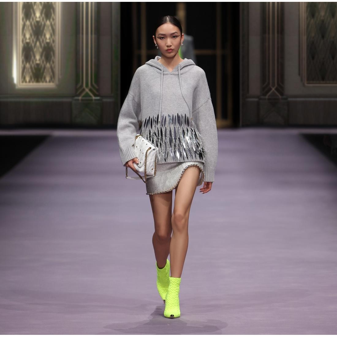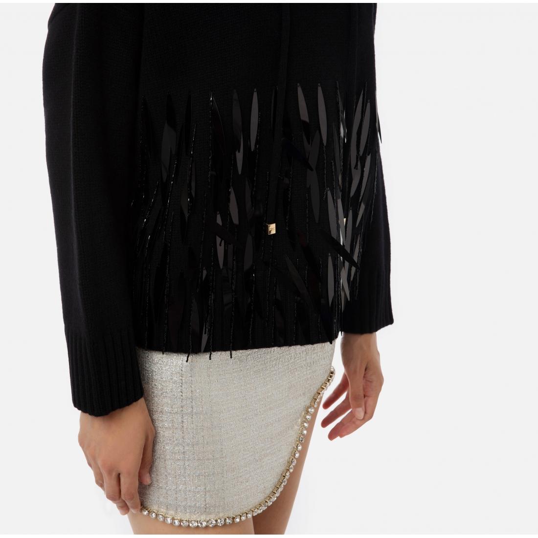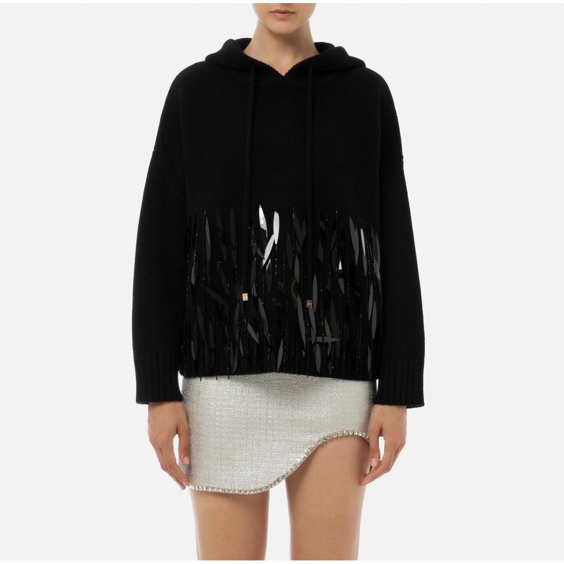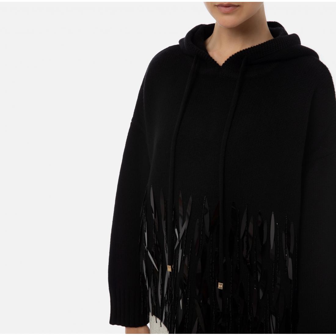 Pullover in pura lana con maniche lunghe e cappuccio con coulisse con terminalini in metallo dorato. È caratterizzato da un ricamo sul fondo di paillettes lunghe dalla forma ovoidale e frange di canottiglie Accessorio in metallo dorato Lunghezza 70 cm per la taglia 40 IT Composizione articolo 100% Lana