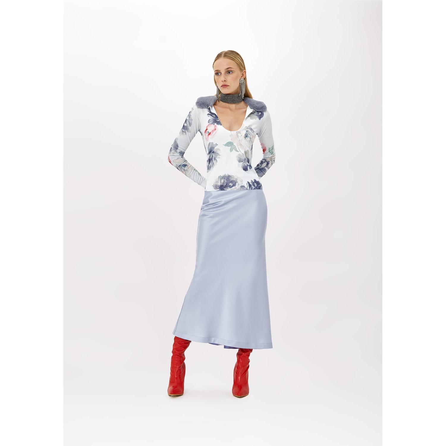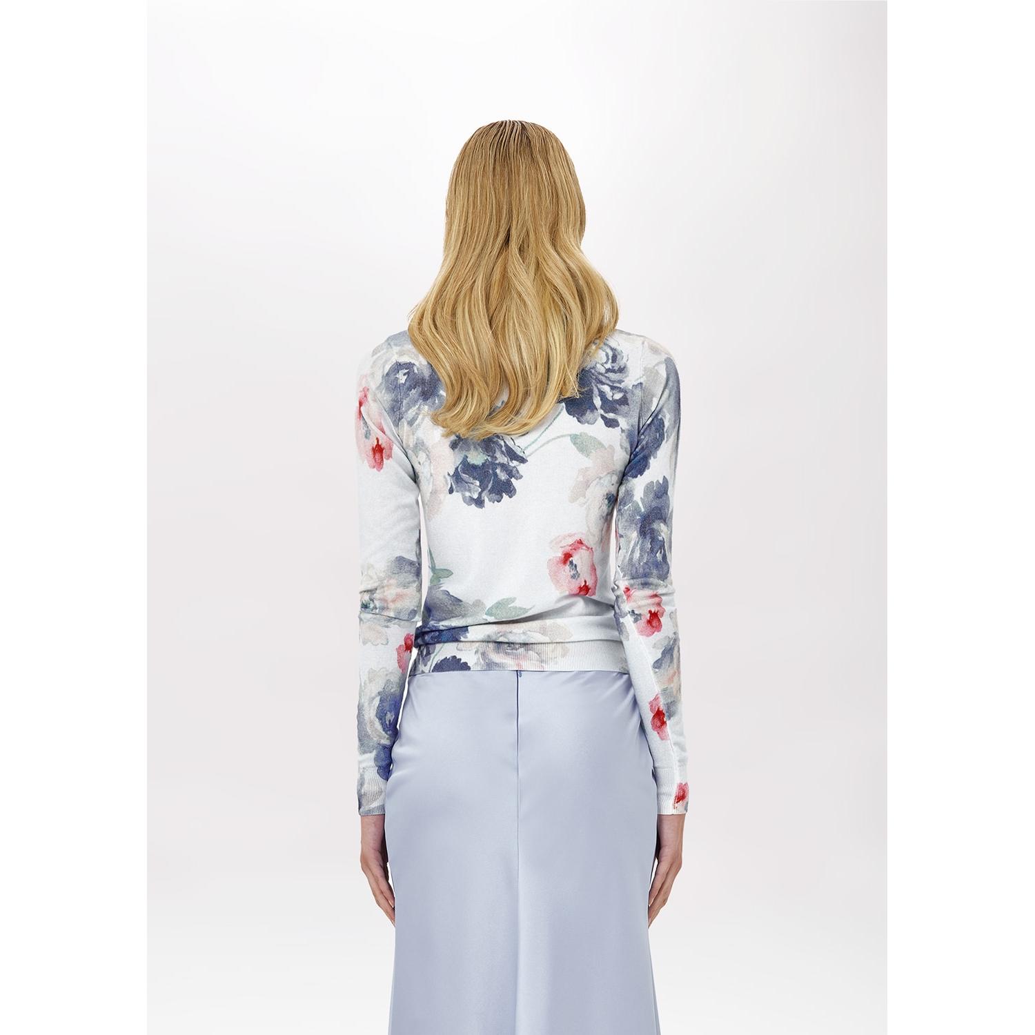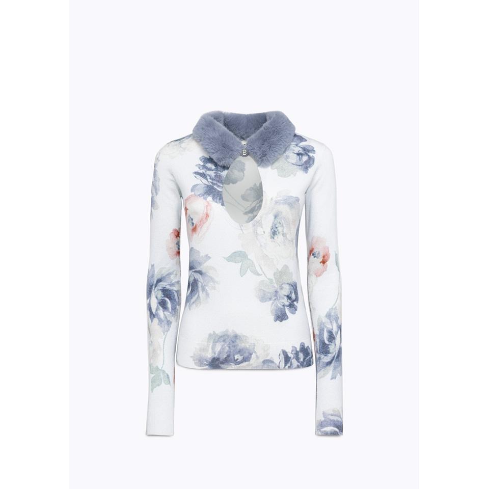 MAGLIA ICONICA IN FILATO DI VISCOSA STRETCH MANO CALDA A FIORI, CON COLLETTO IN FAUX FUR RIMOVIBILE. LINEA FITTED, APERTURA A GOCCIA DAVANTI, CHIUSURA CON BOTTONE RICOPERTO CON LOGO B, MANICHE LUNGHE, FONDI RIFINITI A COSTINE. STAMPA BOUQUET IN PERFETTO STILE BLUGIRL PER COMPLETARE IL TUO STILE. COMPOSIZIONE: 55% VISCOSA, 45% POLIAMMIDE