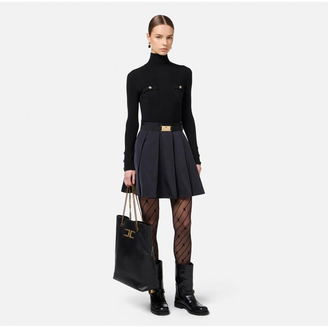 Miniabito in viscosa e seta a costine a maniche lunghe con collo alto e tasche con ricamo logo rifinite da bottoni in metallo dorato. Il punto vita è enfatizzato da una cintura in elastico con fibbia in metallo dorato che sovrasta la gonna a pieghe in nylon.