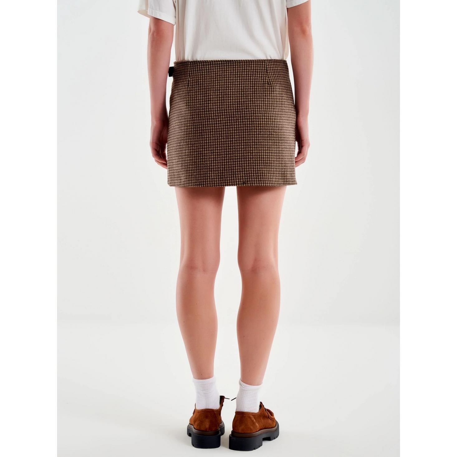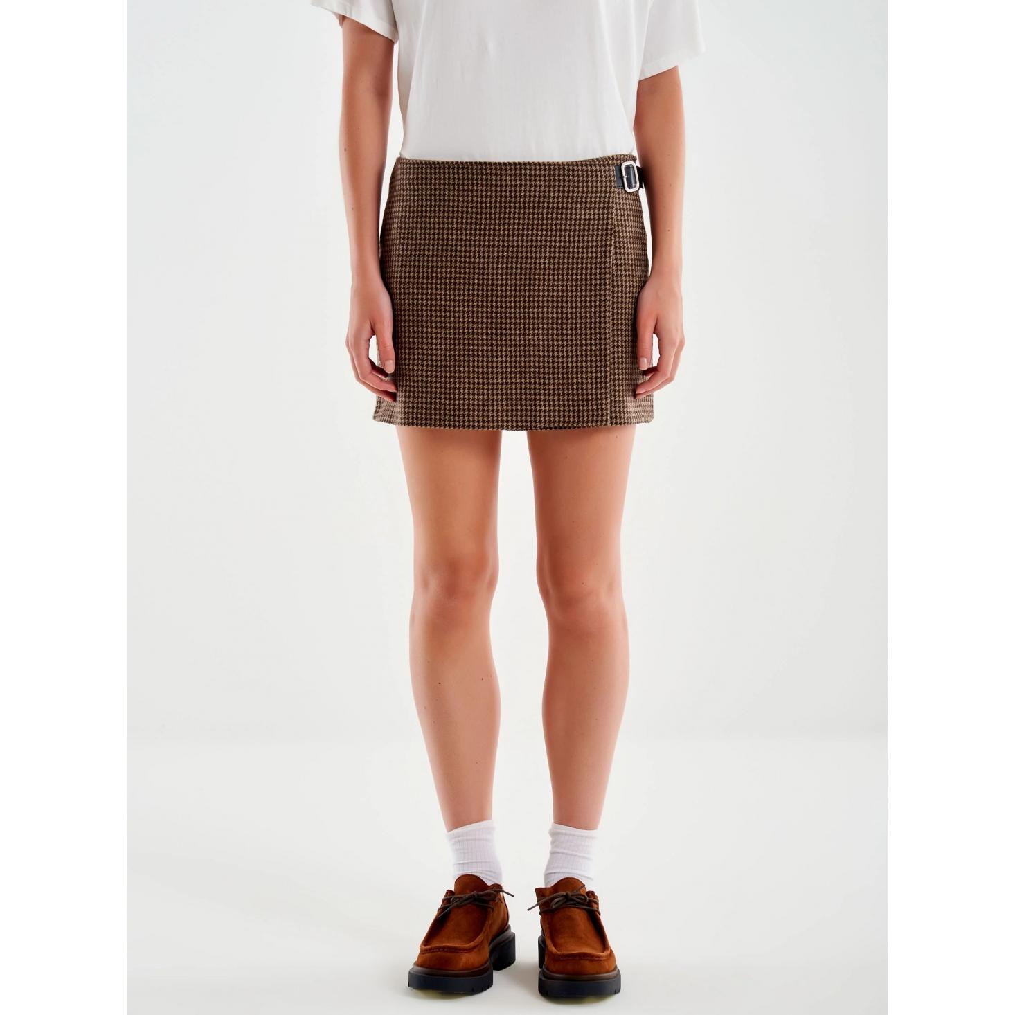 Gonna mini in panno a portafoglio. Chiusura laterale con fibbia di metallo. Tessuto fantasia check.