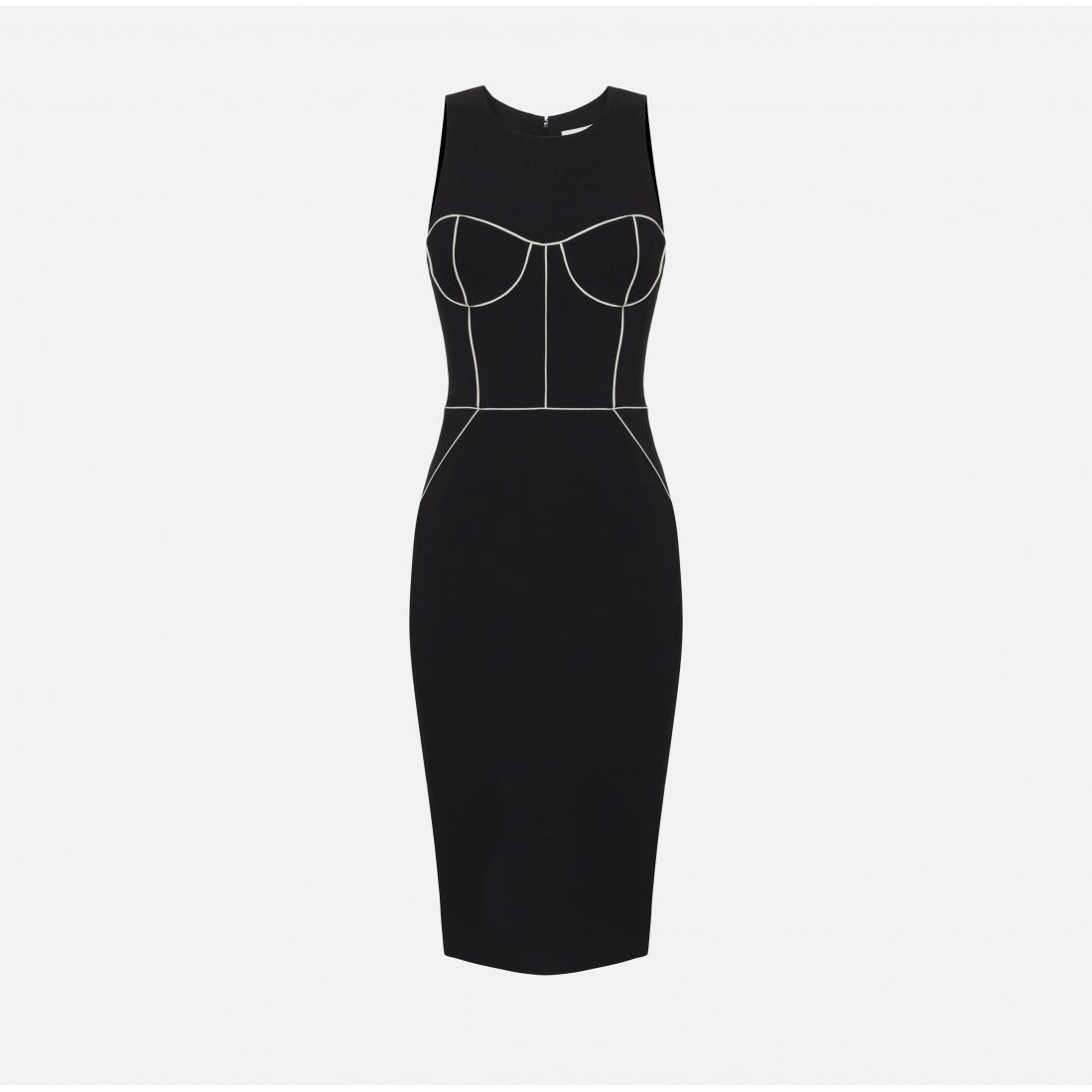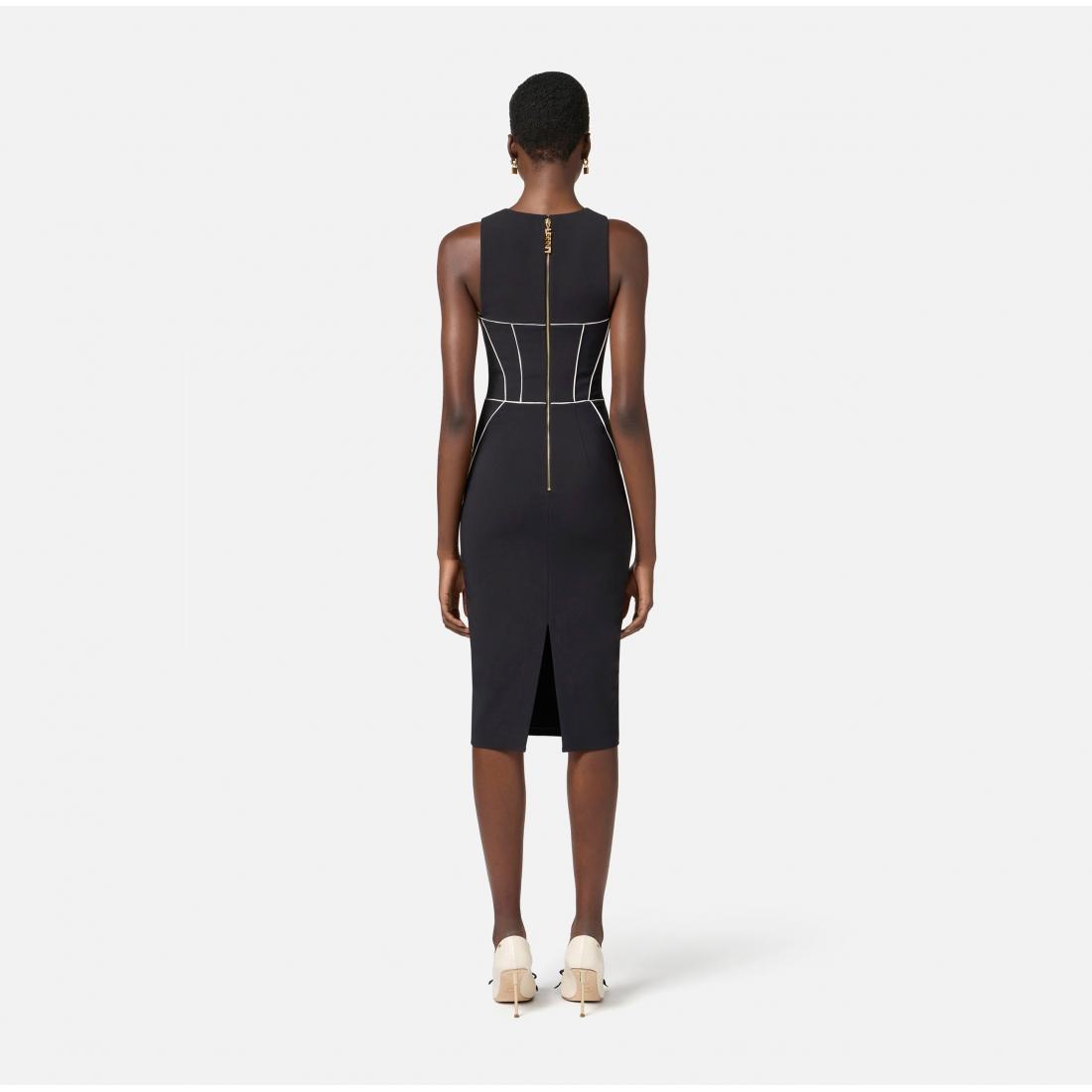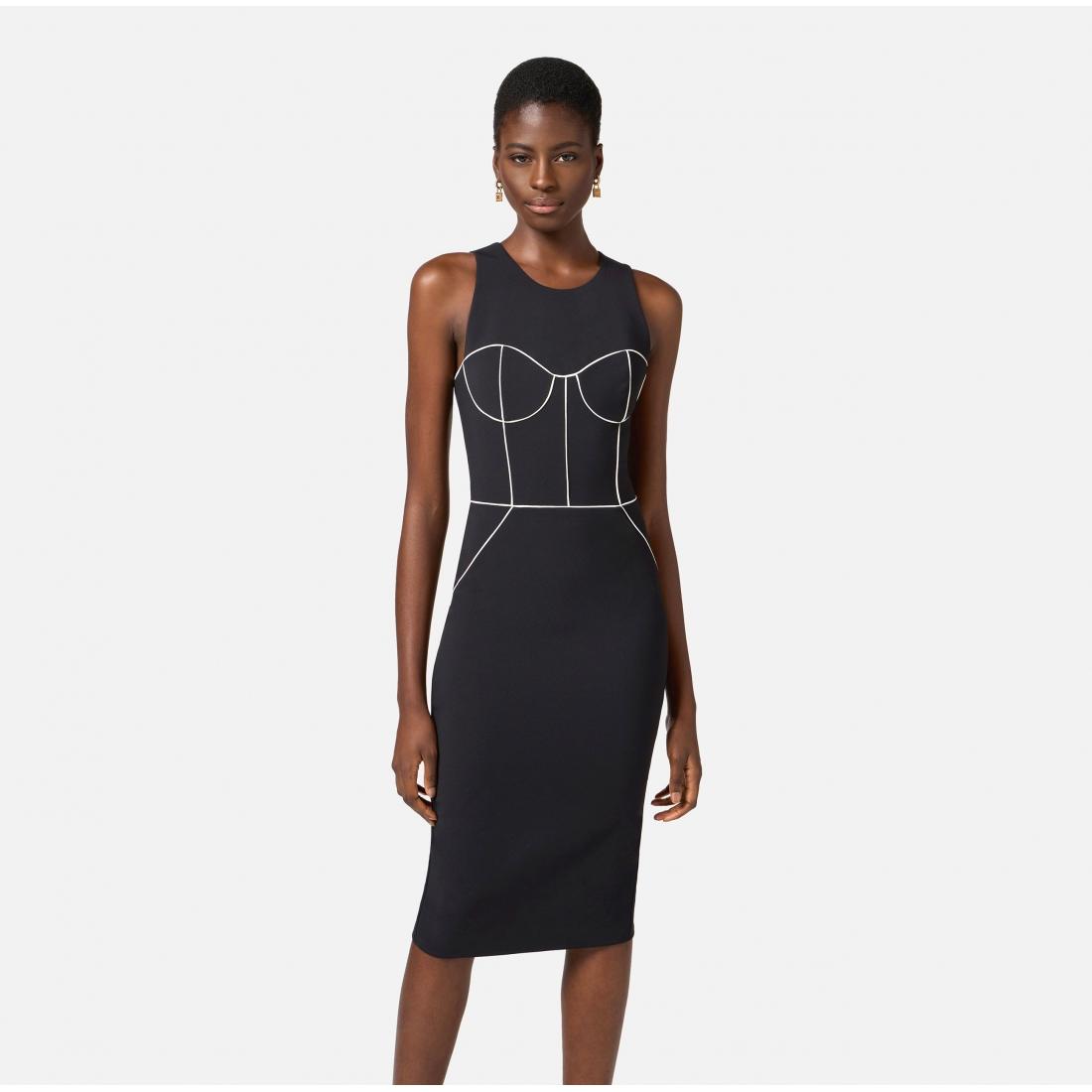 Abito smanicato in crêpe stretch con linea a tubino. Il vestito si distingue per il suo stile grafico: i dettagli di piping a contrasto ricreano un bustier con effetto trompe-l'oeil. Gonna a matita con spacco sul retro e lunghezza al ginocchio. Vestibilità aderente.