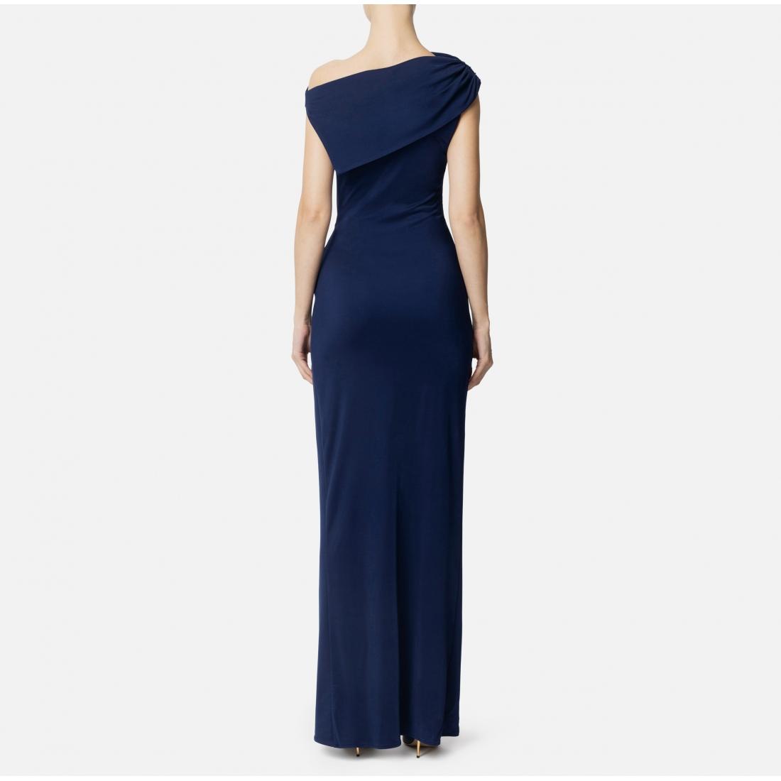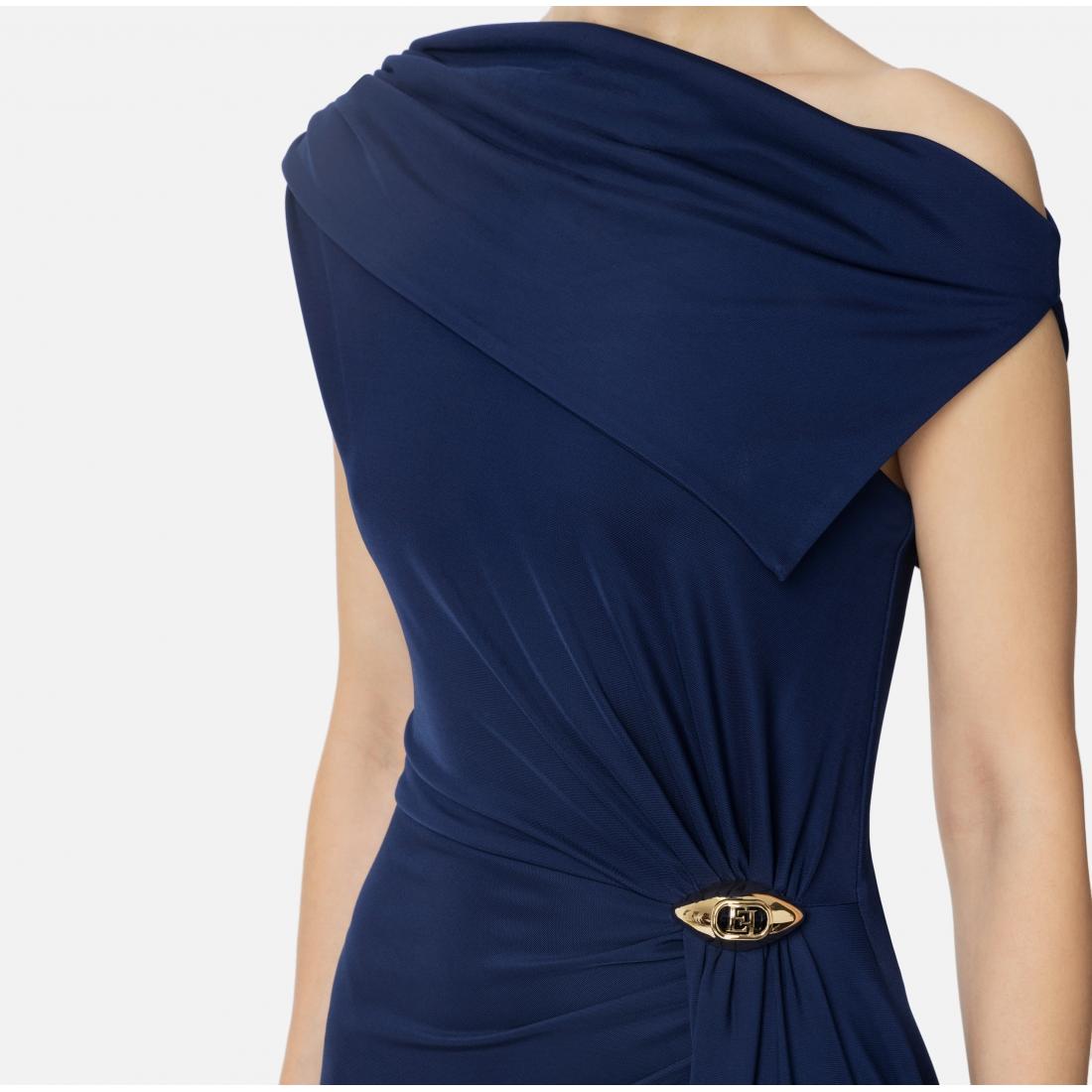 Abito da sera in jersey fluido. Il vestito ha ampio scollo asimmetrico e alto spacco laterale. Il drappeggio centrale disegna una silhouette sofisticata ed è impreziosito dalla decorazione gioiello di forma ovale con interno in pietra colorata.