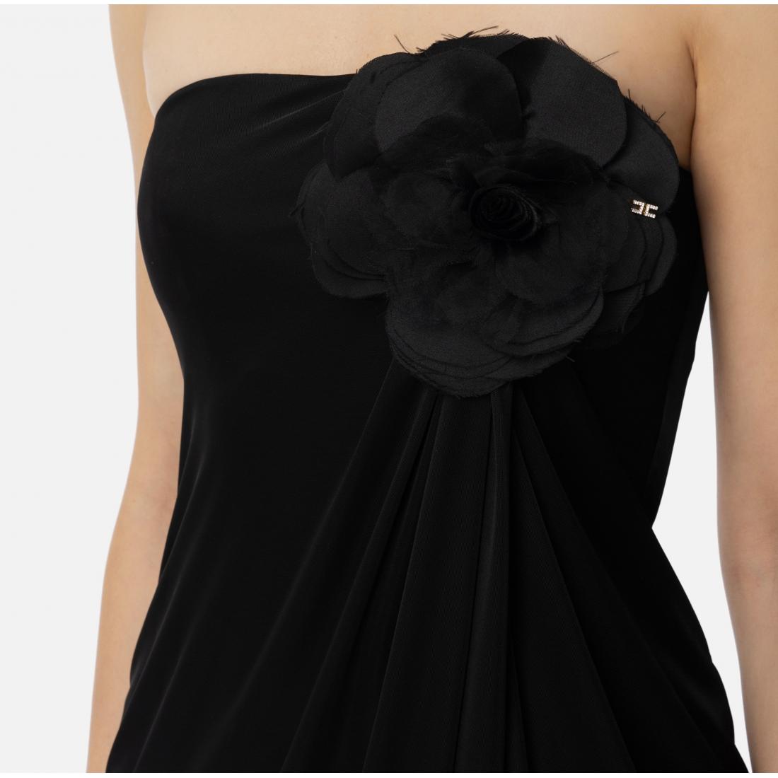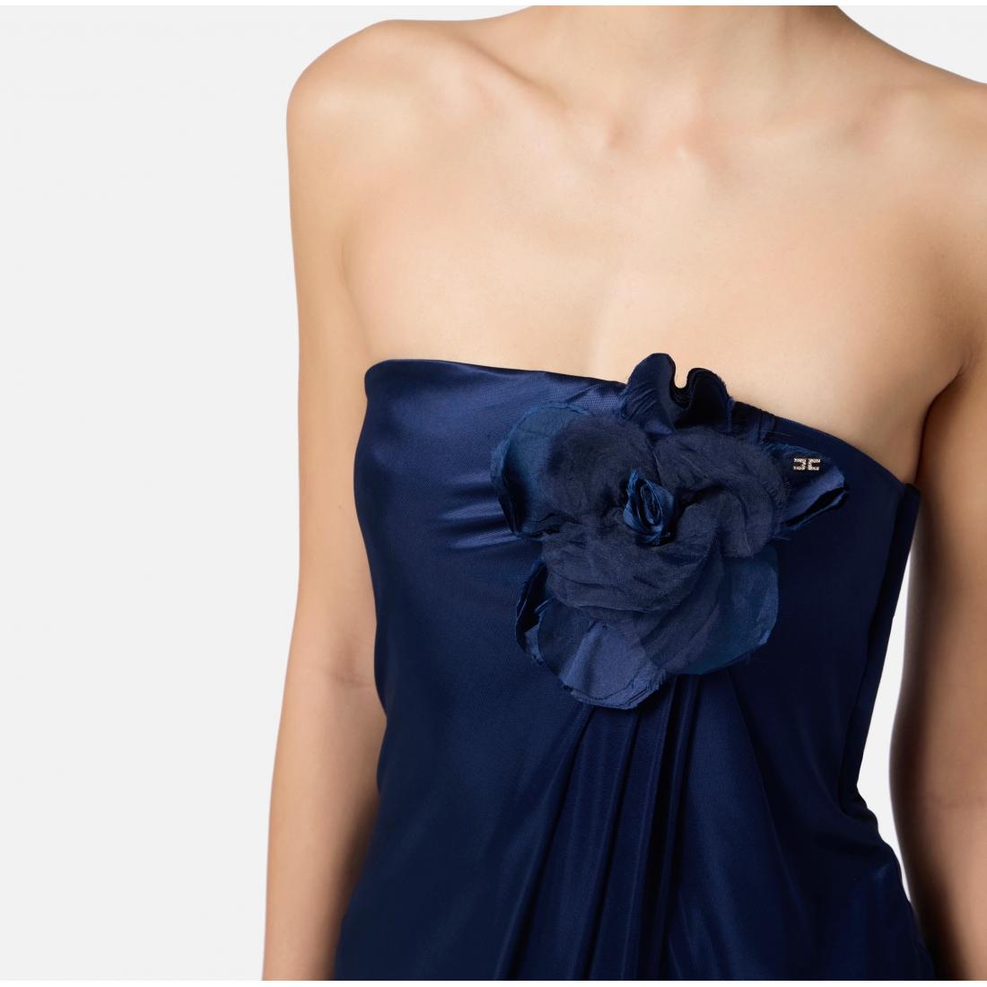 Abito da sera in jersey lucido. Il vestito ha spalle scoperte e si distingue per l'elegante applicazione floreale sul top, impreziosita dal dettaglio logo. I drappeggi che cadono morbidi sulla silhouette regalano un fascino rilassato e disinvolto. Spacco sul retro. Vestibilità slim.