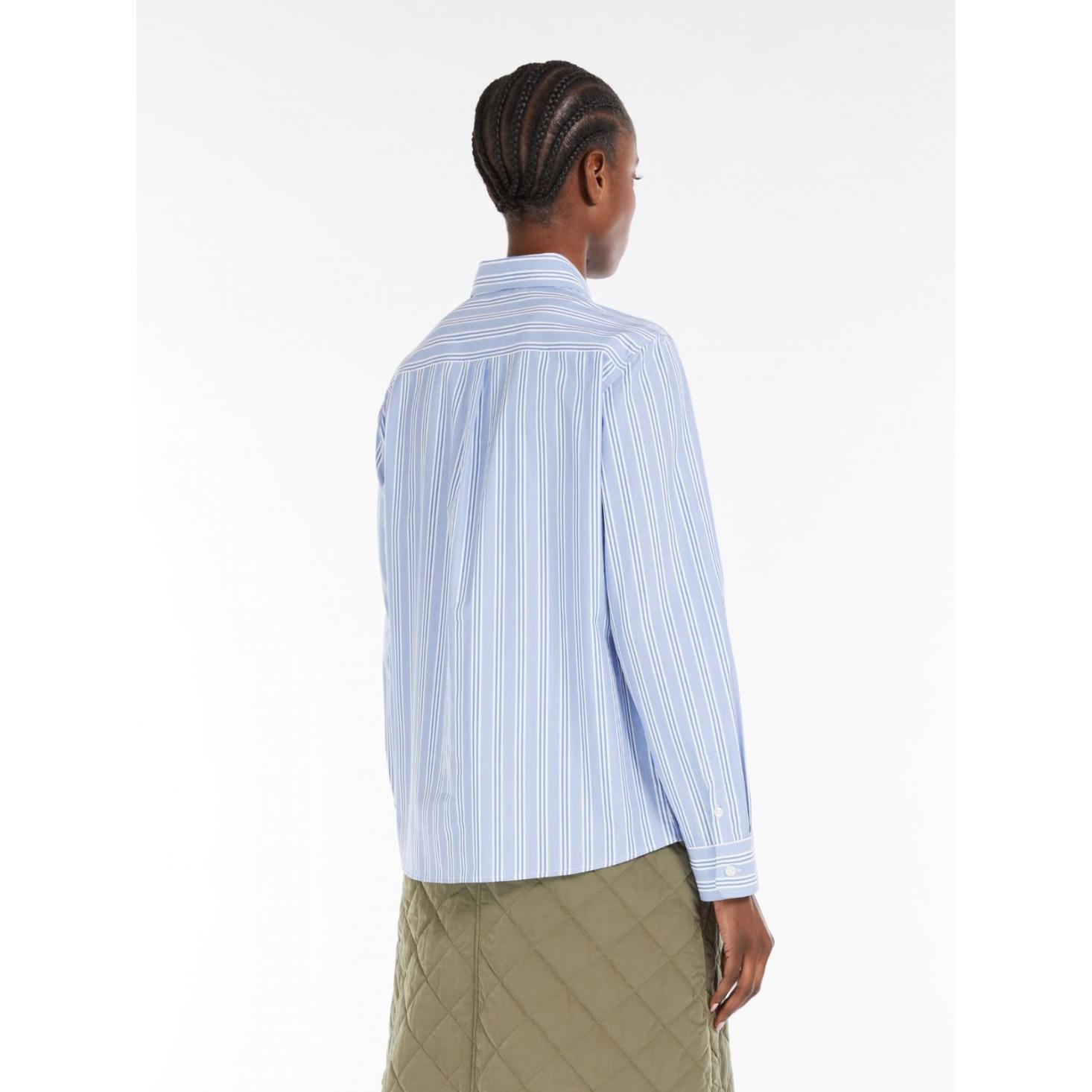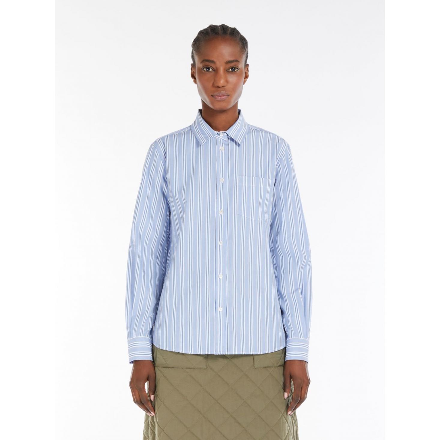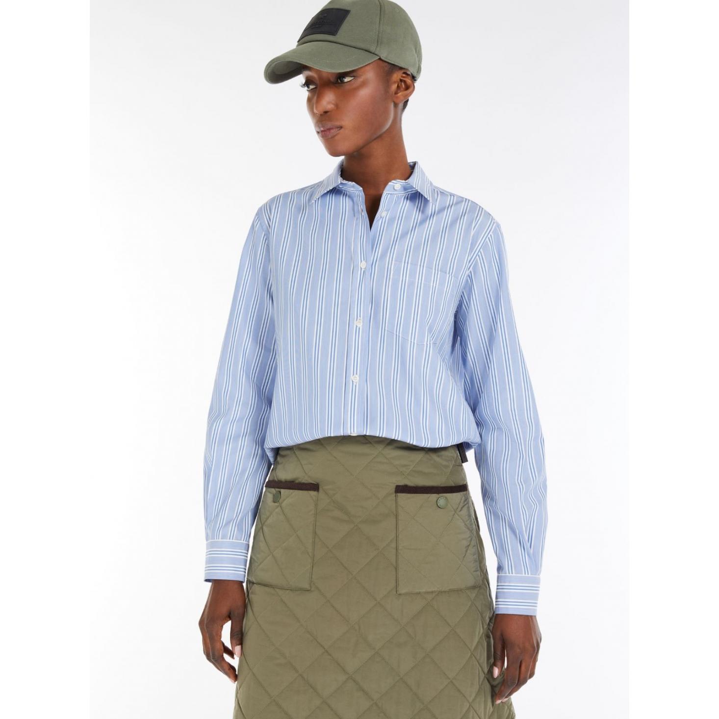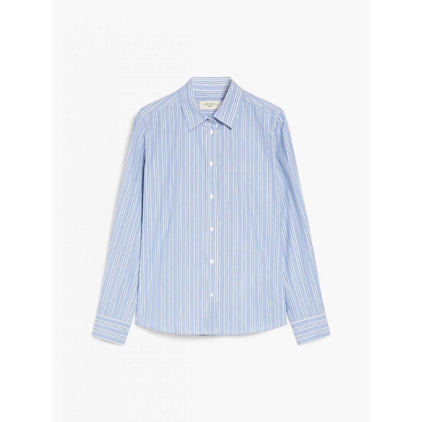 Camicia in popeline di puro cotone a righe, con logo ricamato sul davanti e taschino applicato sul petto. Modello dalla linea dritta, caratterizzato da colletto classico e maniche lunghe a giro con polsini e bottone. Rifinita con taglio carré sul retro e fondo arrotondato. Chiusura con bottoni a vista. Il tessuto principale di questo capo contiene almeno il 50% di fibra di cotone coltivata secondo i principi dell'agricoltura biologica.