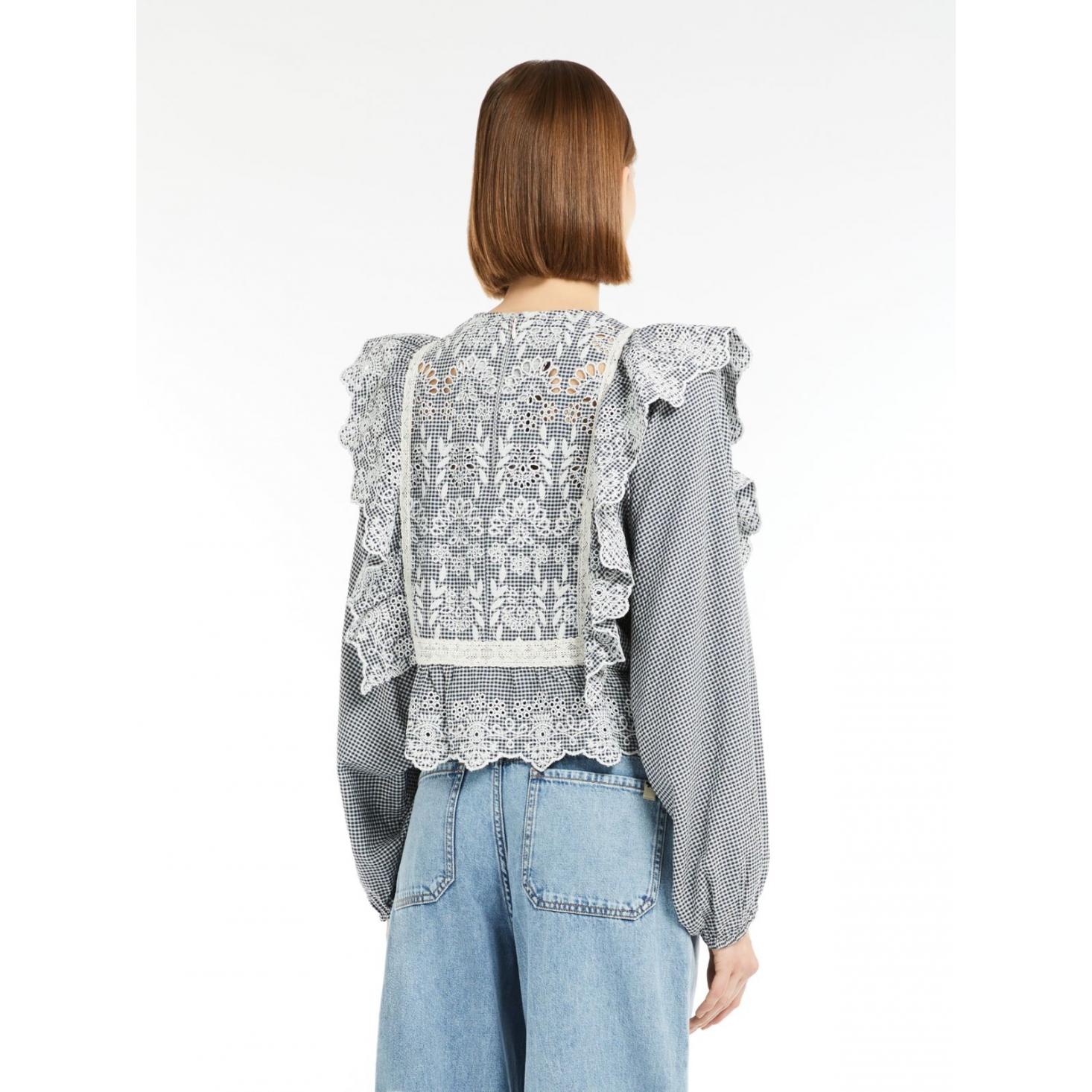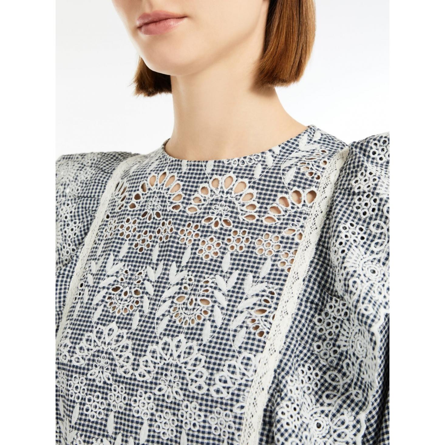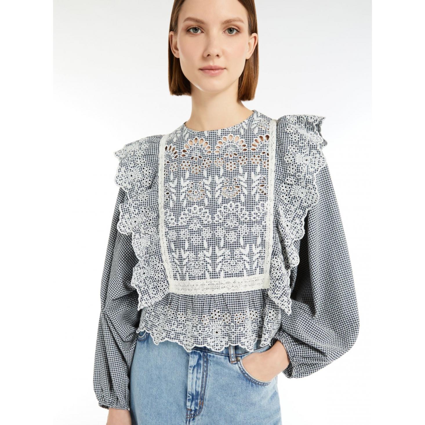 Blusa in tela di puro cotone con disegno Vichy. Modello girocollo dalla silhouette morbida, impreziosito con davantino ricamato effetto see-through e morbide rouches con profili smerlati sui fianchi e sul fondo. Rifinita con maniche ampie ampie e polsini elastici. Chiusura con zip sul retro.