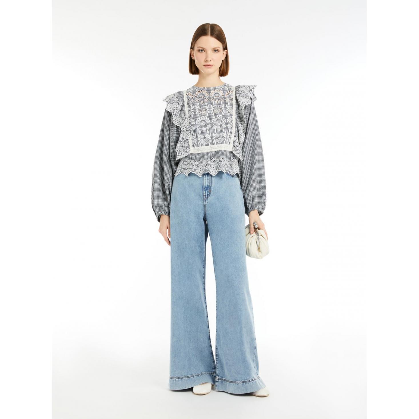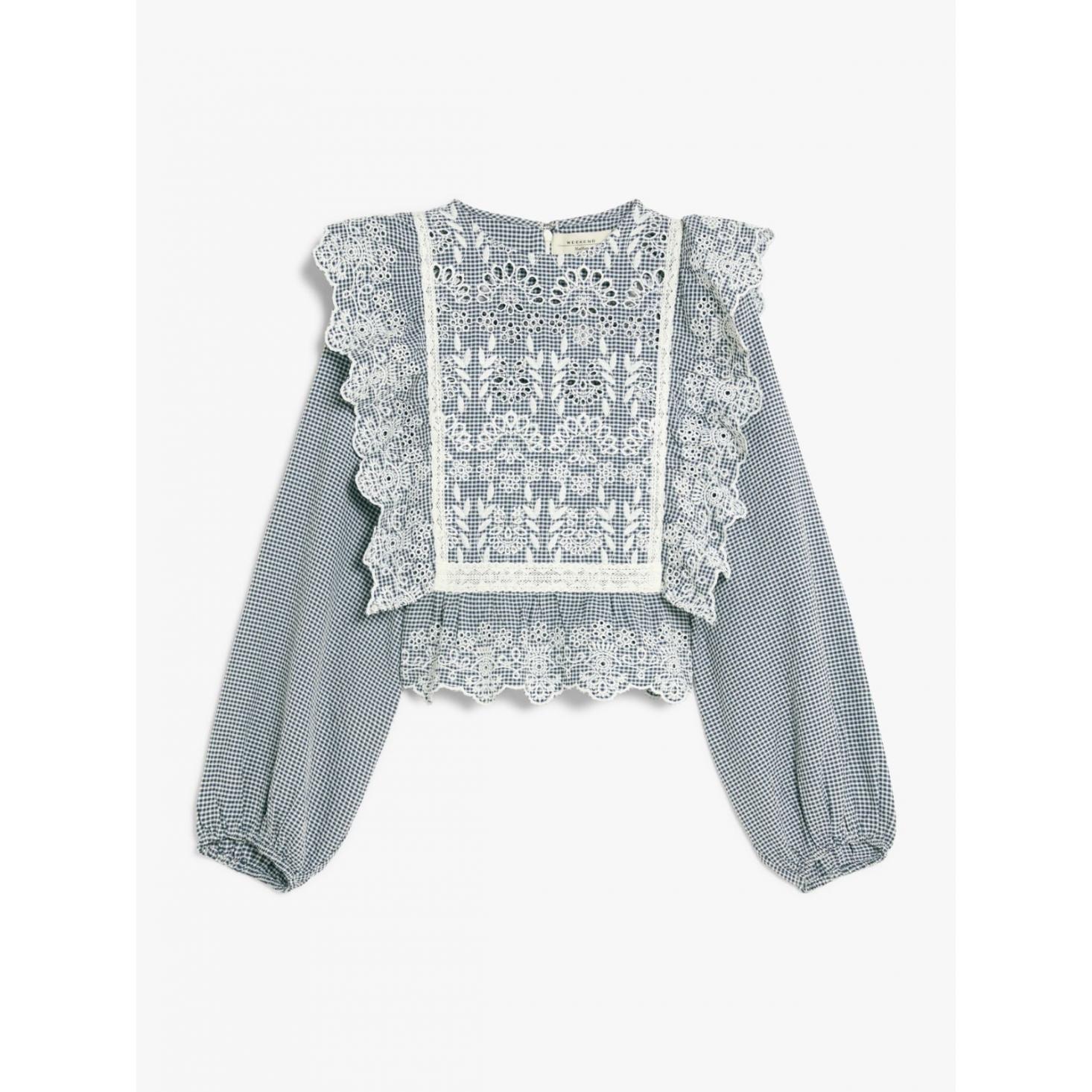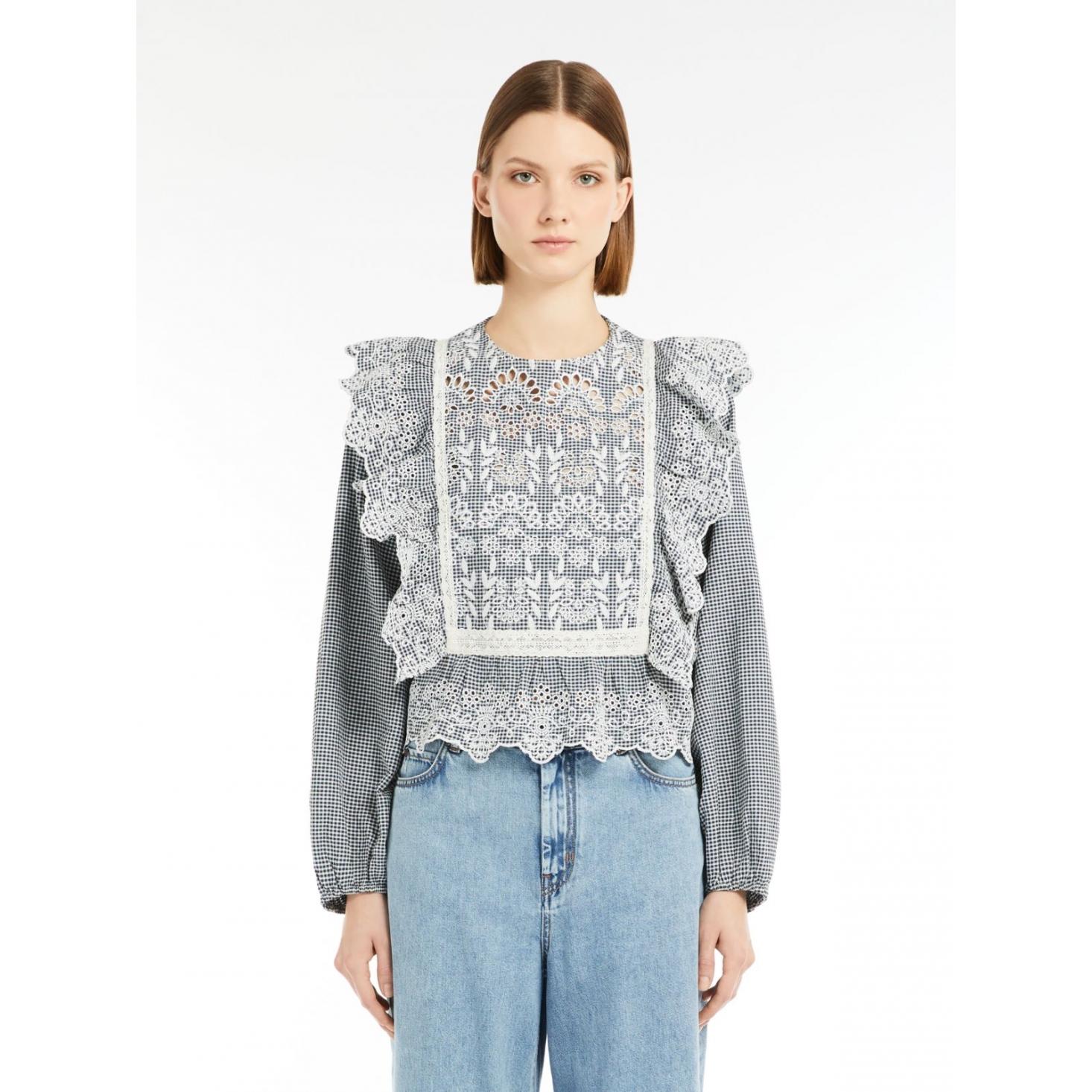 Blusa in tela di puro cotone con disegno Vichy. Modello girocollo dalla silhouette morbida, impreziosito con davantino ricamato effetto see-through e morbide rouches con profili smerlati sui fianchi e sul fondo. Rifinita con maniche ampie ampie e polsini elastici. Chiusura con zip sul retro.