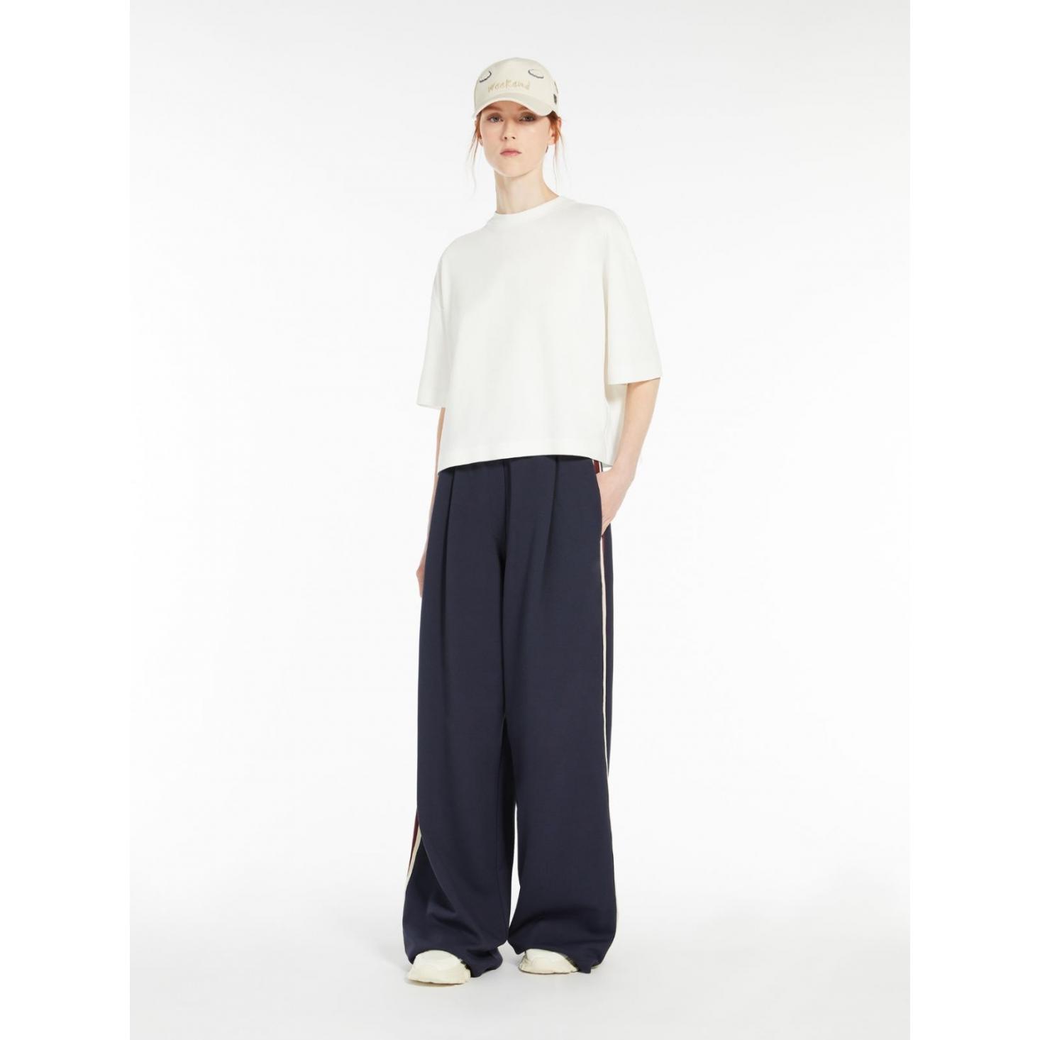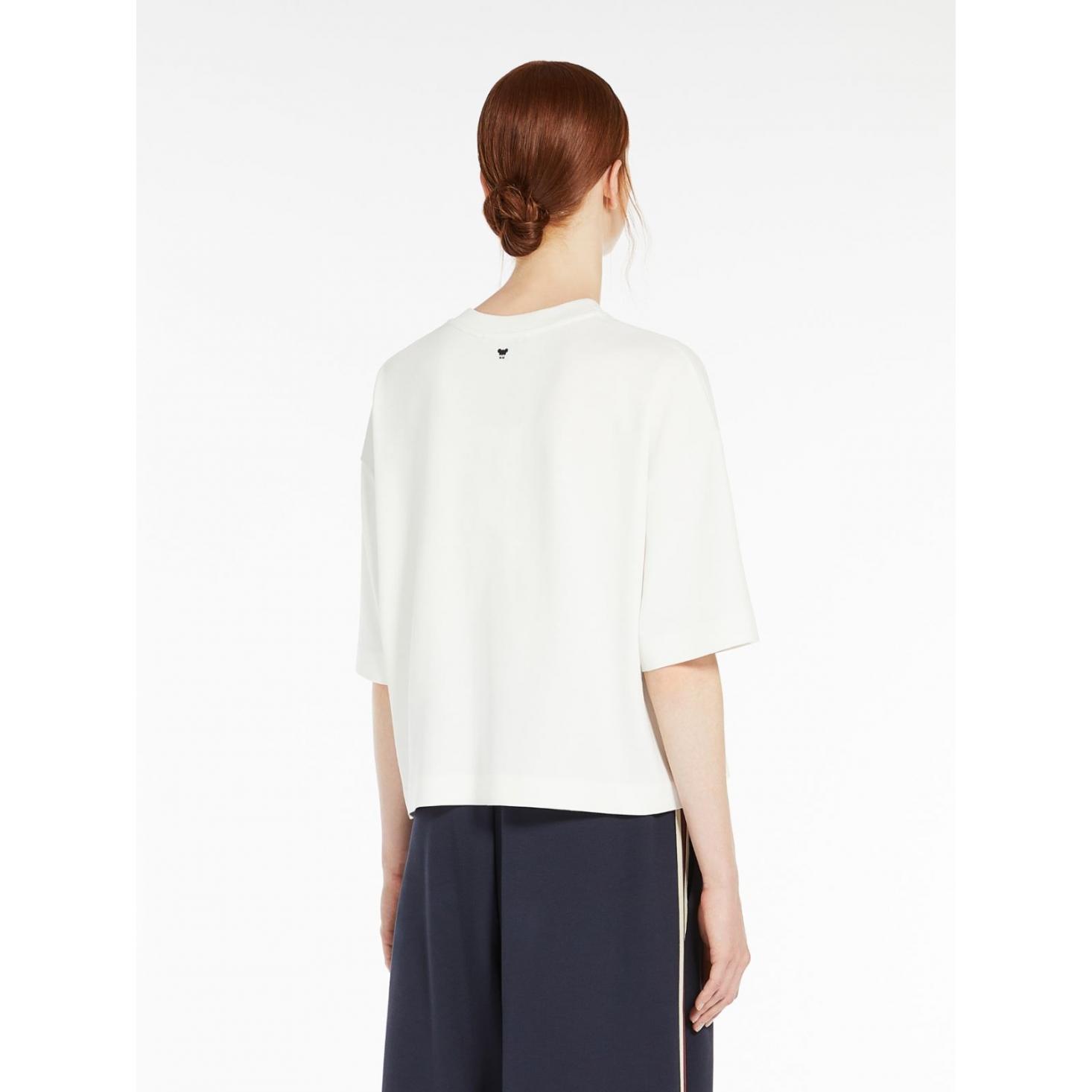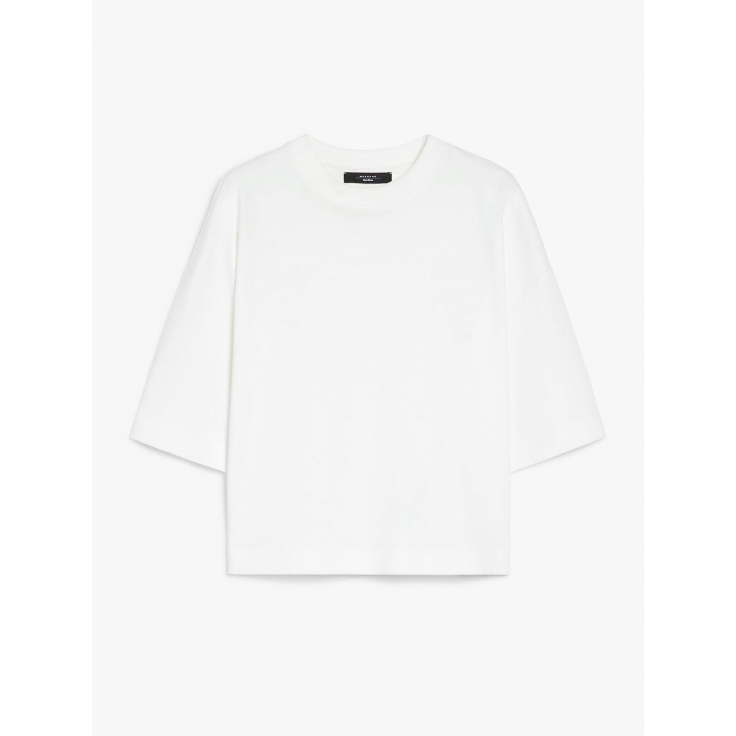 T-shirt boxy in morbido jersey di cotone organico e viscosa. Il modello presenta collo tondo rifinito a costine e maniche corte a giro leggermente basso.