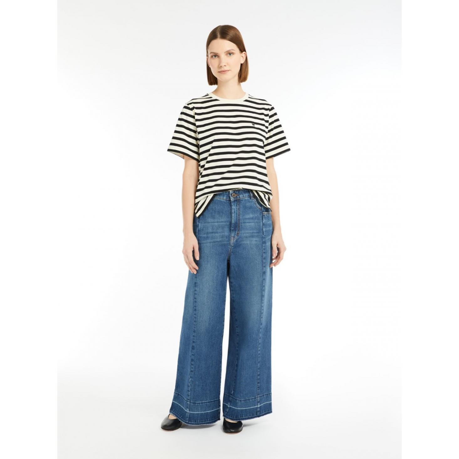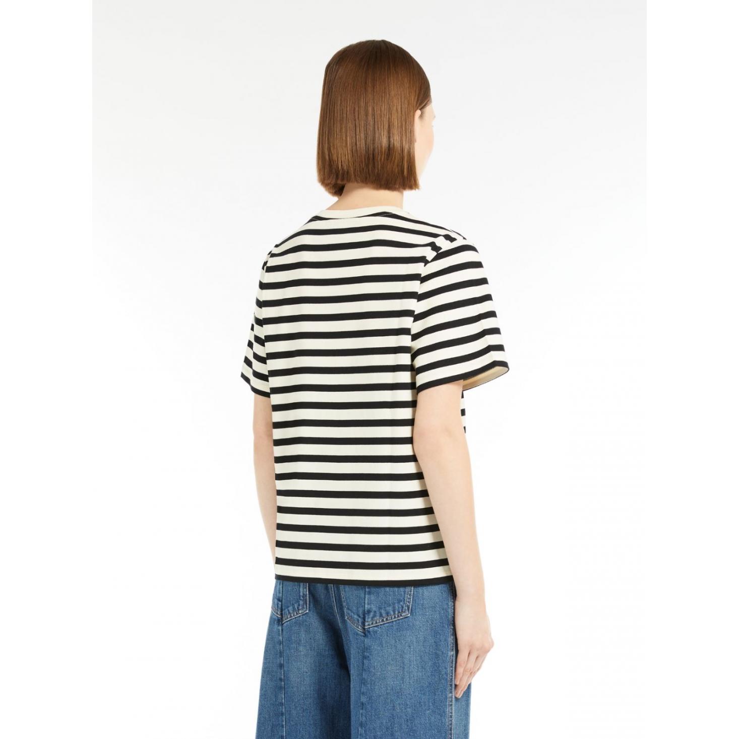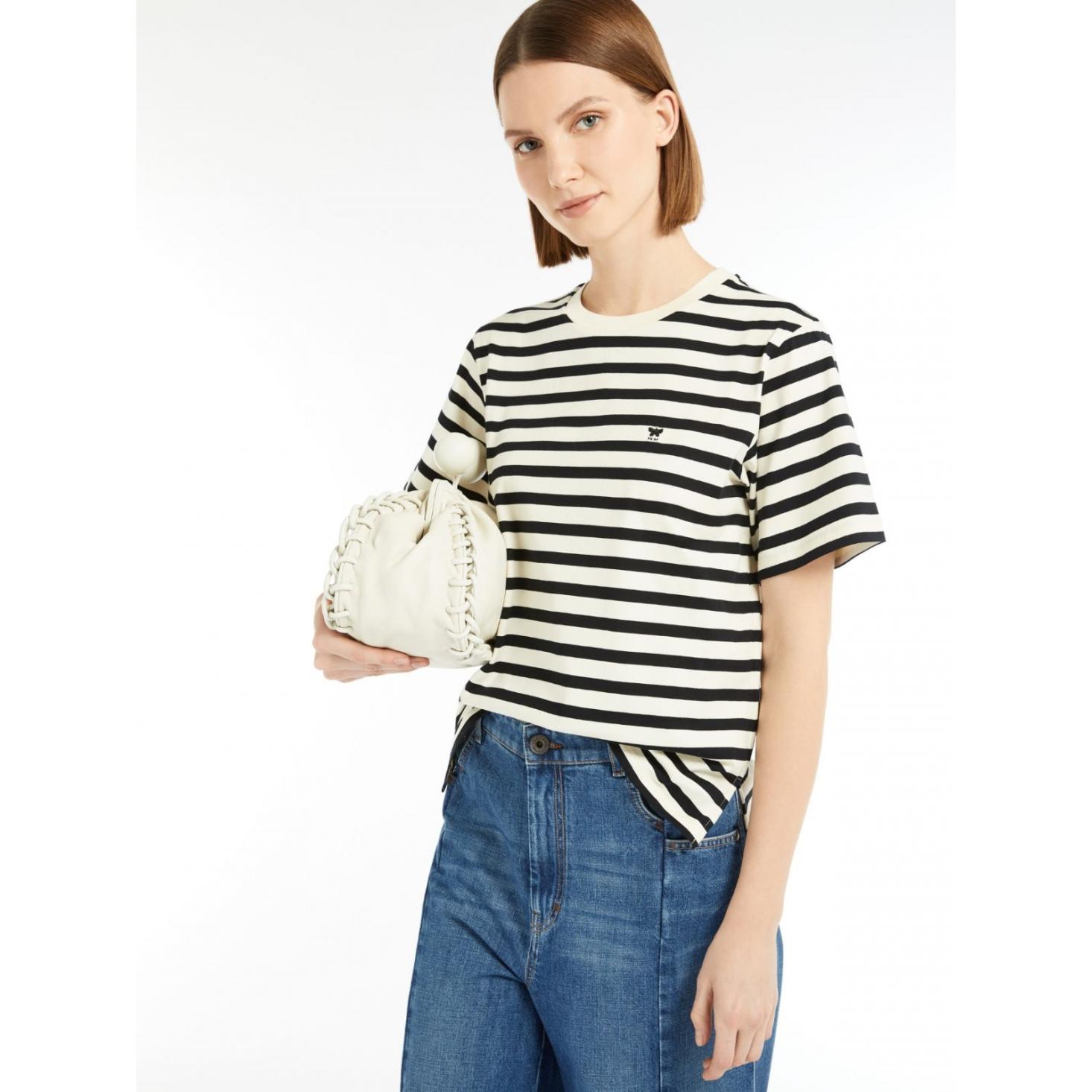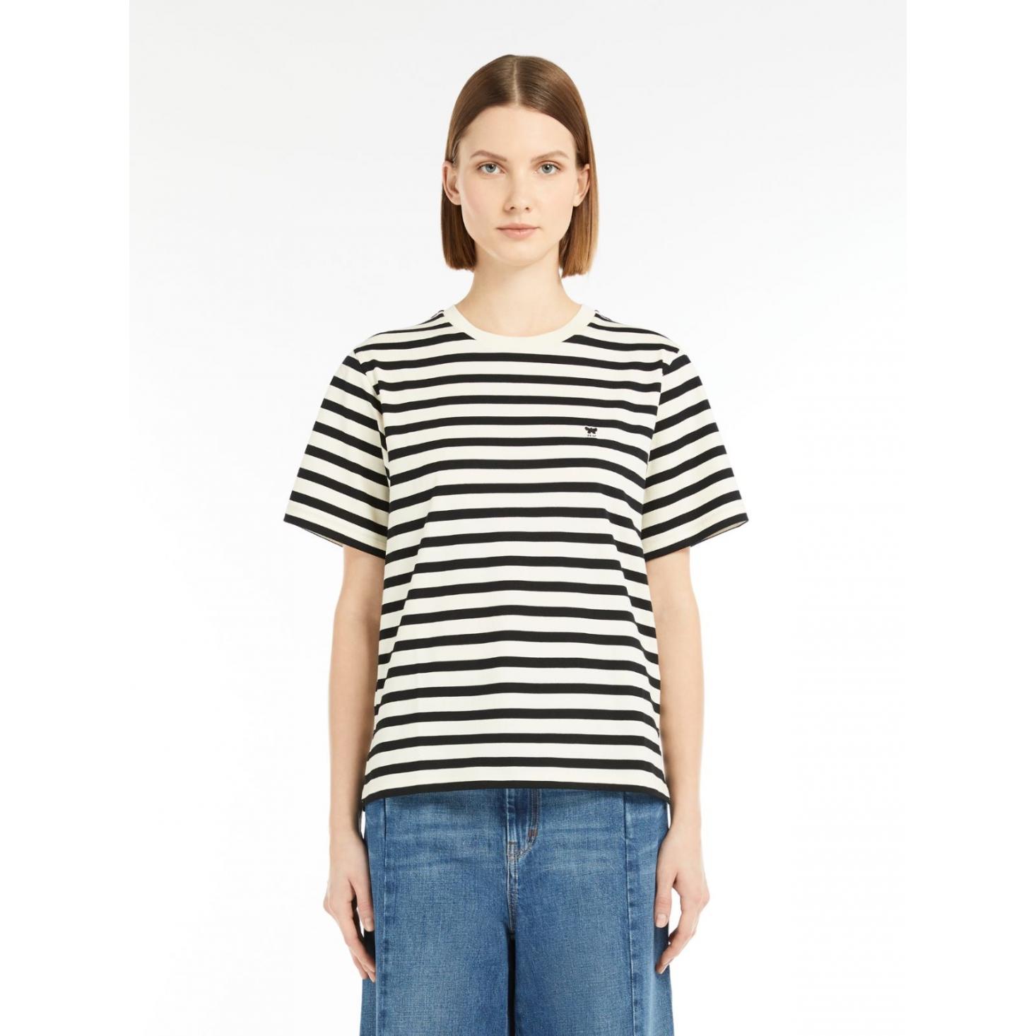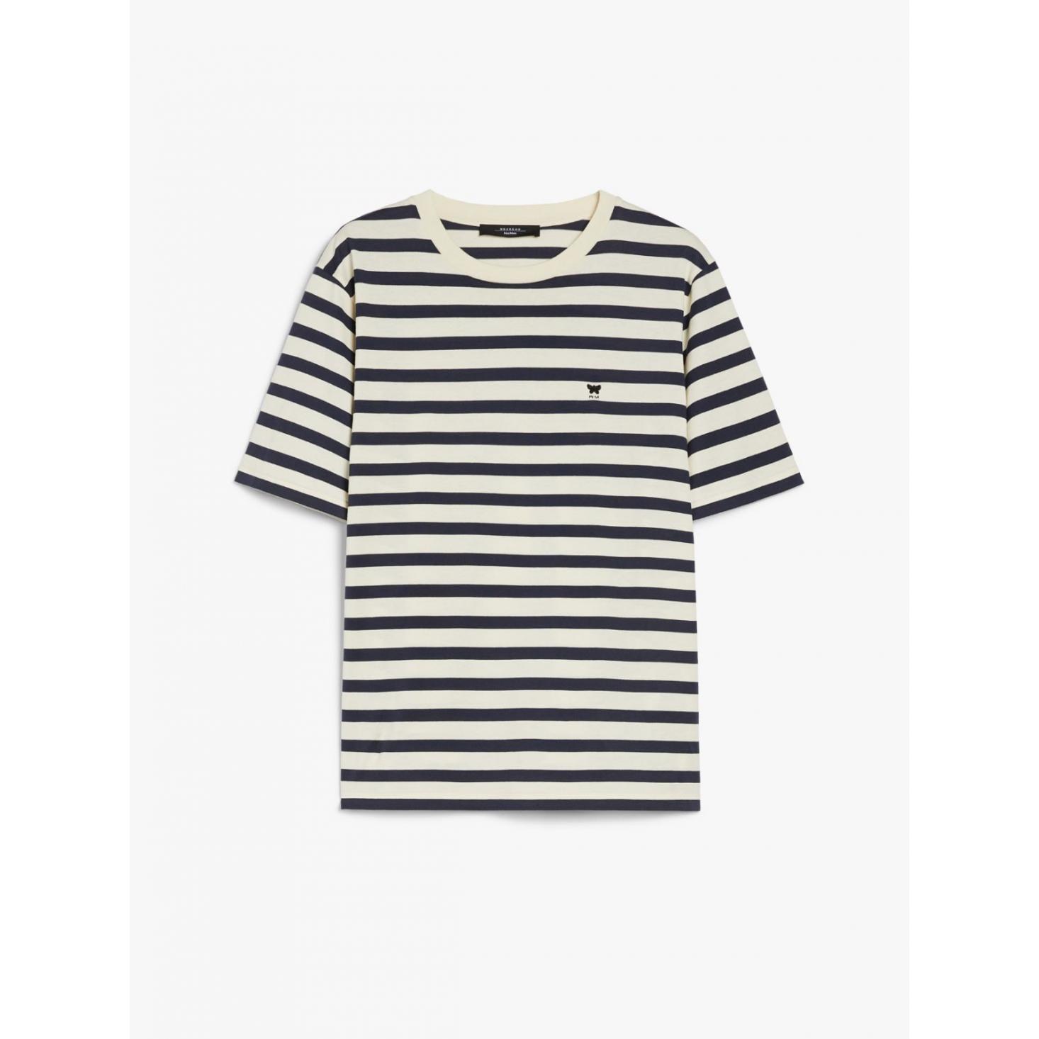 T-shirt in morbido jersey di puro cotone, caratterizzata da una silhouette dritta con scollo a giro e maniche corte. Rifinita con piccoli spacchi laterali al fondo e logo a farfalla ricamato sul petto.