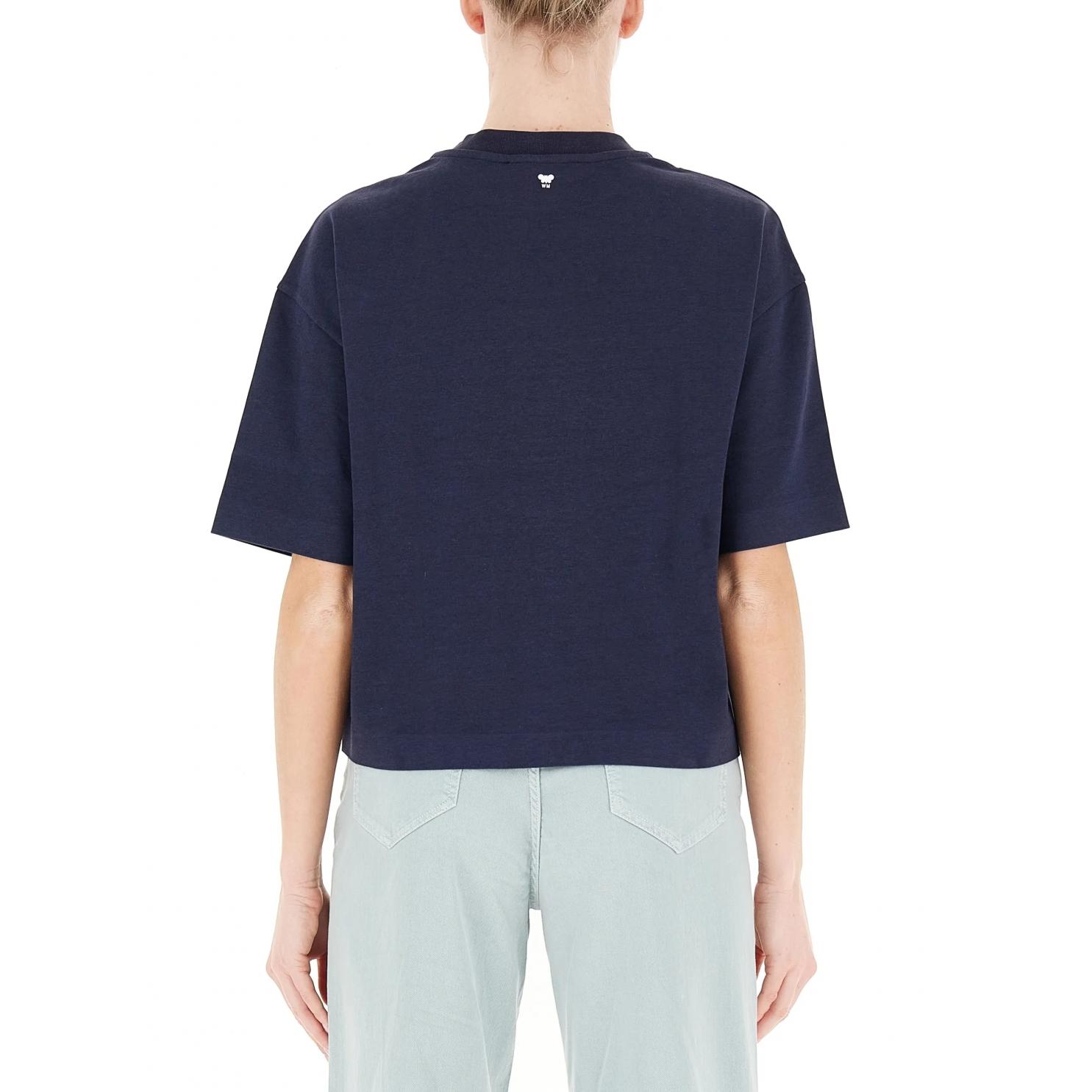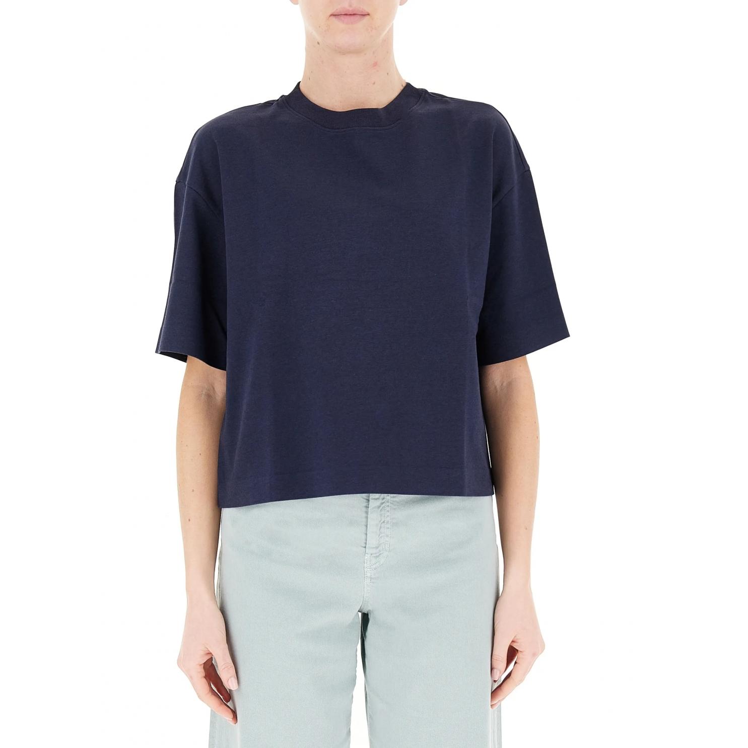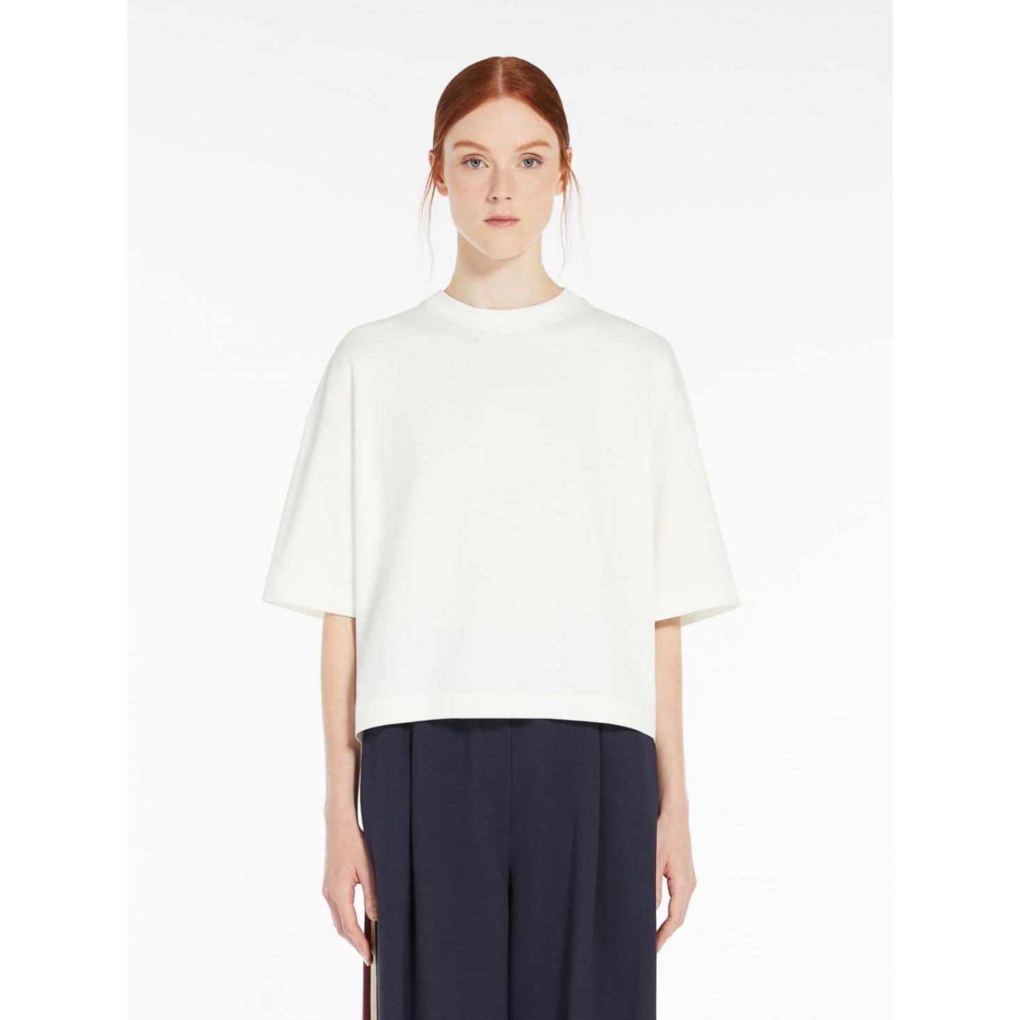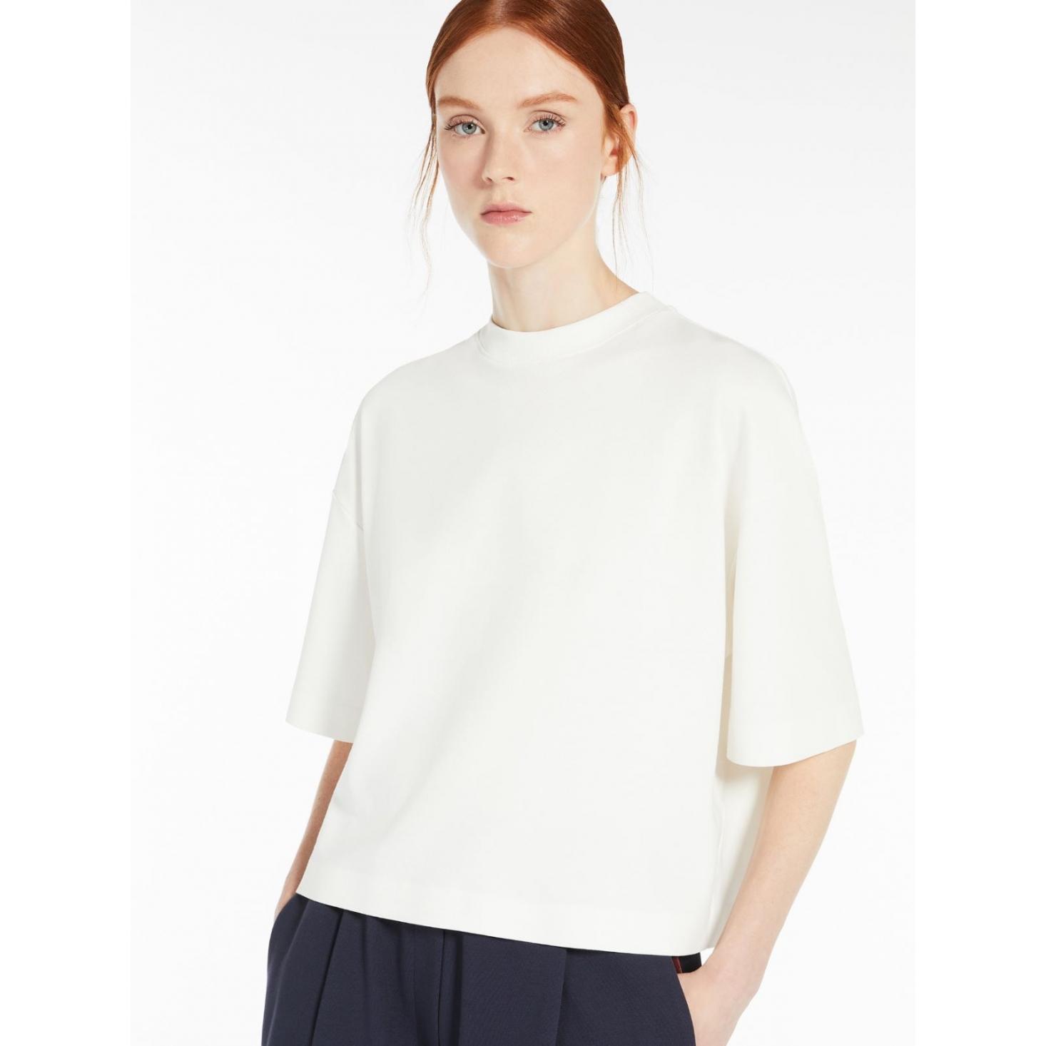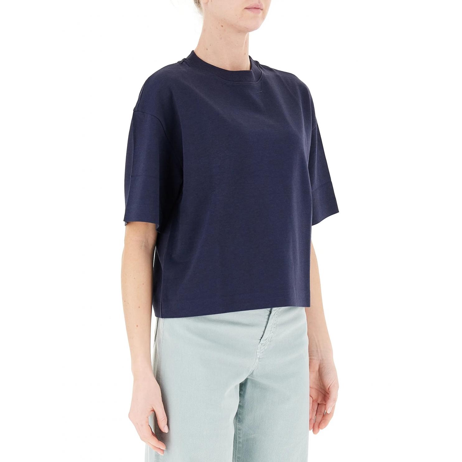 T-shirt boxy in morbido jersey di cotone organico e viscosa. Il modello presenta collo tondo rifinito a costine e maniche corte a giro leggermente basso.