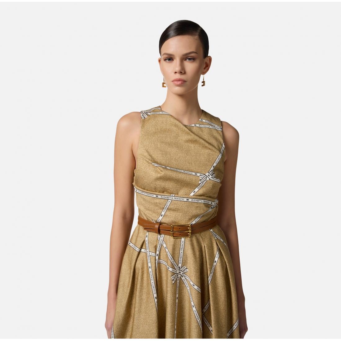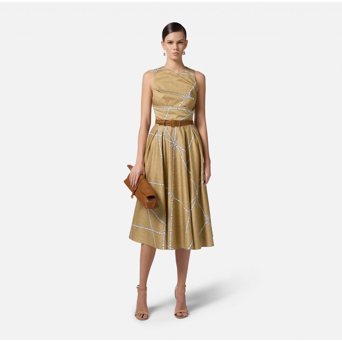 Abito in cotone. Il vestito è smanicato con colletto a vela e si distingue per la fantasia all-over che mixa i motivi iconici di collezione come i nastri con logo e la stampa effetto rafia. La gonna a ruota rende frizzante ogni movimento. Vestibilità regular.