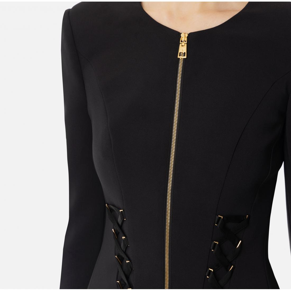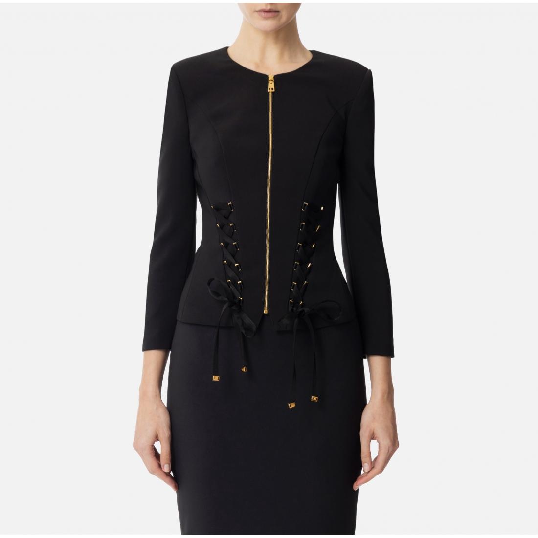 Giacca in doppio crêpe leggero con vestibilità slim. Si distingue per il motivo di lacci inseriti nei tagli, qui incrociati tramite anelle squadrate e terminanti con delicati fiocchi e finalini in metallo dorato. Chiusura con zip.