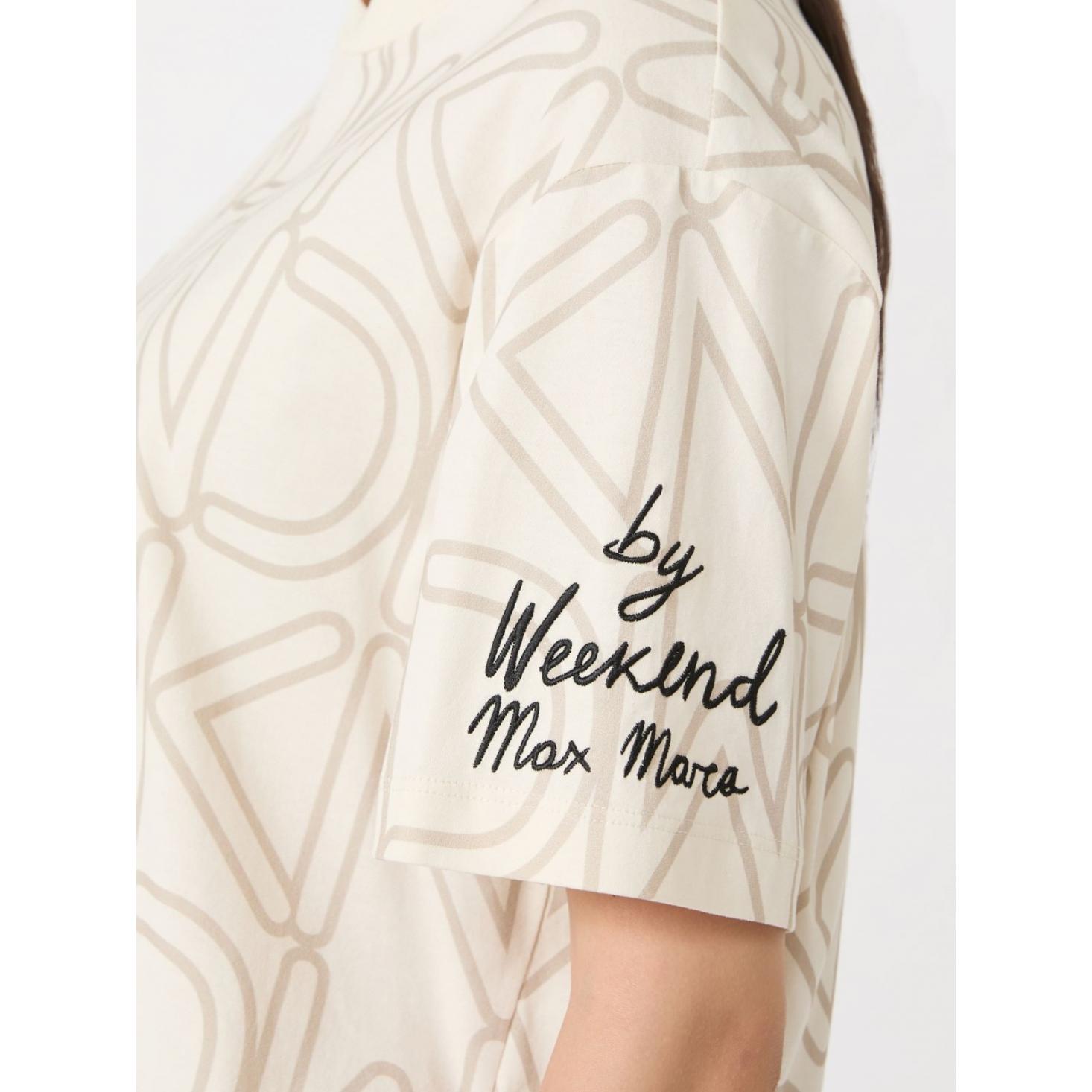 T-shirt basic personalizzata con motivo di stampa all over e ricamo sulla manica sinistra indossata.