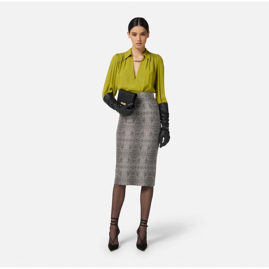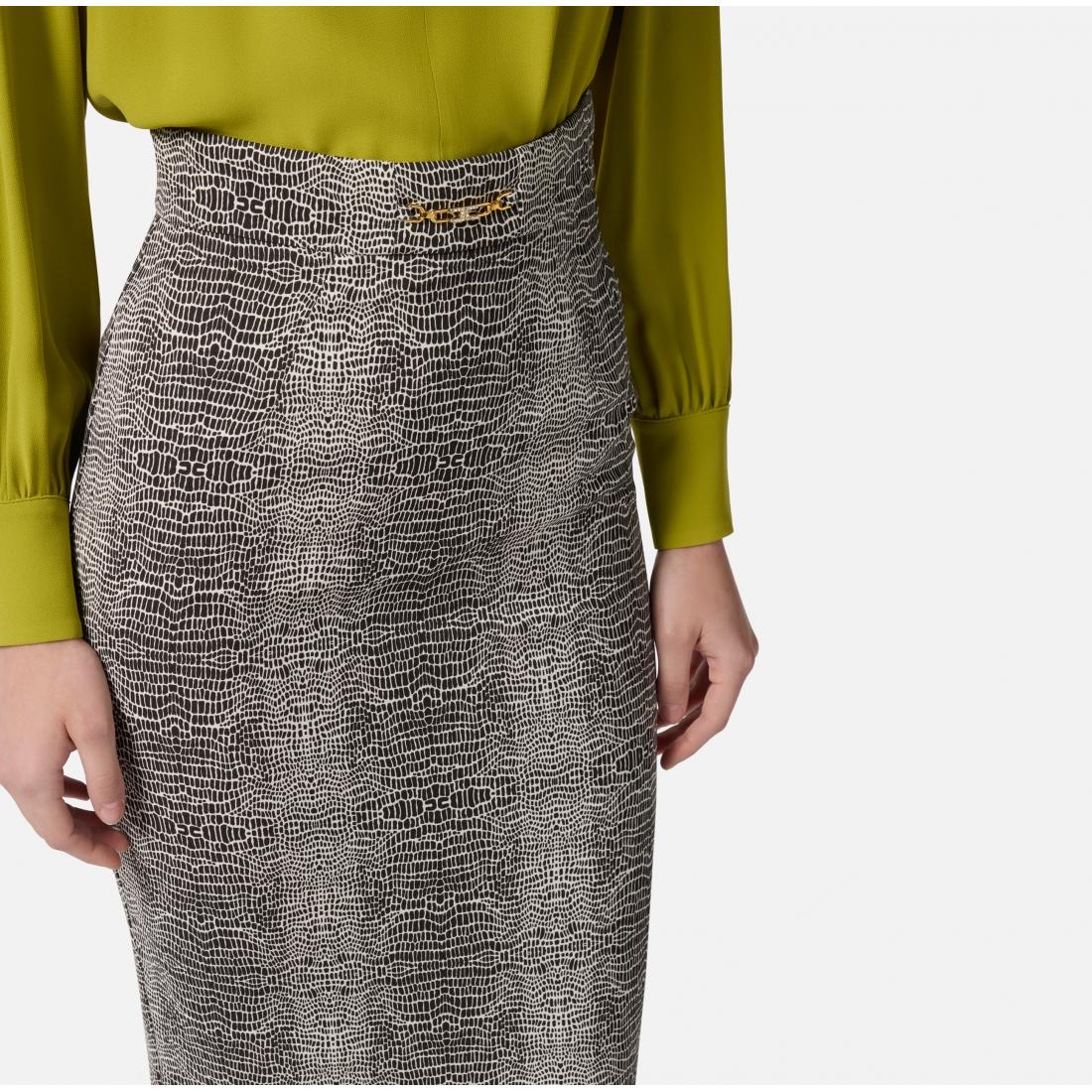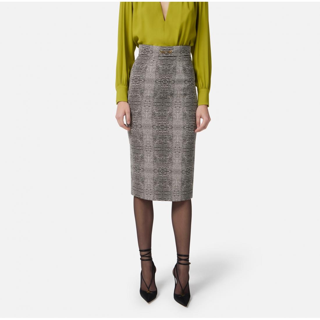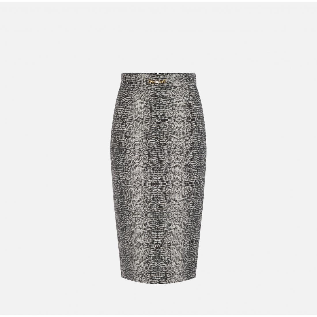 Gonna a tubino in viscosa dalla vestibilità aderente. Protagonista è la stampa con fantasia pitone, a donare movimento al capo con un pattern all-over. Il morsetto gioiello con logo in strass posizionato sul fascione illumina il punto vita.
