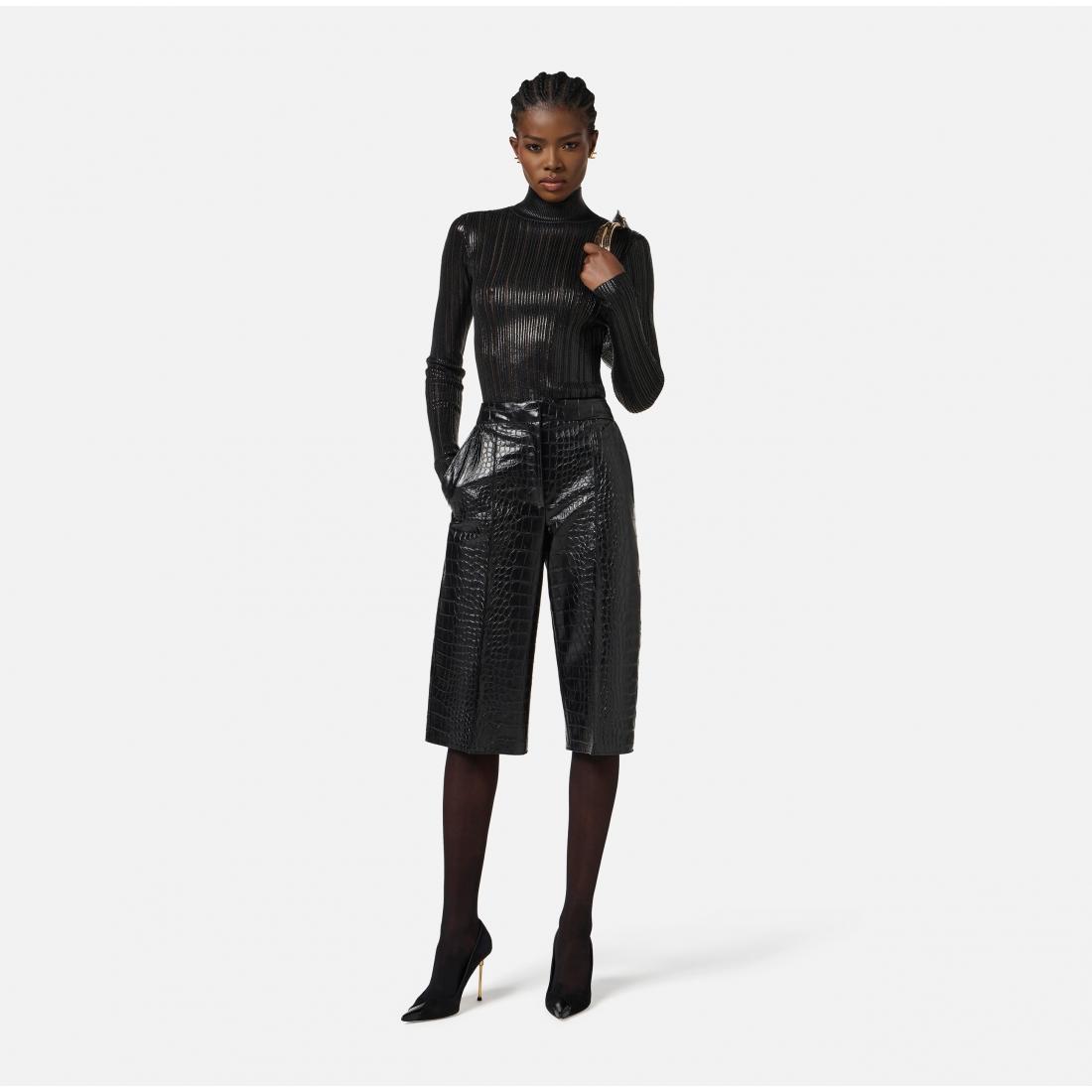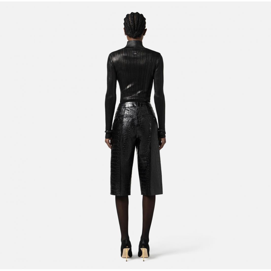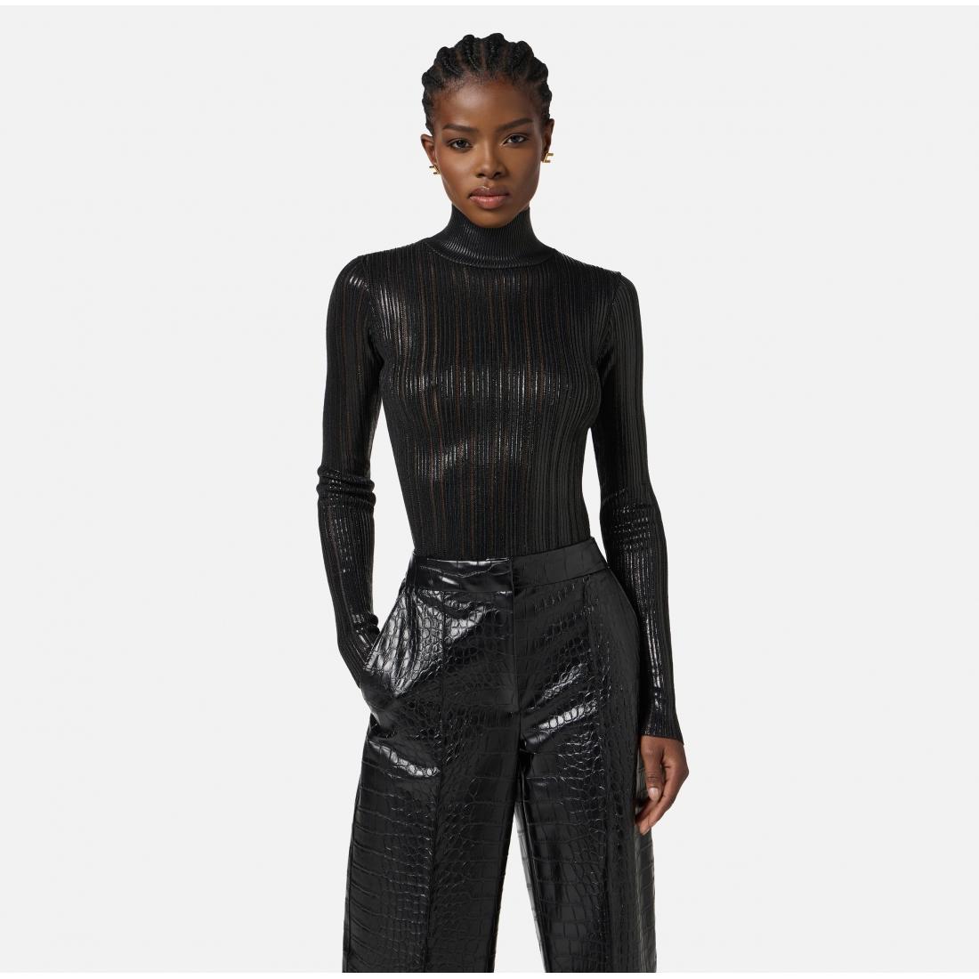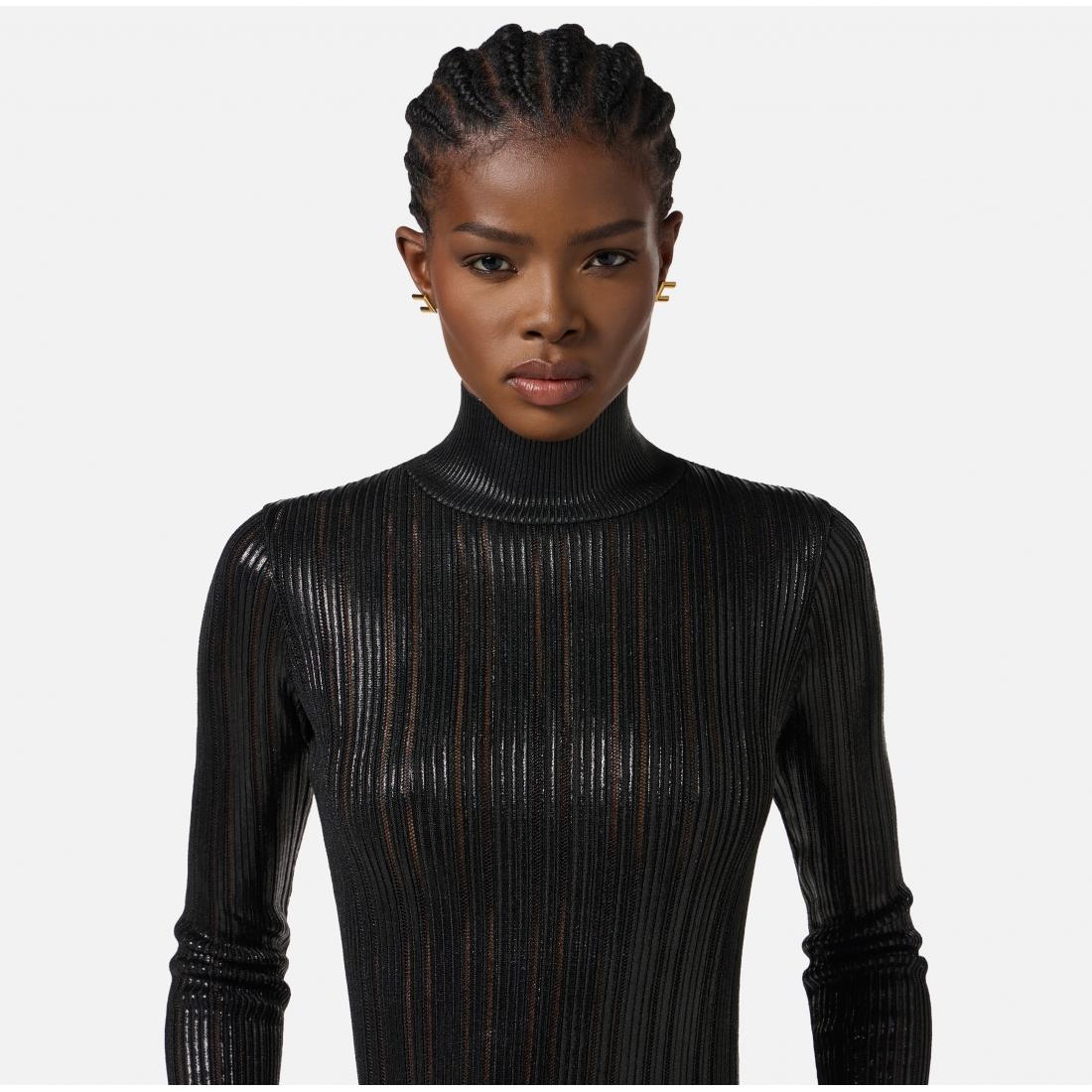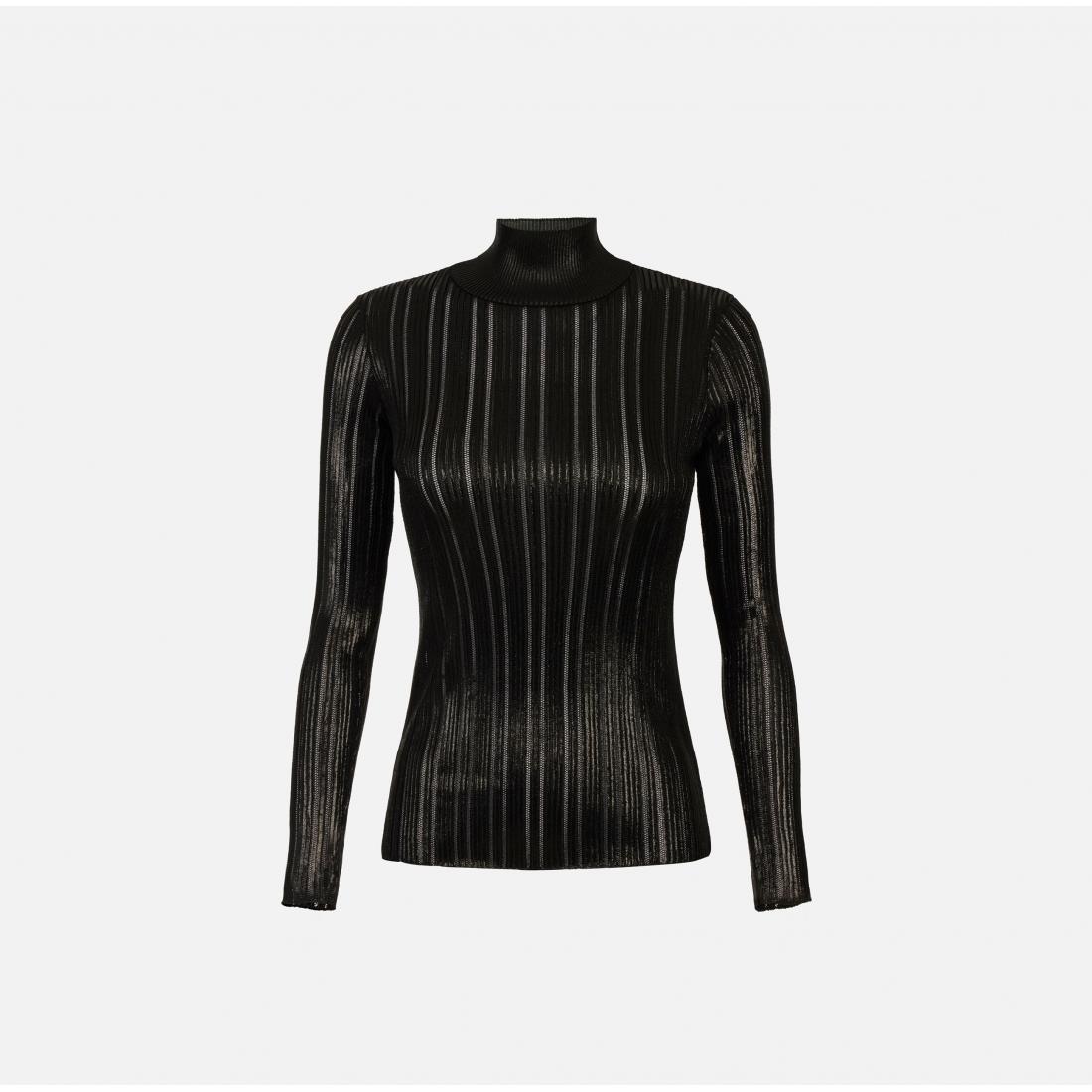 Maglia dalla texture laminata con vestibilità aderente. Con collo alto e maniche lunghe, si distingue per il finish metallico che dona riflessi inediti alla trama, definita dalla lavorazione a costine e dai delicati dettagli à jour. Etichetta con logo sul retro del collo.