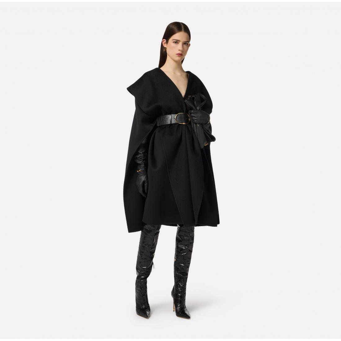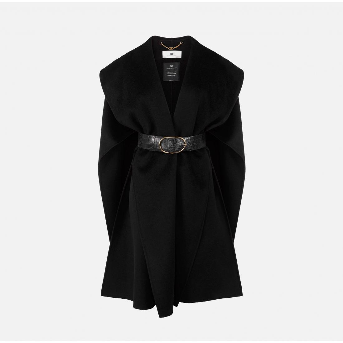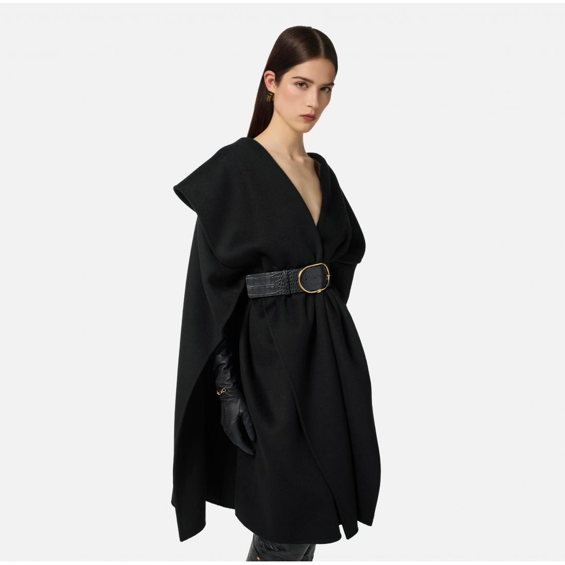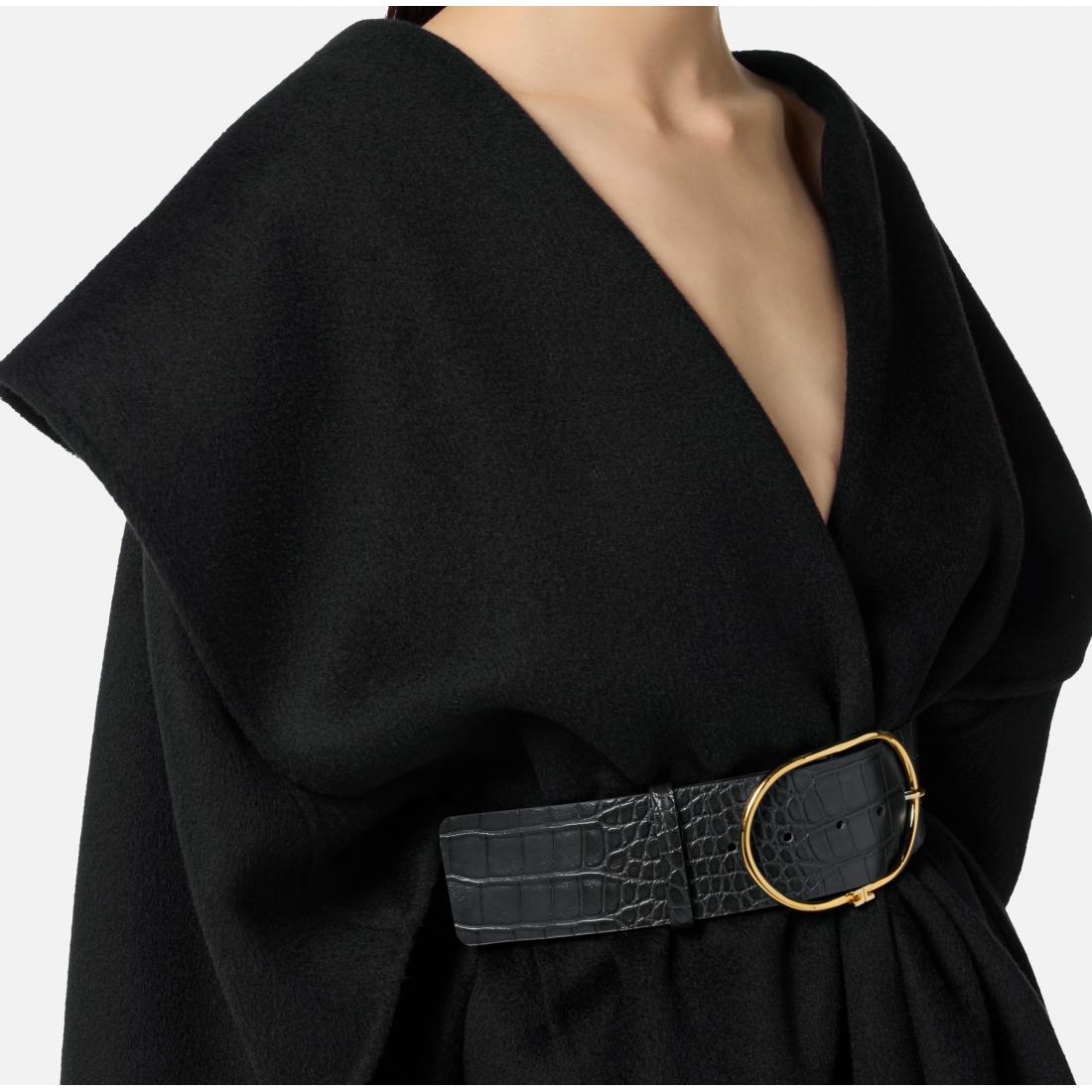 Mantella in panno di lana double sfoderata e dalla vestibilità over. I volumi avvolgenti sono definiti dalla cintura alta e in tono, con texture a stampa cocco che aggiunge carattere e completa di fibbia ad ardiglione con logo in metallo dorato.