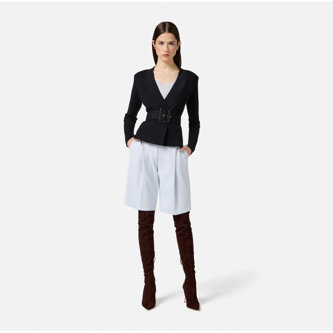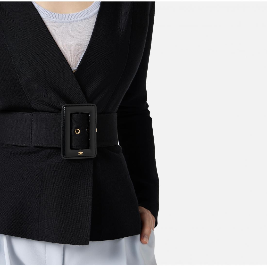 Giacca in maglia con lavorazione a punto stoffa. Il blazer ha spalle strutturate e si distingue per il rever realizzato in viscosa lucida che crea interessanti contrasti di texture. La cintura coordinata esalta la baschina al fondo capo, regalando una silhouette decisa e definita. Vestibilità slim.