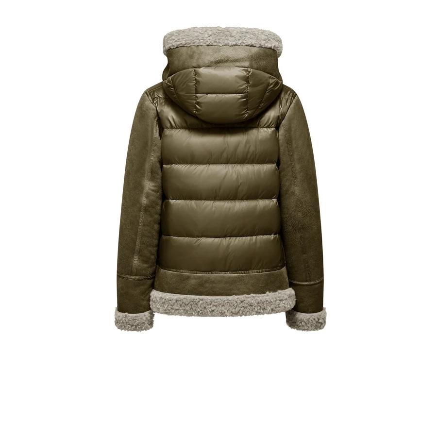 Design Contemporaneo e materiali di qualità Questa giacca corta da donna con cappuccio fisso si distingue per un design moderno e dettagli curati. Il davanti e il cappuccio sono realizzati in tessuto sintetico effetto scamosciato con imbottitura in pelliccia riccia, che richiama il classico shearling in chiave contemporanea. La schiena e le maniche, in nylon trapuntato, creano un contrasto materico che valorizza la linea pulita. Un capo versatile, ideale per aggiungere un tocco contemporaneo al guardaroba autunnale e invernale.