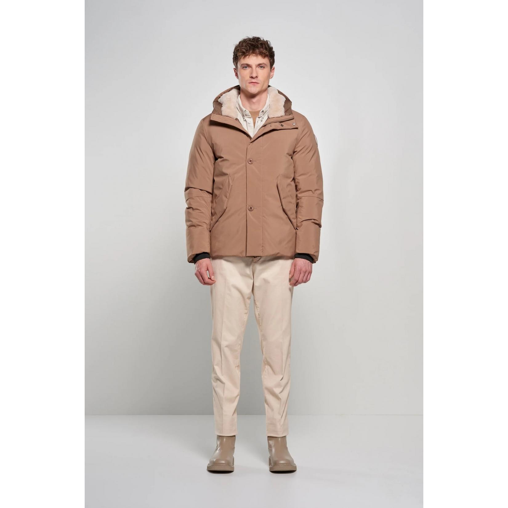 L’imbottitura PrimaLoft® ThermoPlume in materiali riciclati assicura un isolamento termico efficace Il tessuto double face a tre strati con membrana TPU offre protezione waterproof e windproof La fodera interna alterna pelliccia sintetica corta sul busto e nylon imbottito sulle maniche Il taglio regular fit e il cappuccio fisso donano una vestibilità versatile per ogni occasione urbana Tasche frontali e interne con zip e bottoni in poliestere custodiscono con eleganza gli oggetti essenziali