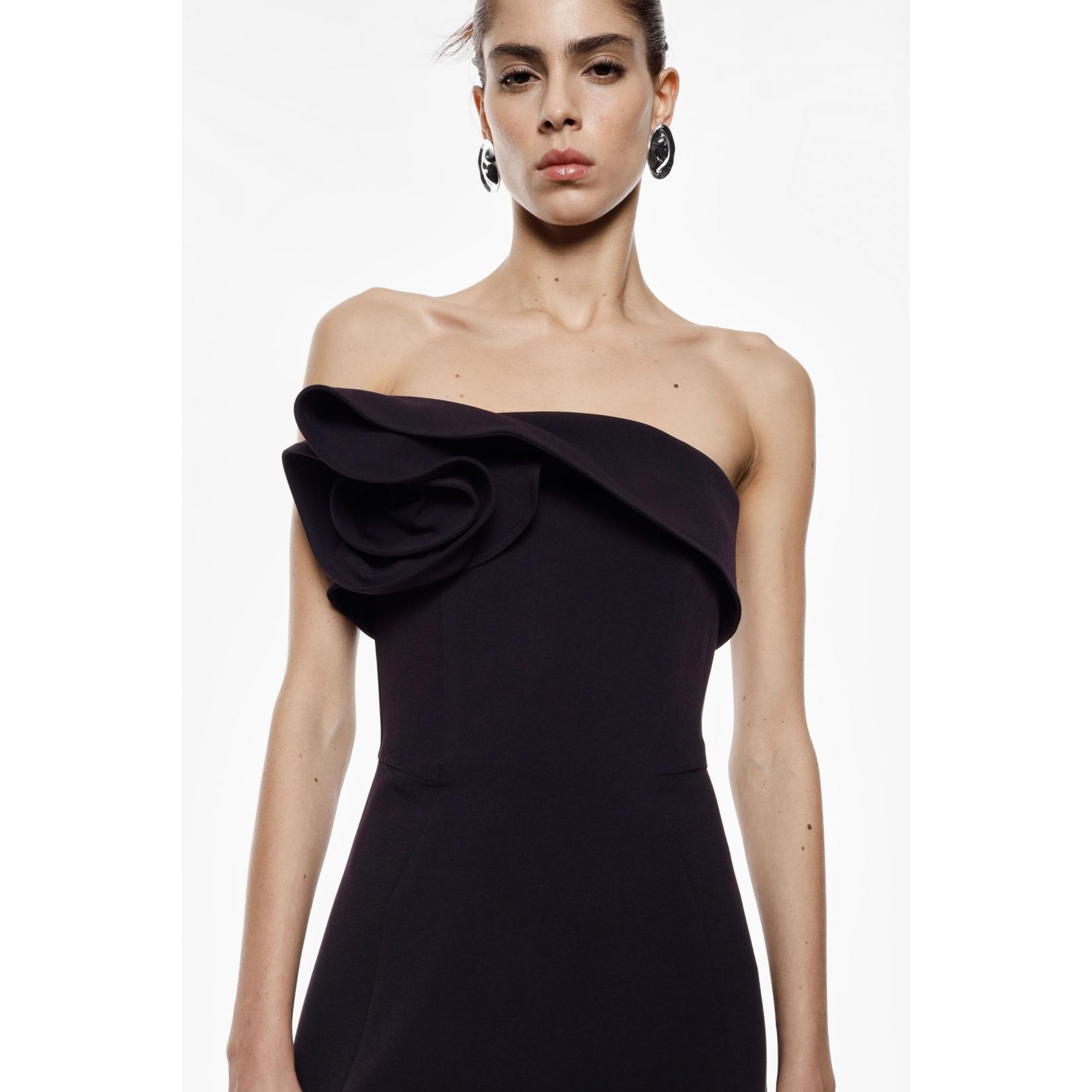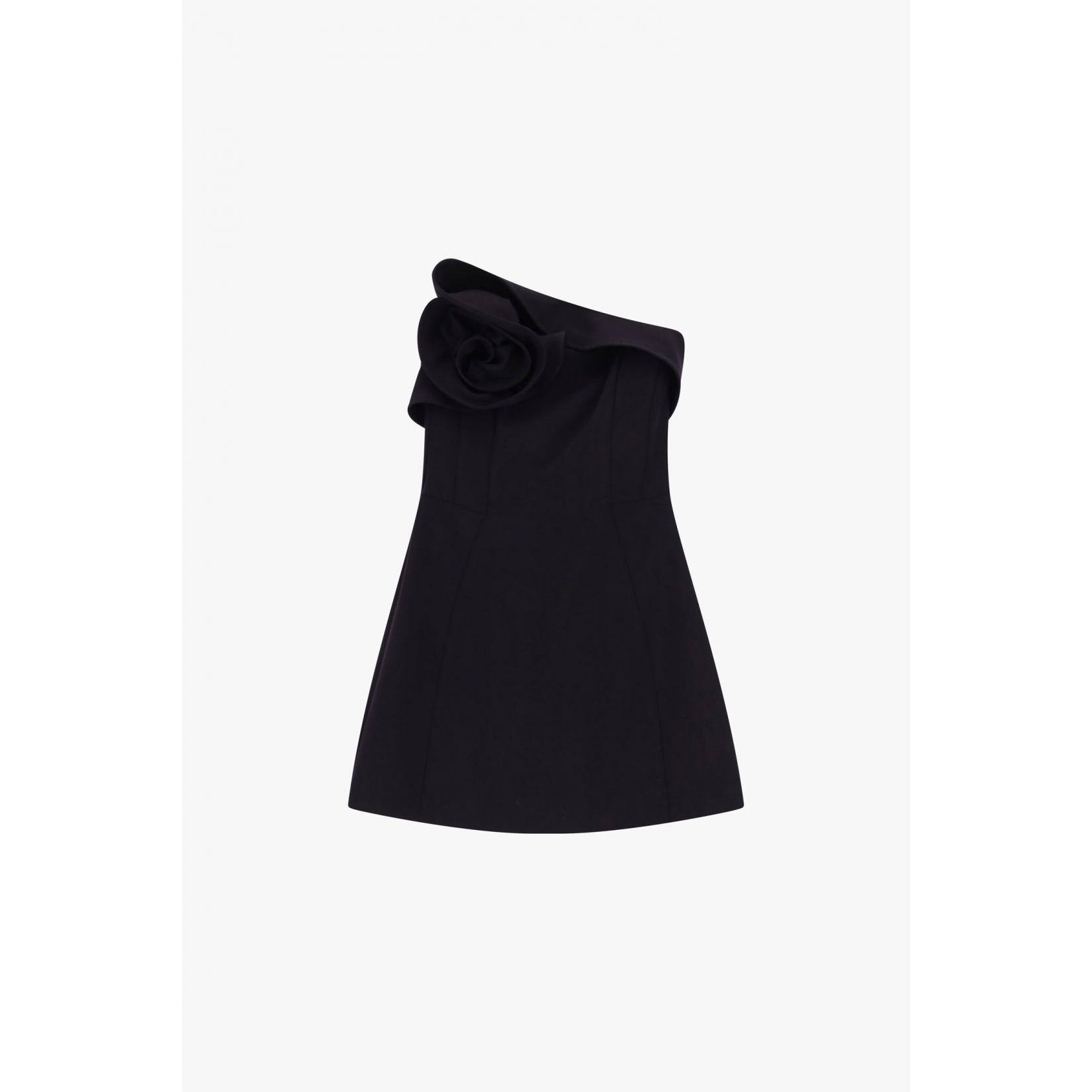 Interpretazione distintiva degli ultimi trend, questo abito corto presenta una costruzione sartoriale con scollo asimmetrico arricchito da un imponente elemento floreale. Il design essenziale valorizza la silhouette, offrendo ampia possibilità di espressione personale tra accessori contemporanei e look sofisticati.