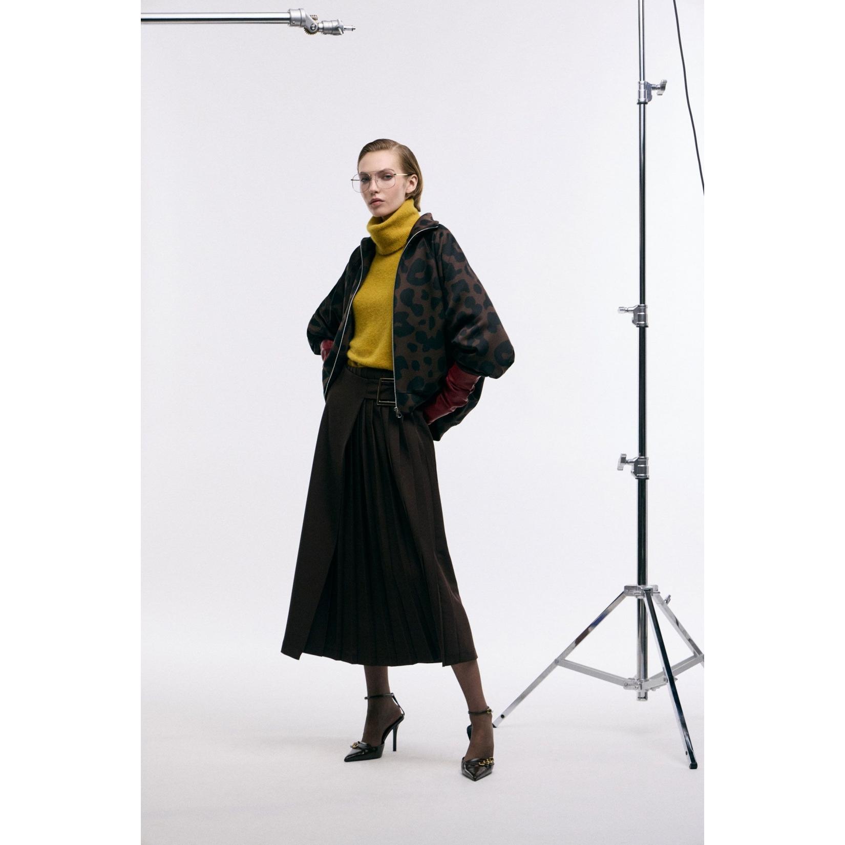 Struttura raffinata dal taglio midi, presenta una silhouette asimmetrica arricchita da pieghe nette laterali e una cintura con fibbia quadrata in metallo. Pensata per una versatilità sofisticata, consente combinazioni che valorizzano l’individualità e l’attitudine contemporanea di chi desidera esprimere creatività nel proprio guardaroba.