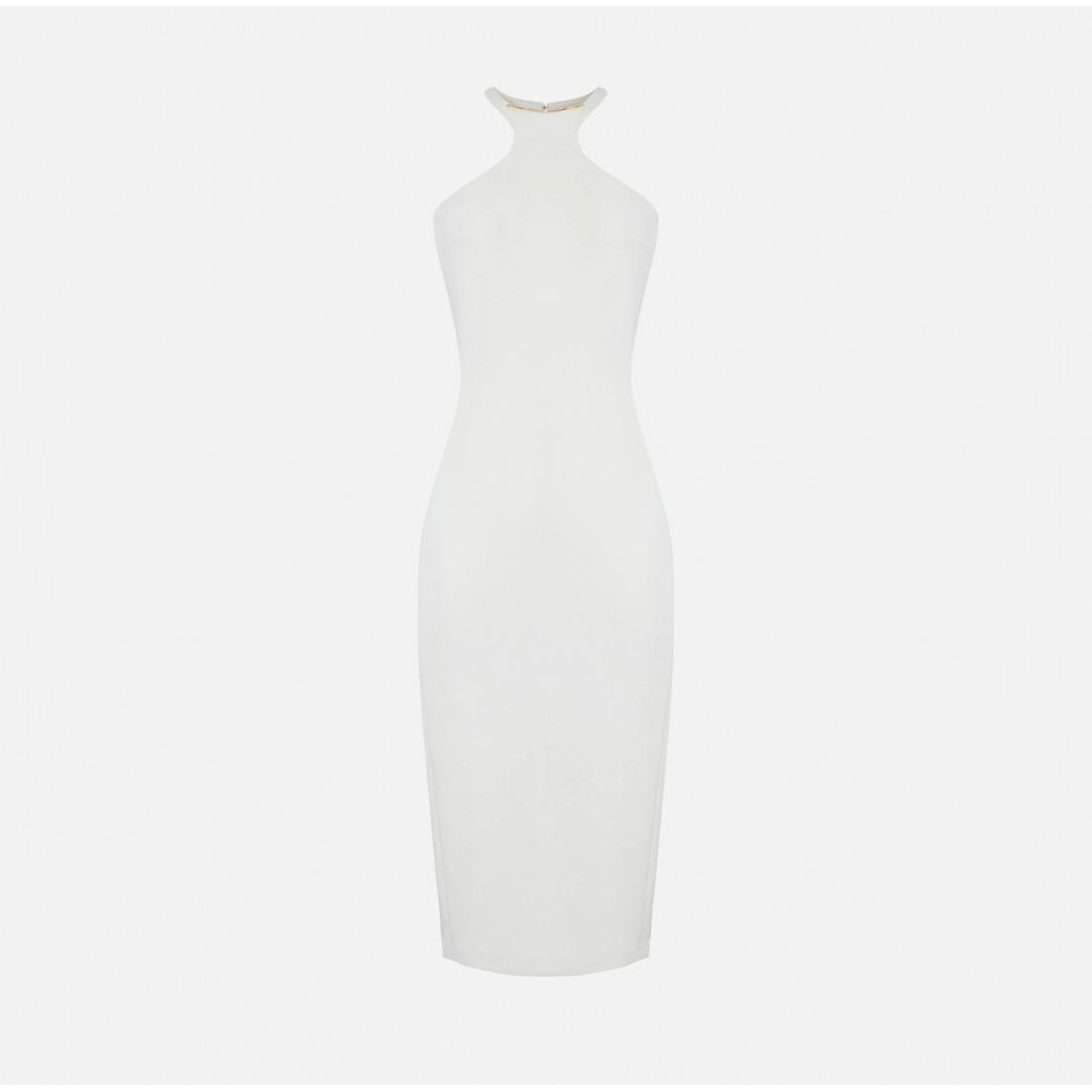 Abito in crêpe leggero dalla vestibilità aderente. Il vestito ha gonna midi e scollo olimpionico che mette in evidenza le spalle. Una placca in metallo dorato con logo lo impreziosisce sullo scollo.