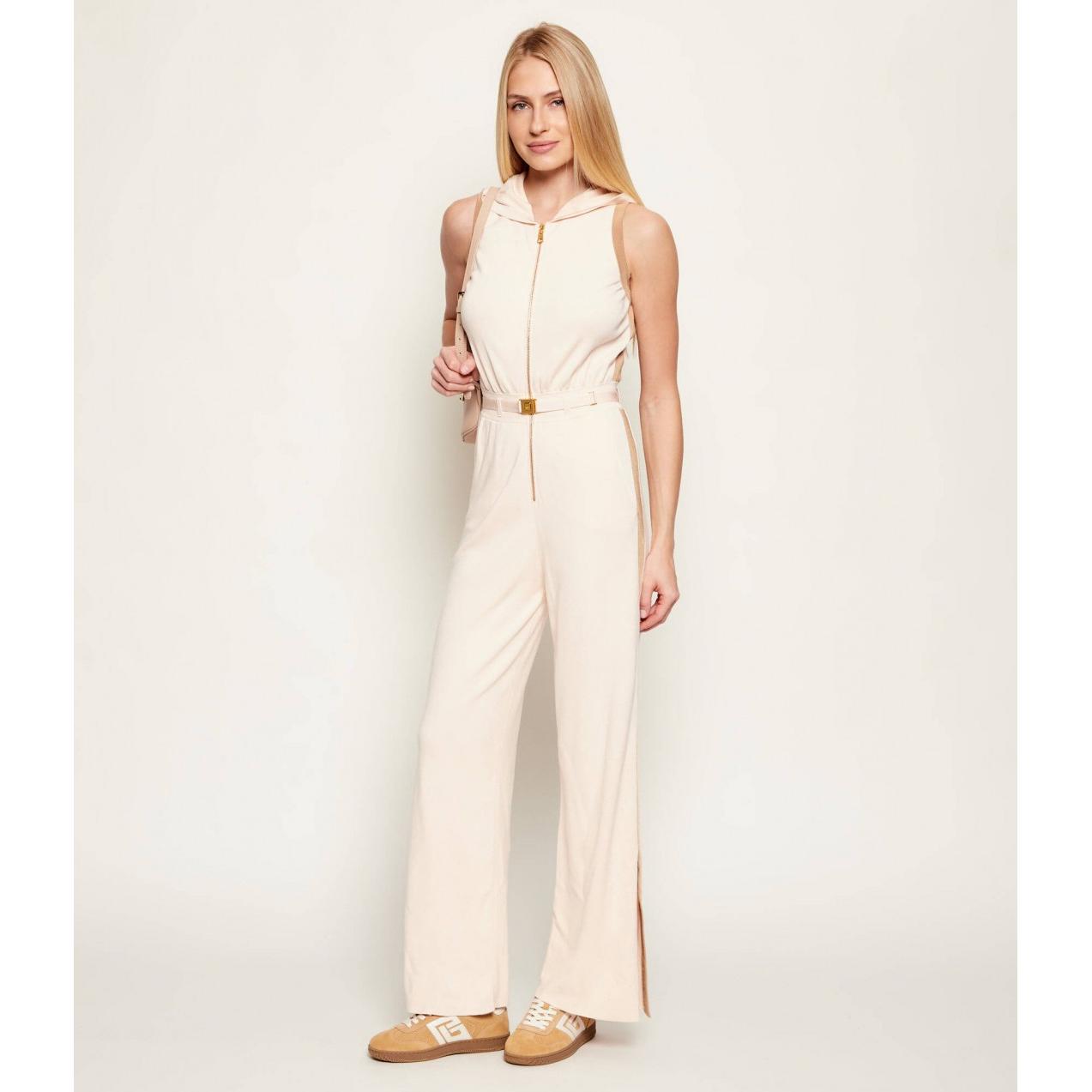Tuta in maglia dalla vestibilità regular. Ha collo con cappuccio e pantaloni a palazzo con cintura in vita. Si distingue per le bande in viscosa lucida e per la lavorazione jacquard applicata ai loghi sugli spacchi laterali. I colori a contrasto enfatizzano il design grafico del capo.