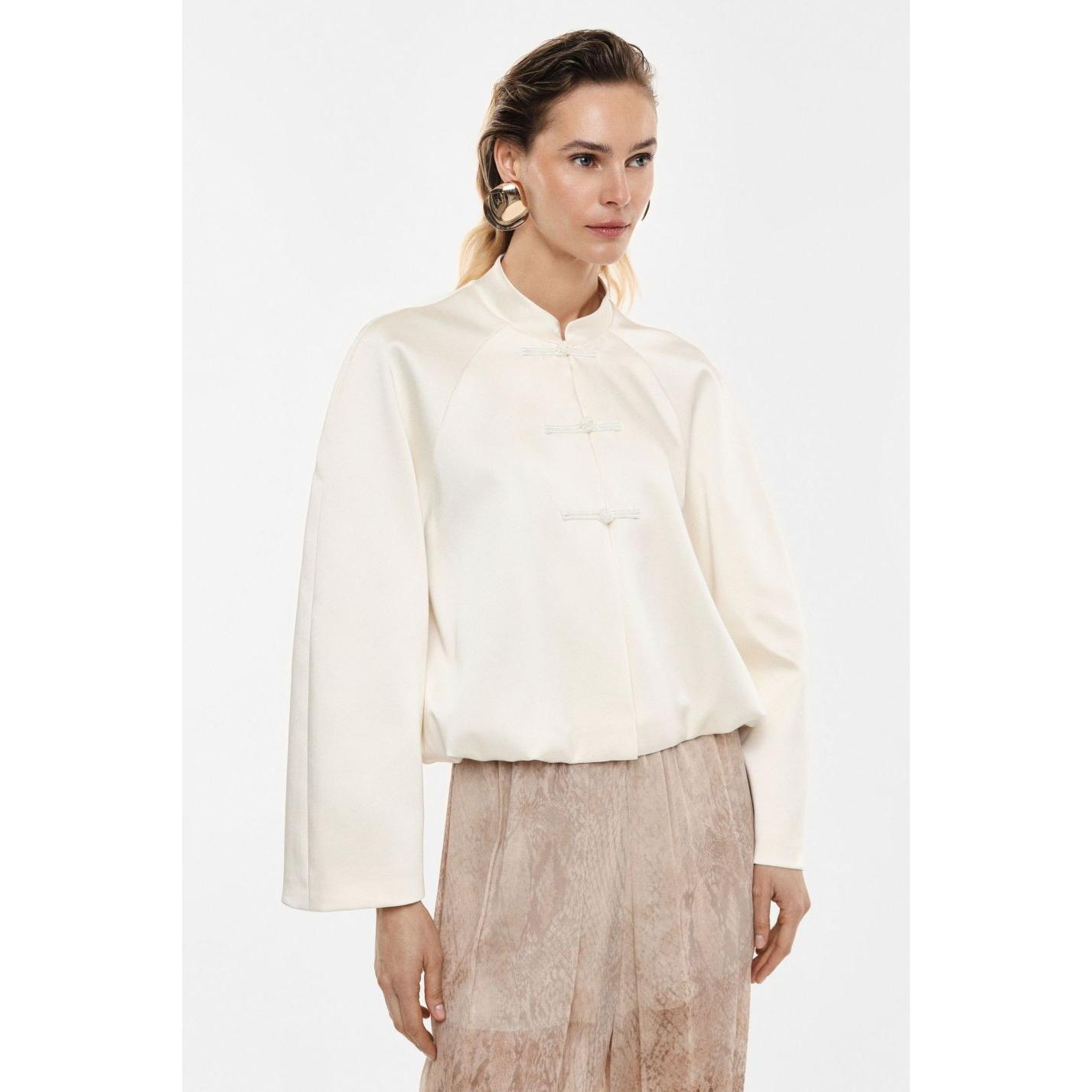 Taglio corto e maniche ampie caratterizzano questa outer jacket dal design essenziale, arricchita da una chiusura frontale con laccetti a nodo per uno stile distintivo. L’assenza di dettagli superflui ne esalta la linea pulita, ideale per interpretazioni personalizzate e abbinamenti versatili in contesti cittadini.