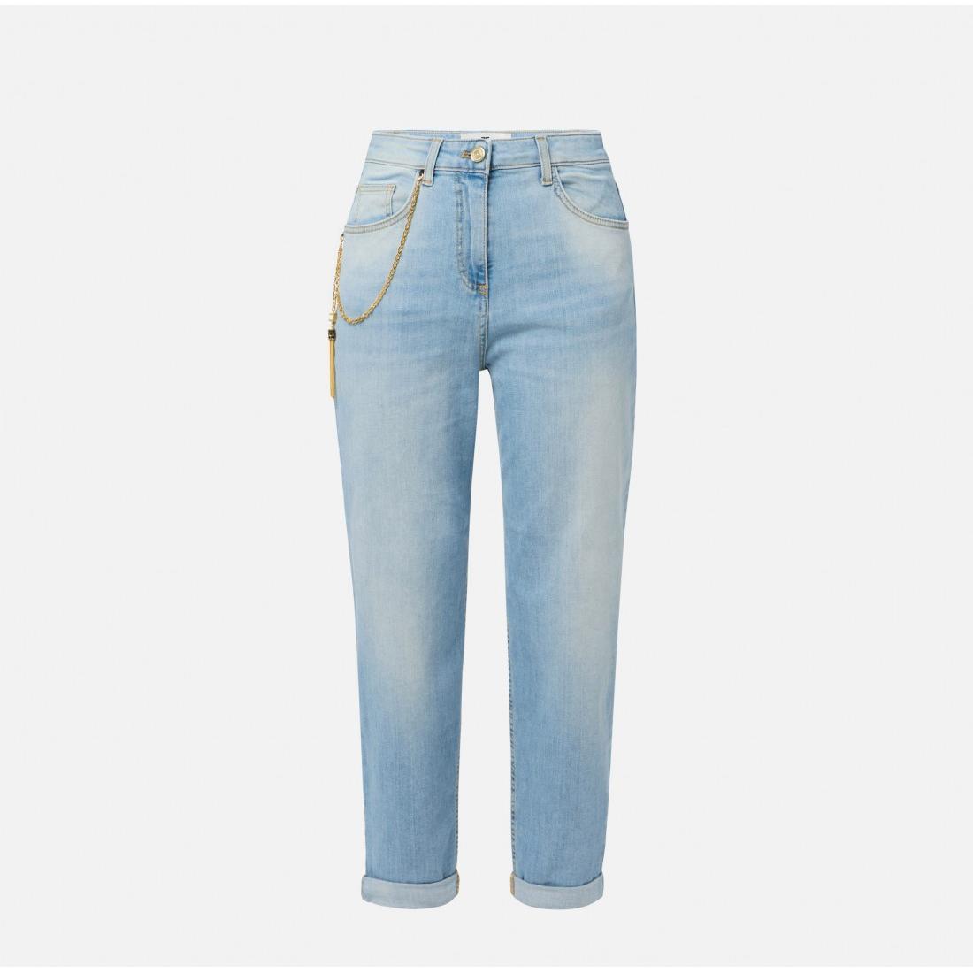 Pantaloni cinque tasche in denim dal lavaggio chiaro. Il capo è costruito con vita regular e gamba boyfriend. Un tocco di luce è dato dalla catena gioiello con logo applicata sul lato. A completare, bottone ed etichetta con logo.