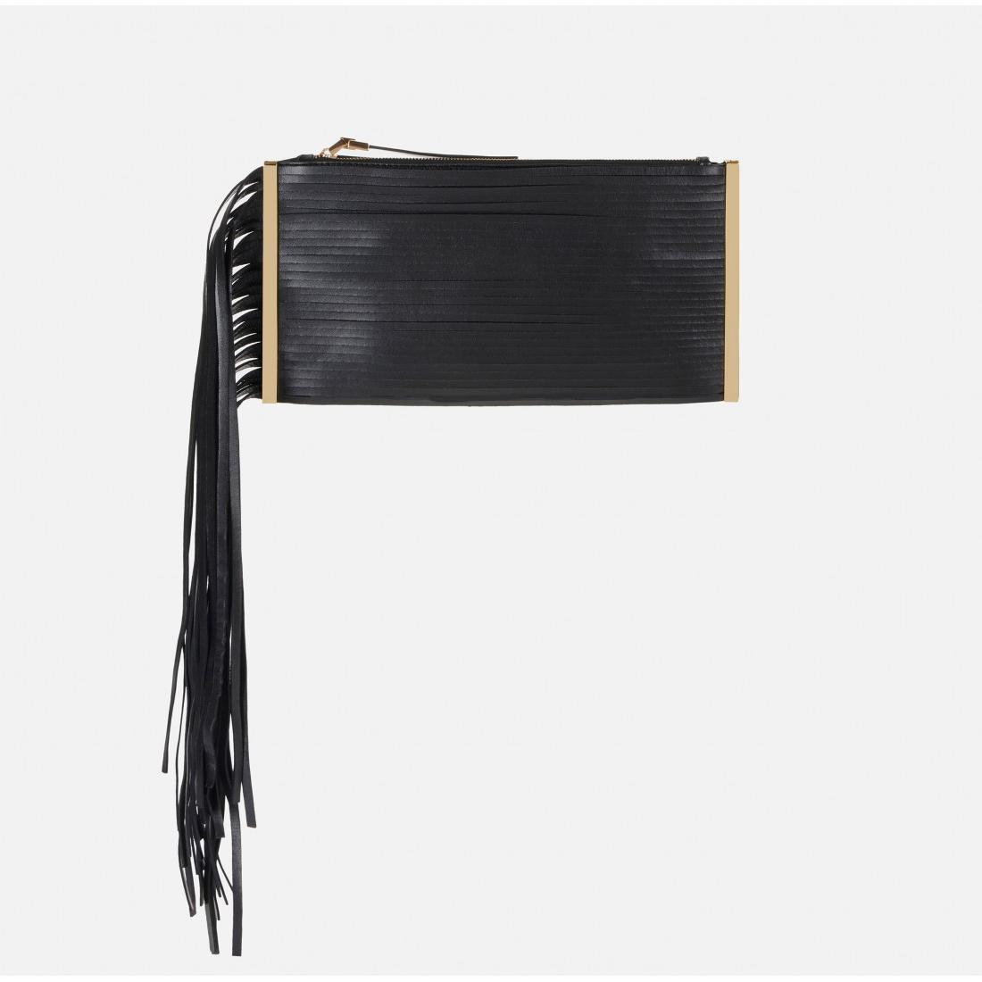 Borsa in pelle nappata con tracolla in catena. Si distingue per la trama a frange e per le placche in metallo dorato sui lati, ad aggiungere luce. Chiusura con zip.