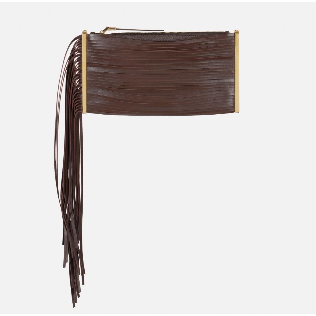Borsa in pelle nappata con tracolla in catena. Si distingue per la trama a frange e per le placche in metallo dorato sui lati, ad aggiungere luce. Chiusura con zip.