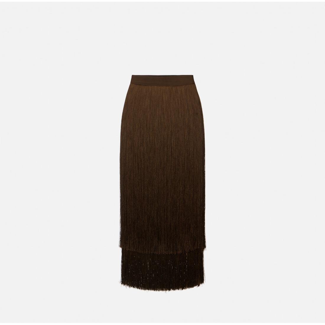 Gonna con fascione in gros-grain da cui si liberano applicazioni di frange che cadono libere e avvolgono la silhouette, per un movimento ipnotico e sensuale.