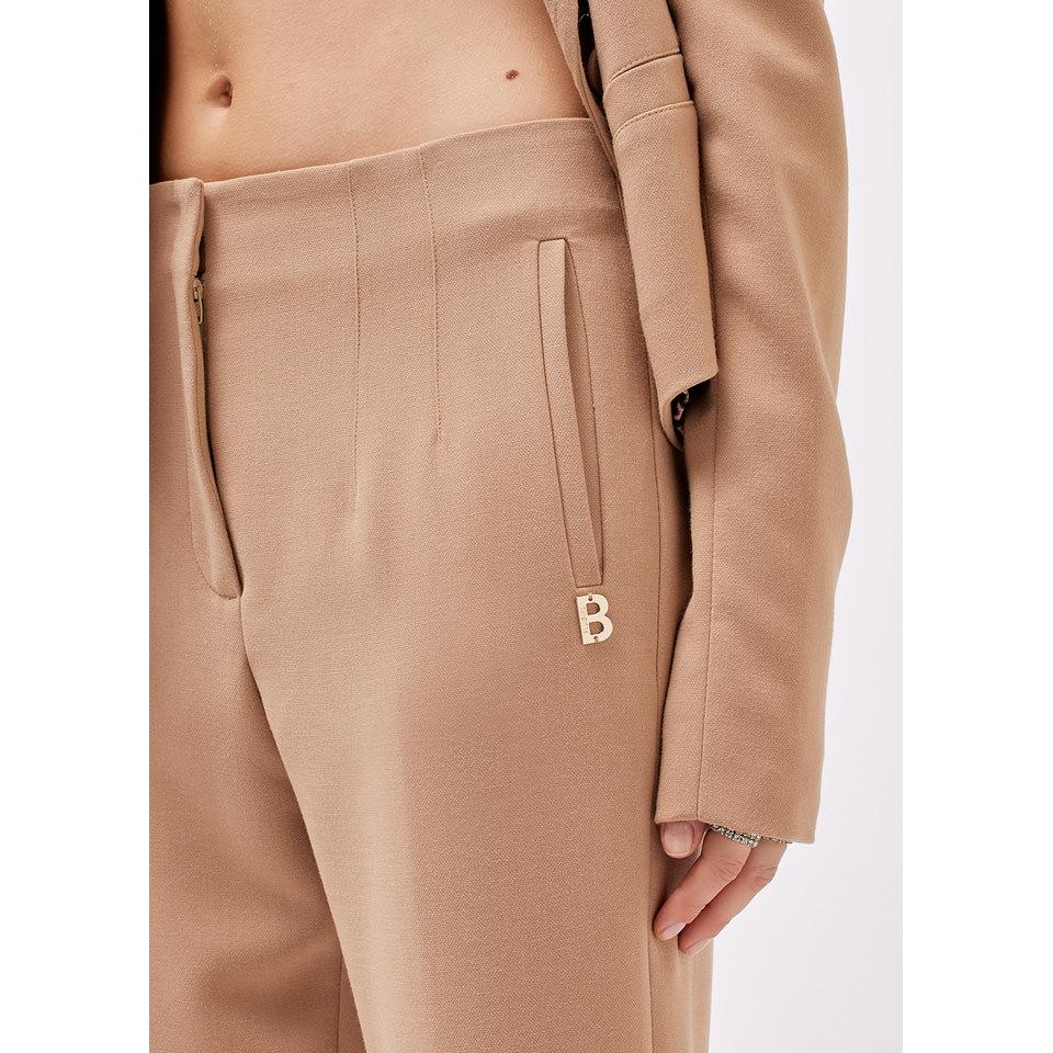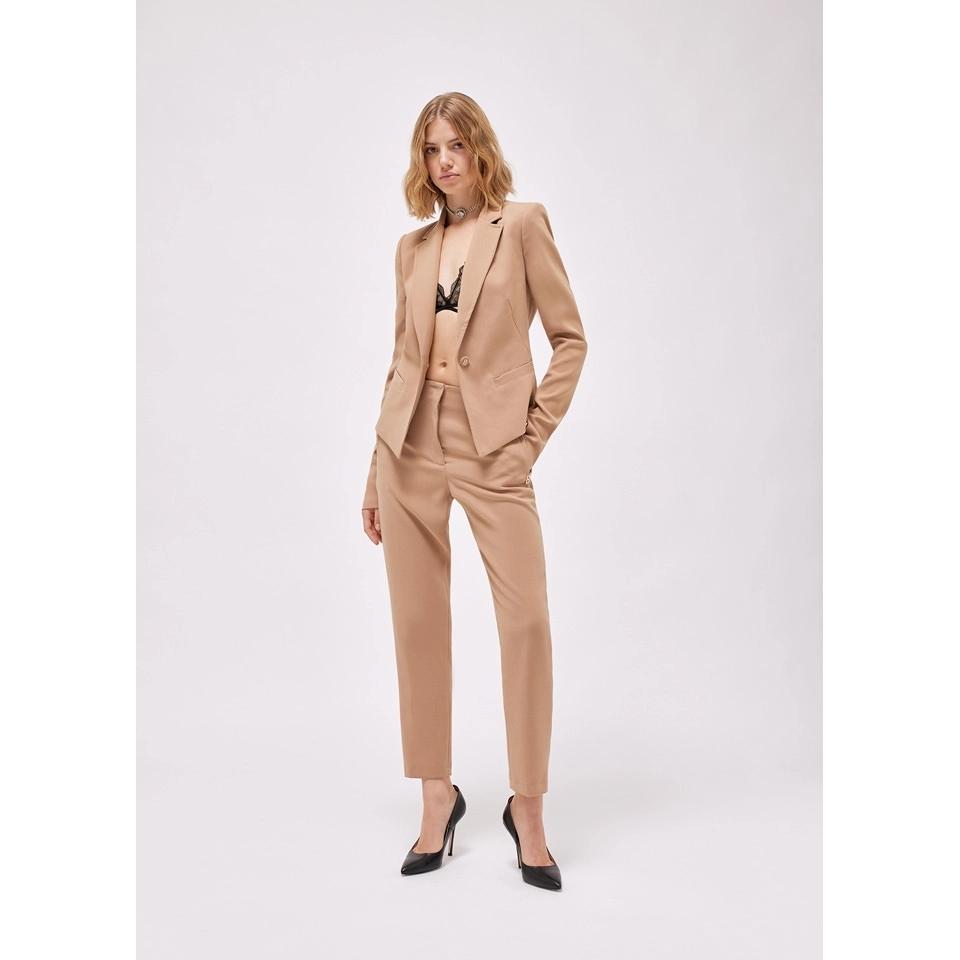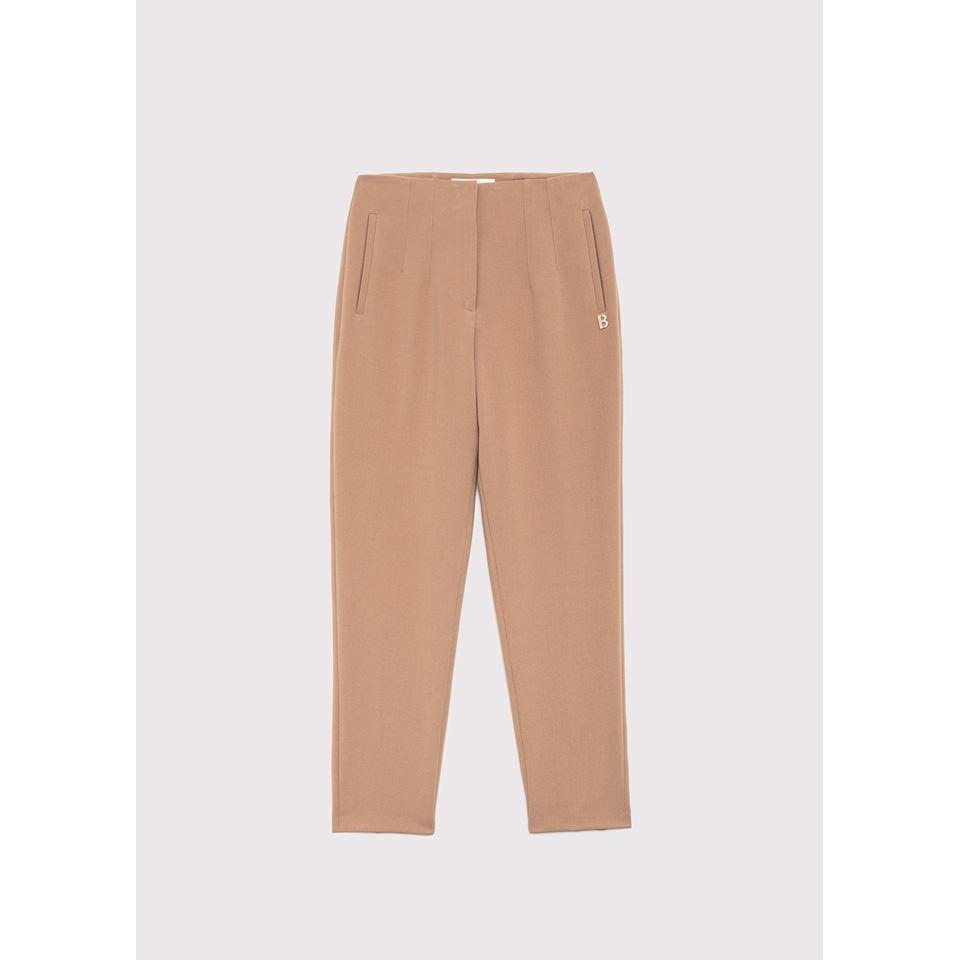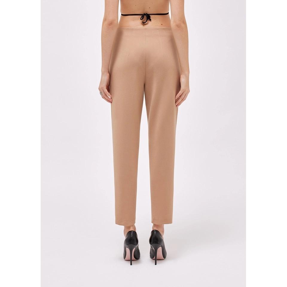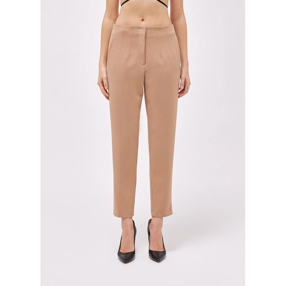 Pantaloni a vita alta in misto viscosa mano calda con nervature che definiscono il fit. Hanno linea a sigaretta, tasche a filetto, zip coperta da patta con gancio a uomo. Fascino multitasking e sartoriale da abbinare con facilità. Composizione: 63% poliestere 32% viscosa 5% elastan. Colori: beige