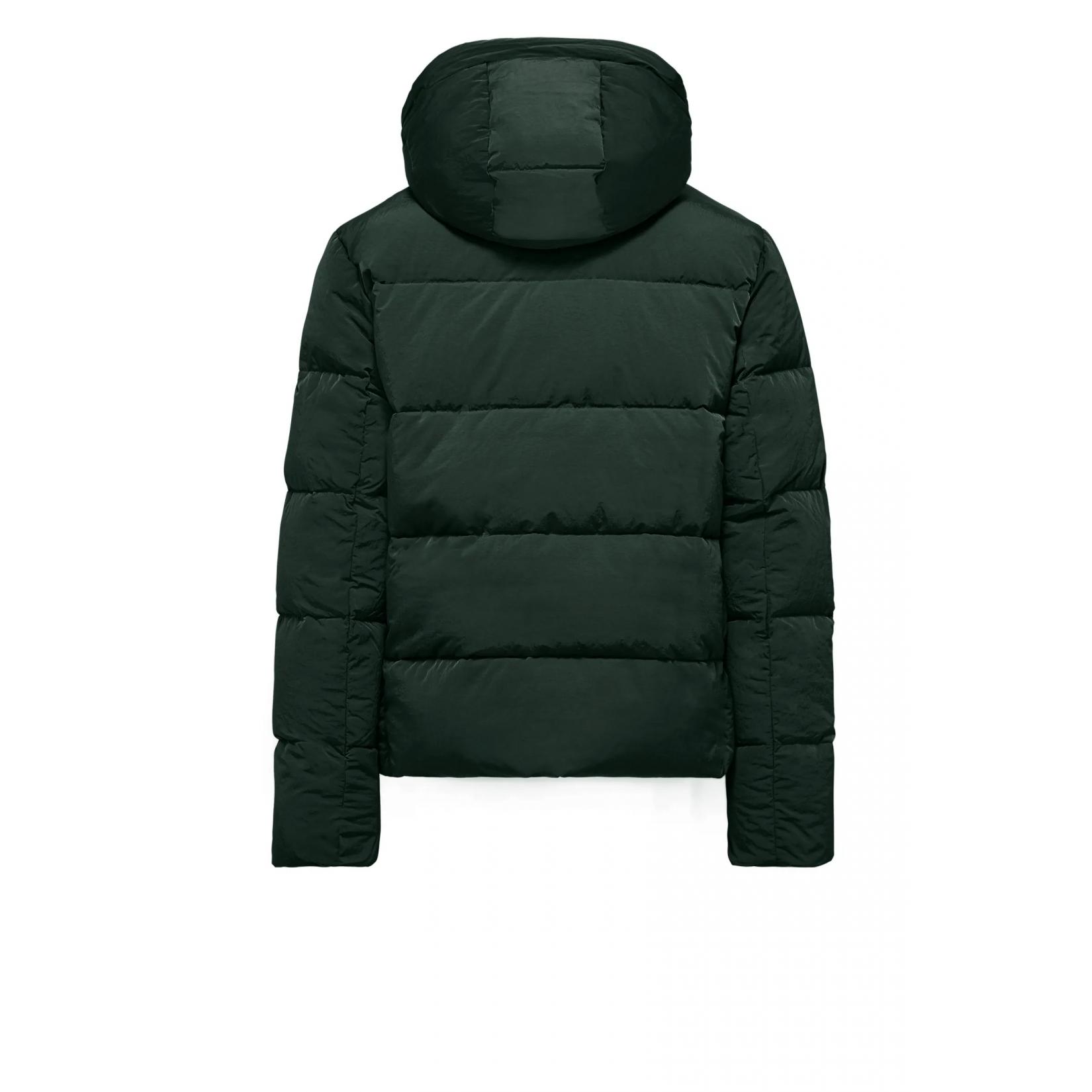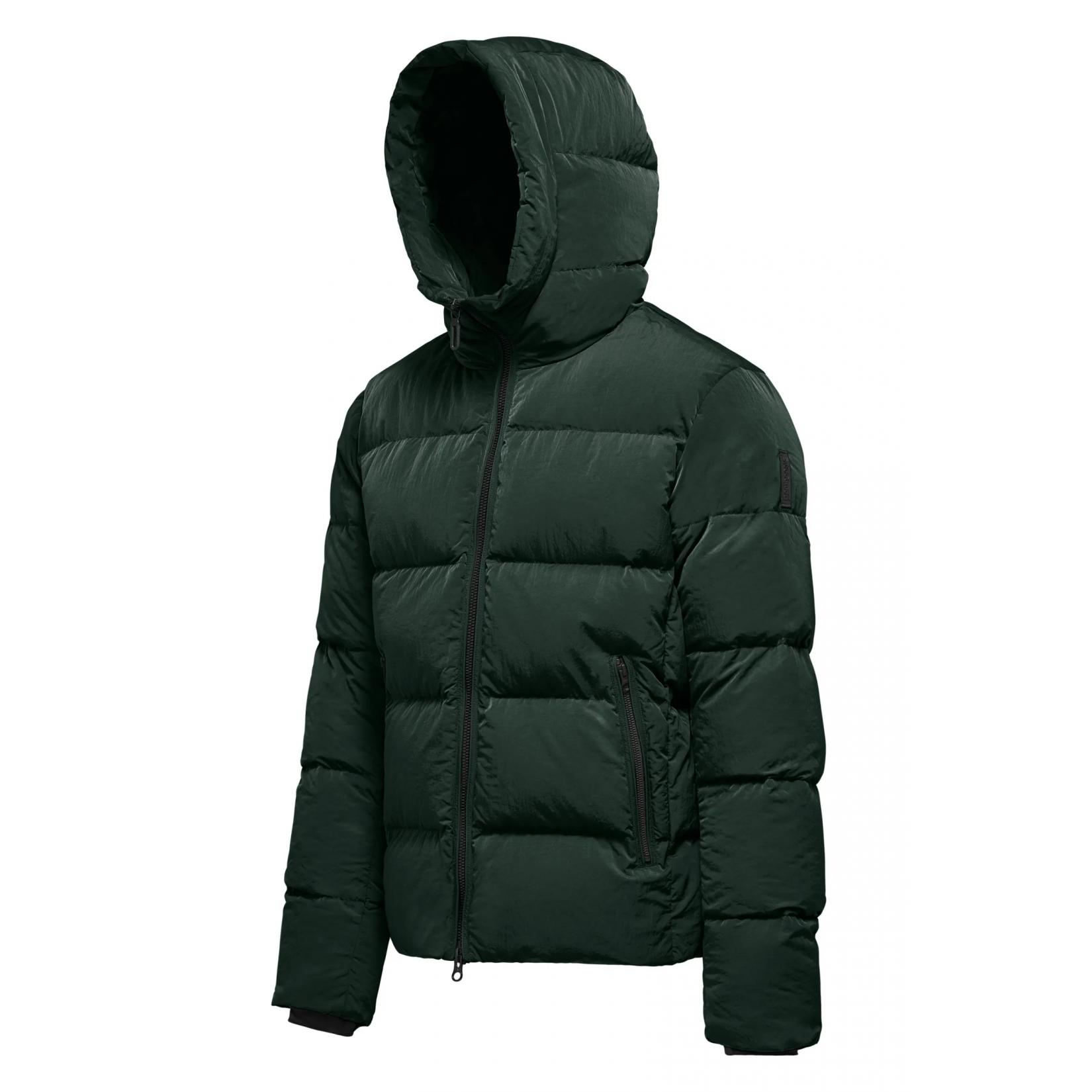 Nylon con spalmatura sul rovescio, effetto stropicciato. Idrorepellente. Antivento. Antipiuma. Imbottitura vera piuma 90:10 (700 fill power). Chiusura con zip centrale. Ampio cappuccio con coulisse. Due tasche frontali con zip e taschino inserito sulla manica, due taschini interni. Polsini interni in lycra. ColoreDeep Forest Green