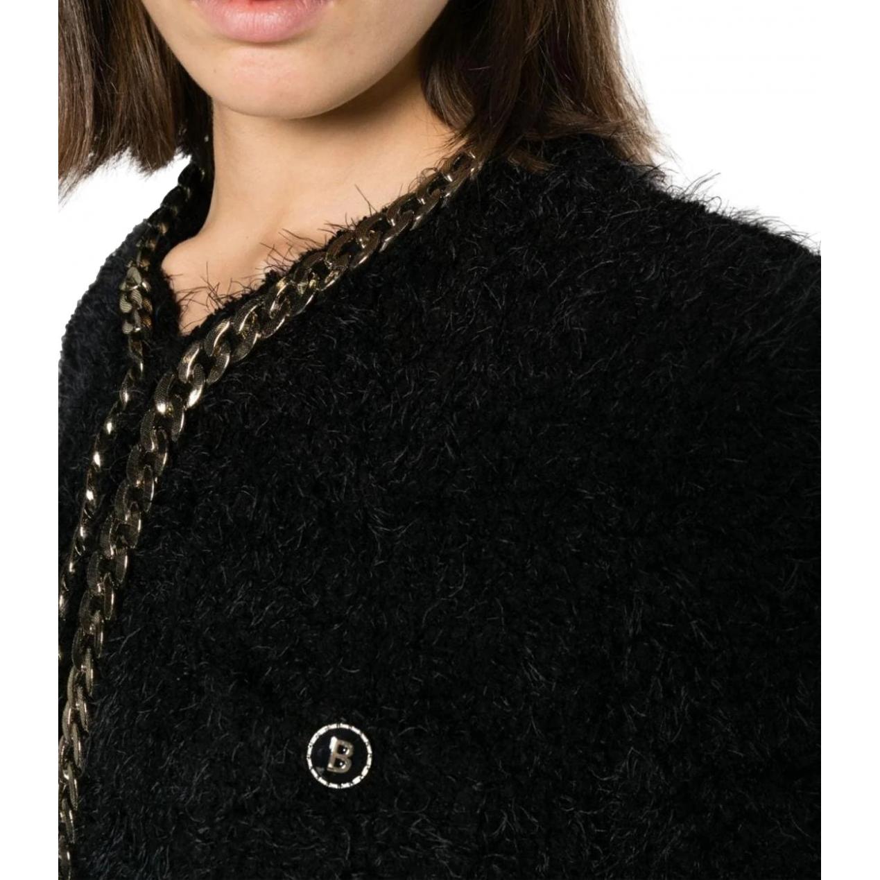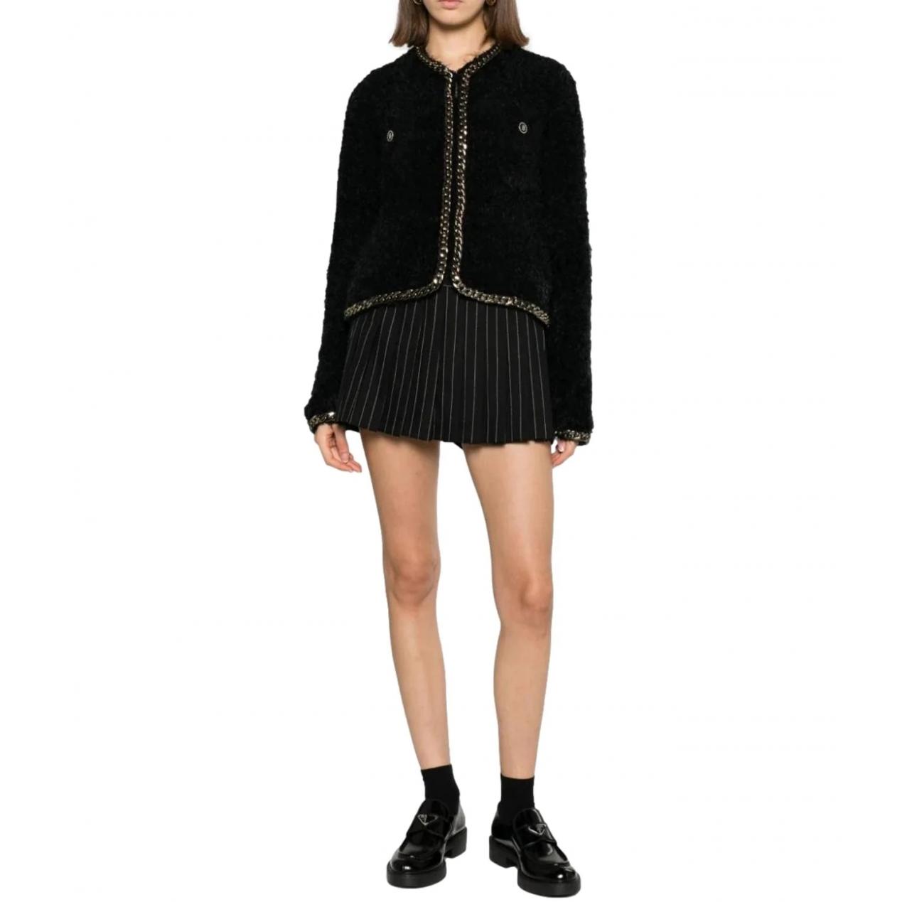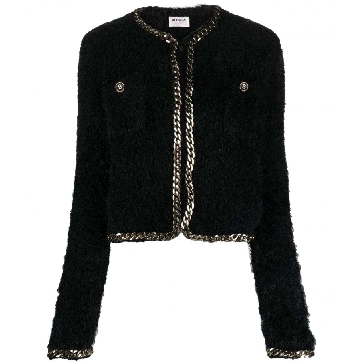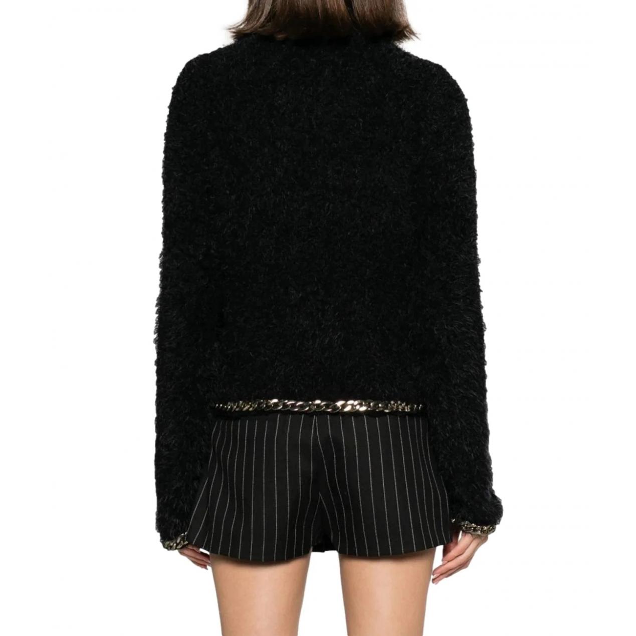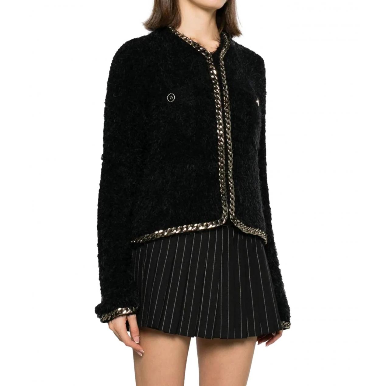 CARDIGAN MODELLO COREANA IN FILO EFFETTO BOUCLÉ CON PROFILI RIFINITI DA CATENA E TULLE IN TONO. LINEA REGULAR, MANICHE LUNGHE, TASCHINI CON BOTTONI LOGATI SMALTATI IN TONO, CHIUSURA CON GANCI. DESIGN RAFFINATO PER COMPLETARE LO STILE DEI LOOK QUOTIDIANI E DEL WORKWEAR. COMPOSIZIONE: 71% POLIESTERE, 29% POLIAMMIDE