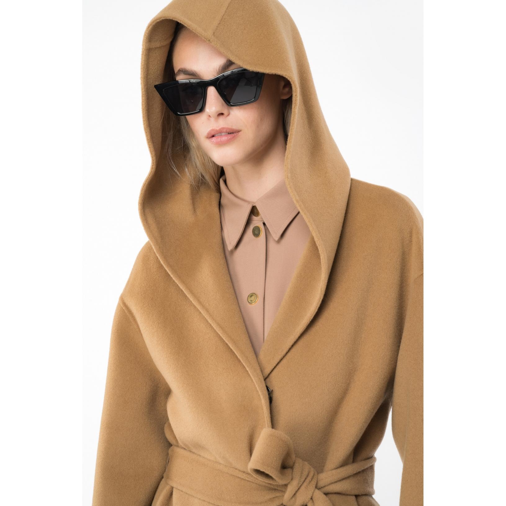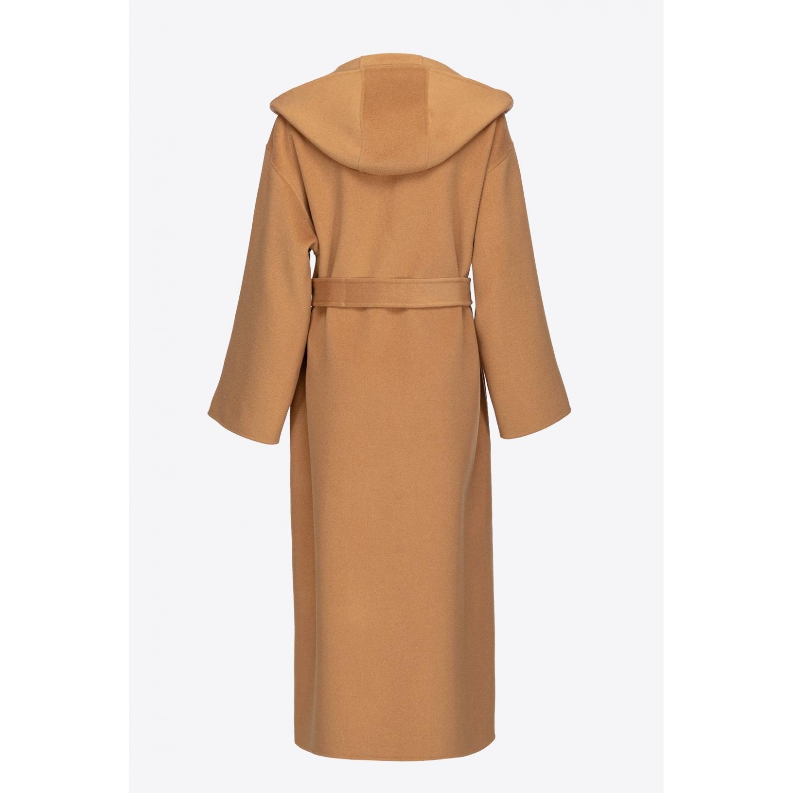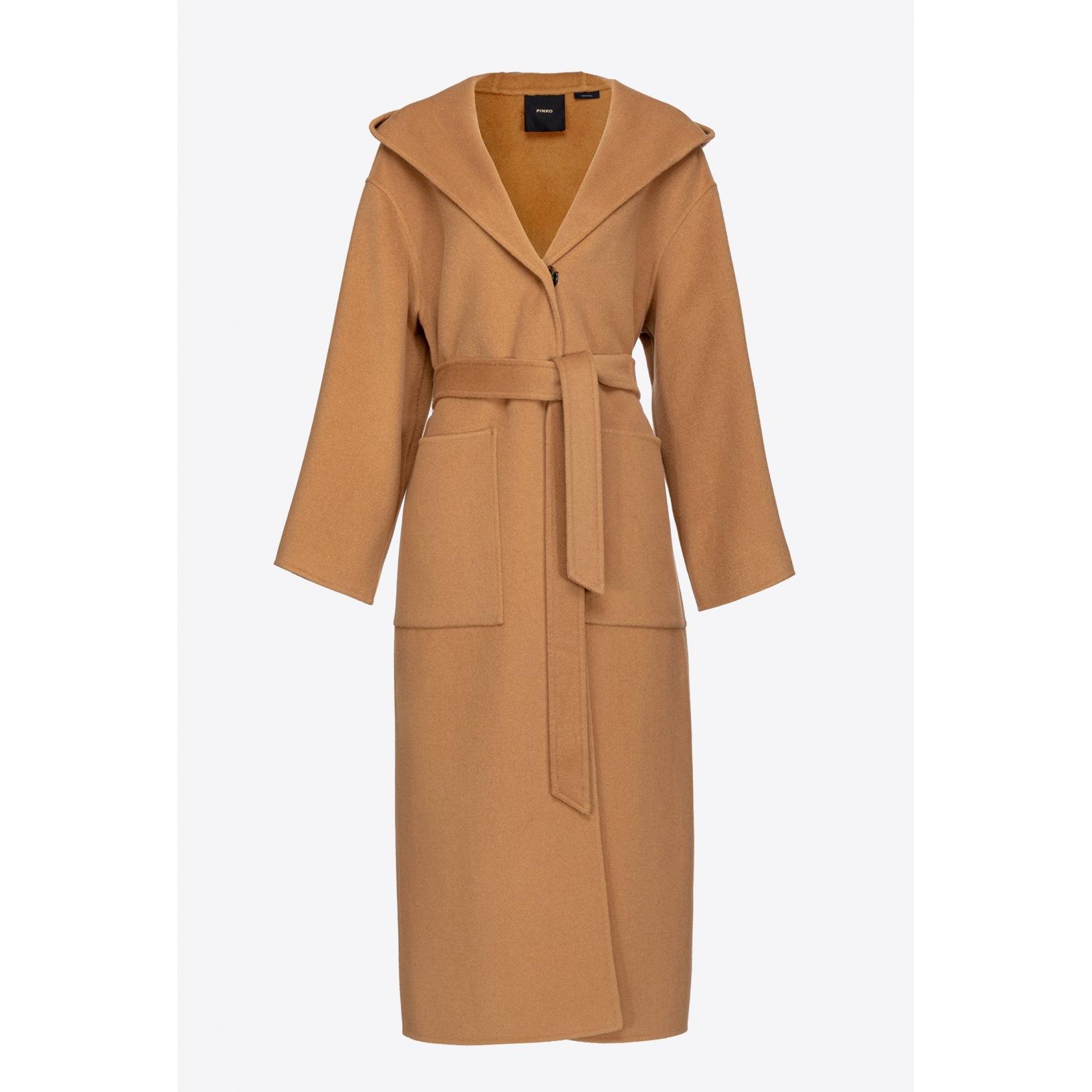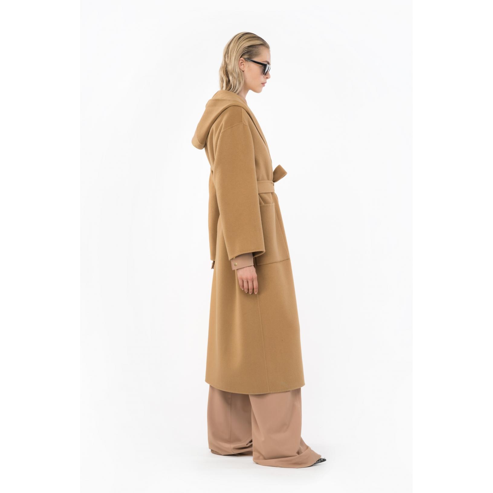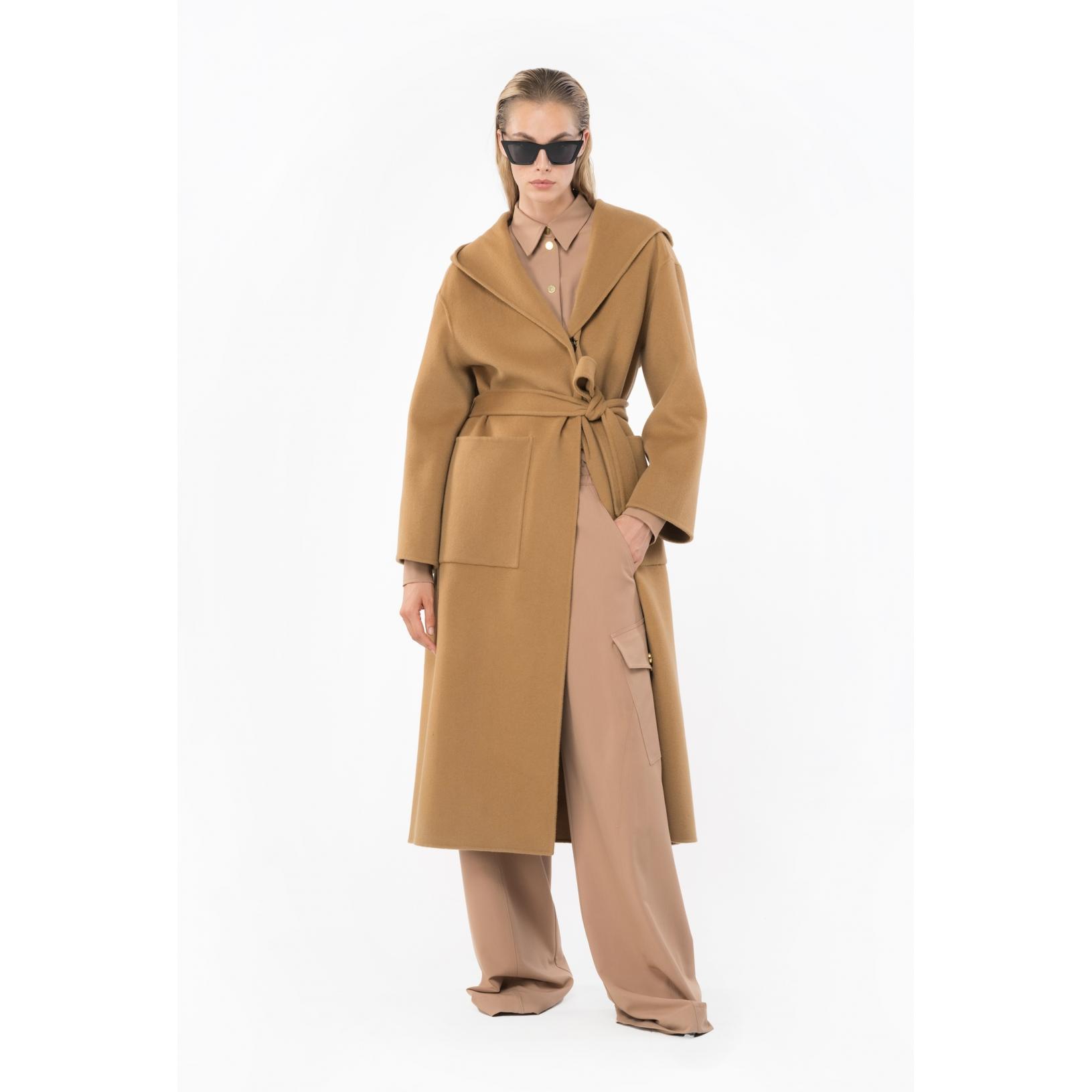 Cappotto lungo in panno double 100% lana. Collo a cappuccio, maniche lunghe a giro leggermente basso e tasche a toppa applicate davanti. Cintura abbinata nello stesso tessuto da annodare in vita.